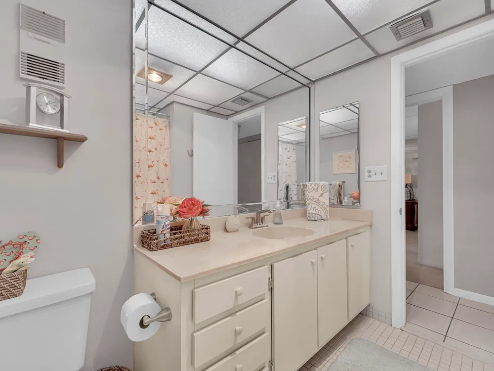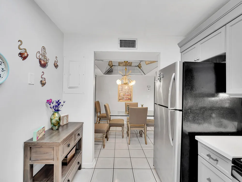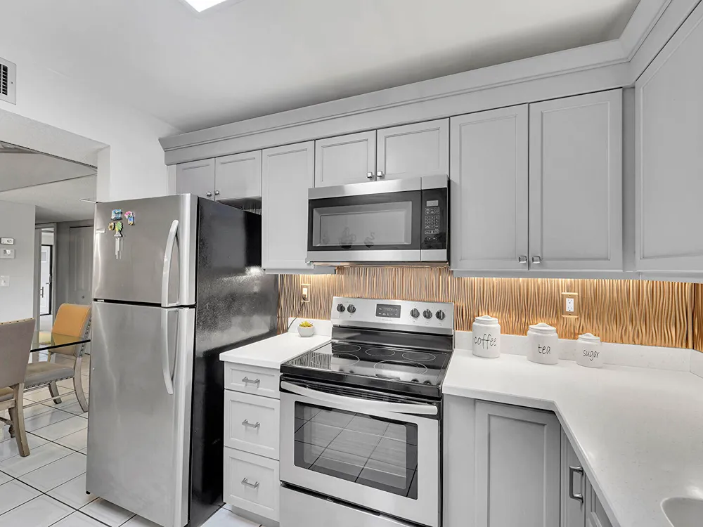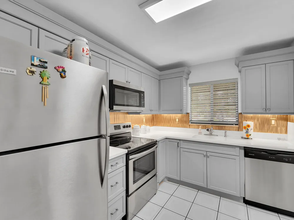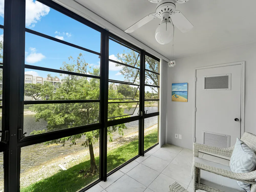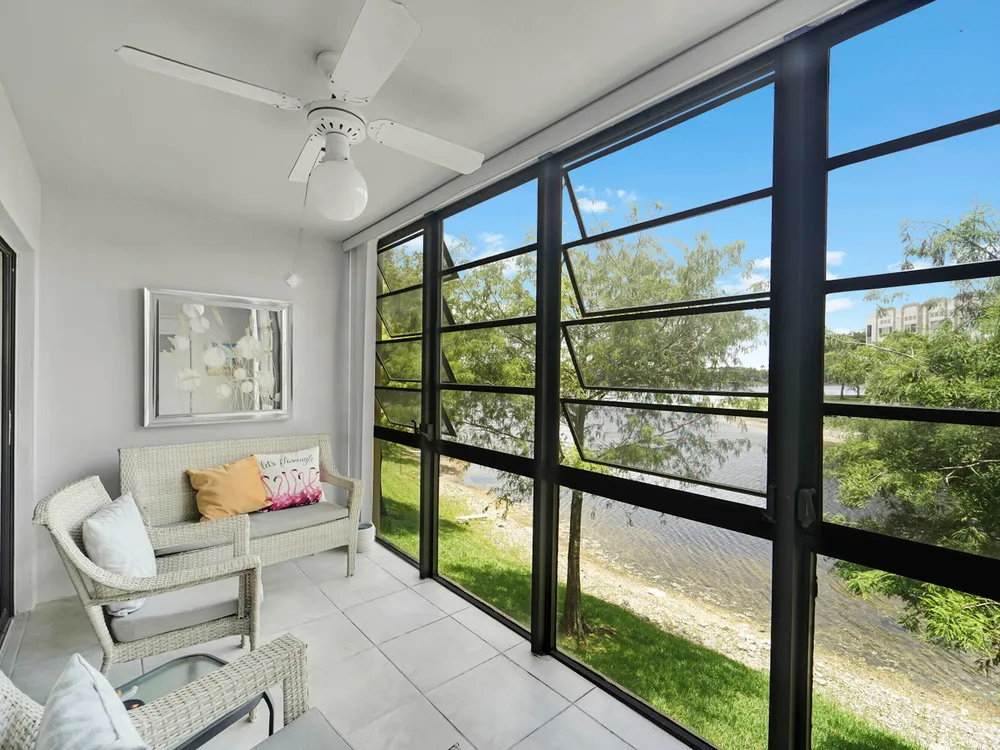 Welcome to this beautifully maintained 2BR/2BA condo in gated Ashmont at Kings Point, a highly sought 55+ community. This move-in ready home features a renovated kitchen with quartz counters, painted cabinets, stainless appliances, sleek backsplash, and pantry. Dining area is conveniently adjacent. Spacious primary suite has a walk-in shower and large closet, while the guest bath has a tub/shower combo. The second bedroom, used as an office, also has a walk-in closet. Step onto the tiled enclosed patio from either bedroom to enjoy lake views and sunsets. Patio has laundry with full-size washer and dryer. Residents enjoy Kings Point resort amenities: pools, clubhouse, fitness, theater, sauna, and more. HOA covers water, cable, internet, trash, pest control, and amenities. Electric separate