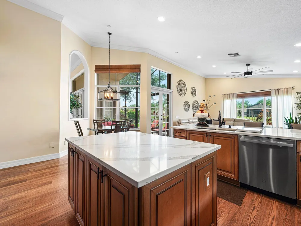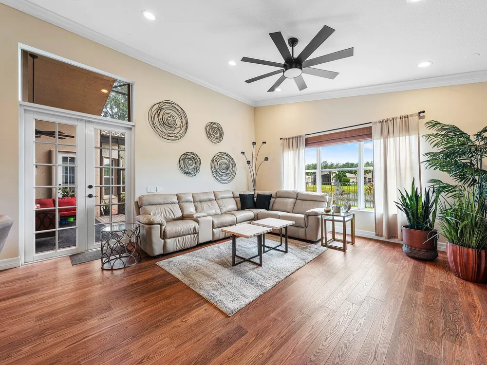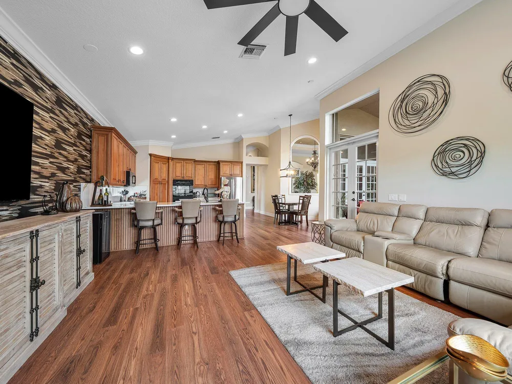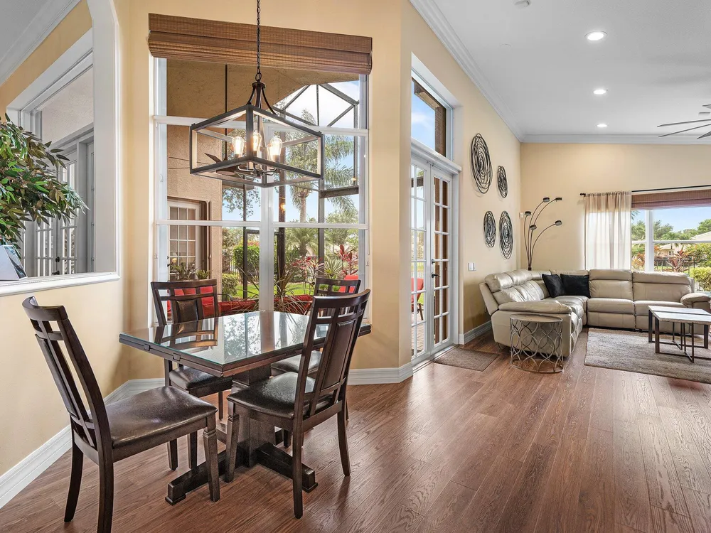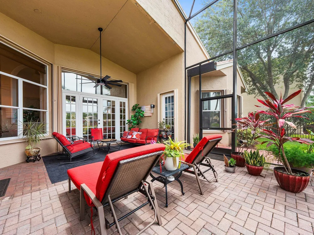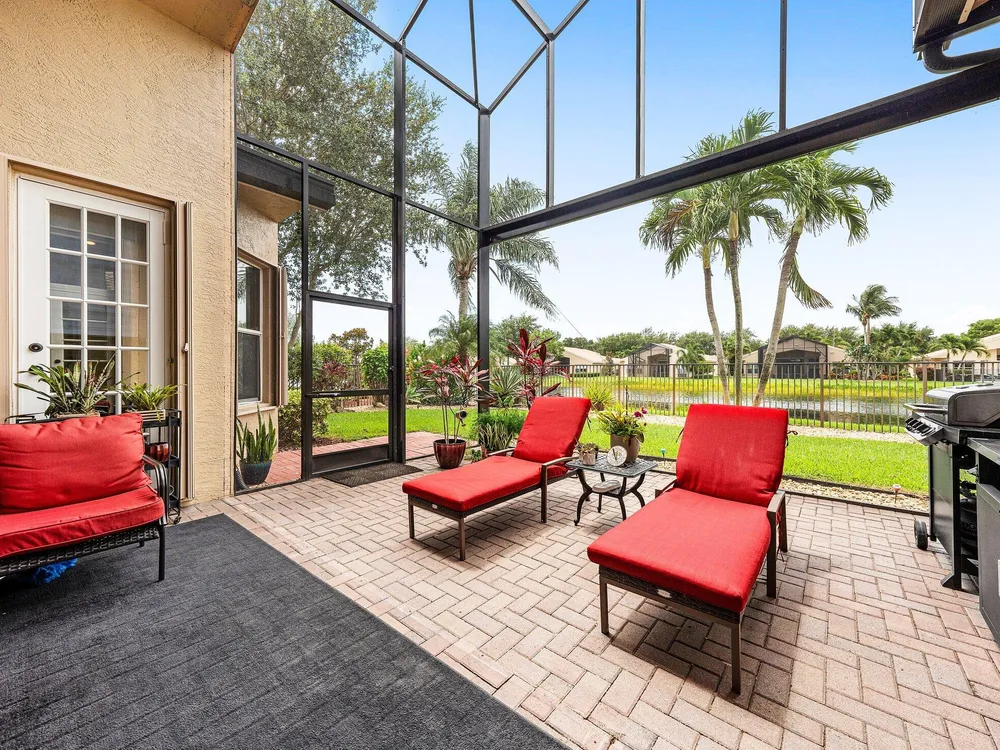 This gorgeous Madrid model features 3 bedrooms + den, 2.5 baths and beautiful lake views from the extended screen enclosed patio. Upgrade highlights include: a whole house generator, luxury vinyl planks, tons of kitchen and bath upgrades, solid core doors, central vacuum system, plantation shutters and Hunter Douglas blinds, custom closet systems, crown molding, French doors, front gutters, accordion shutters, upgraded landscaping and so much more. Please call for more details. HOA Fee includes lawn care, alarm monitoring, phone, cable and internet. Clubhouse recently renovated.