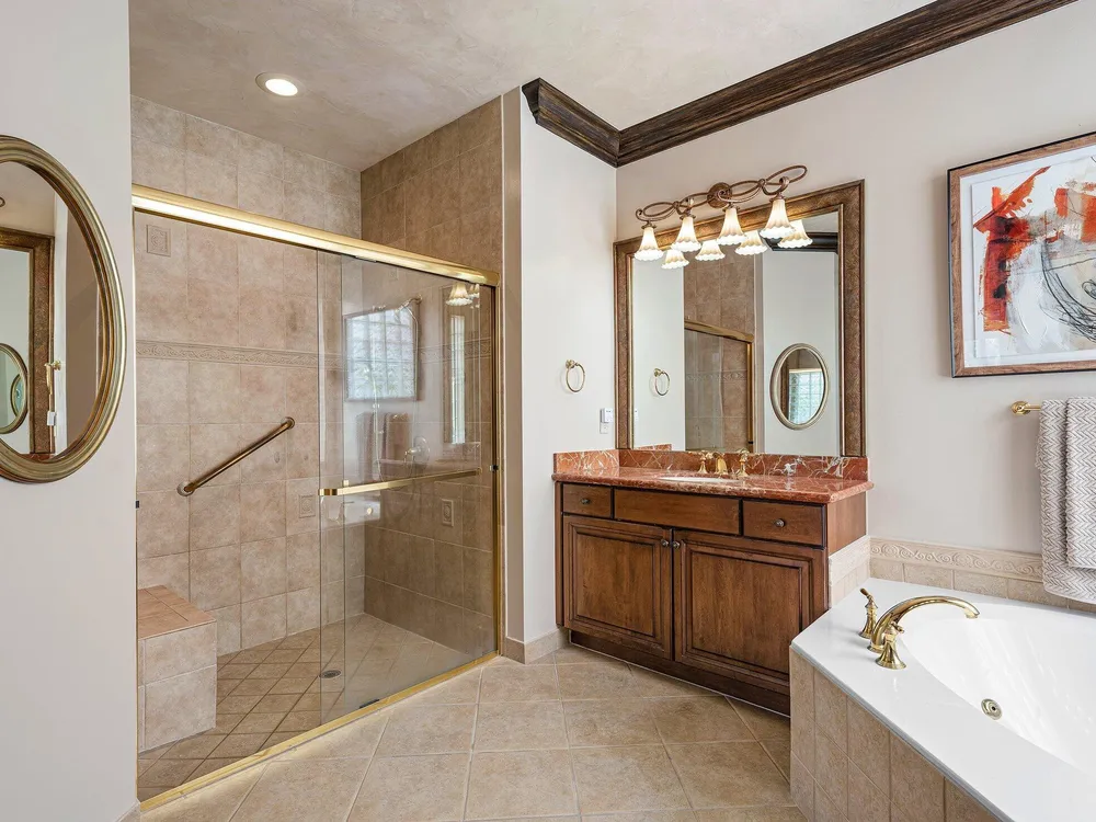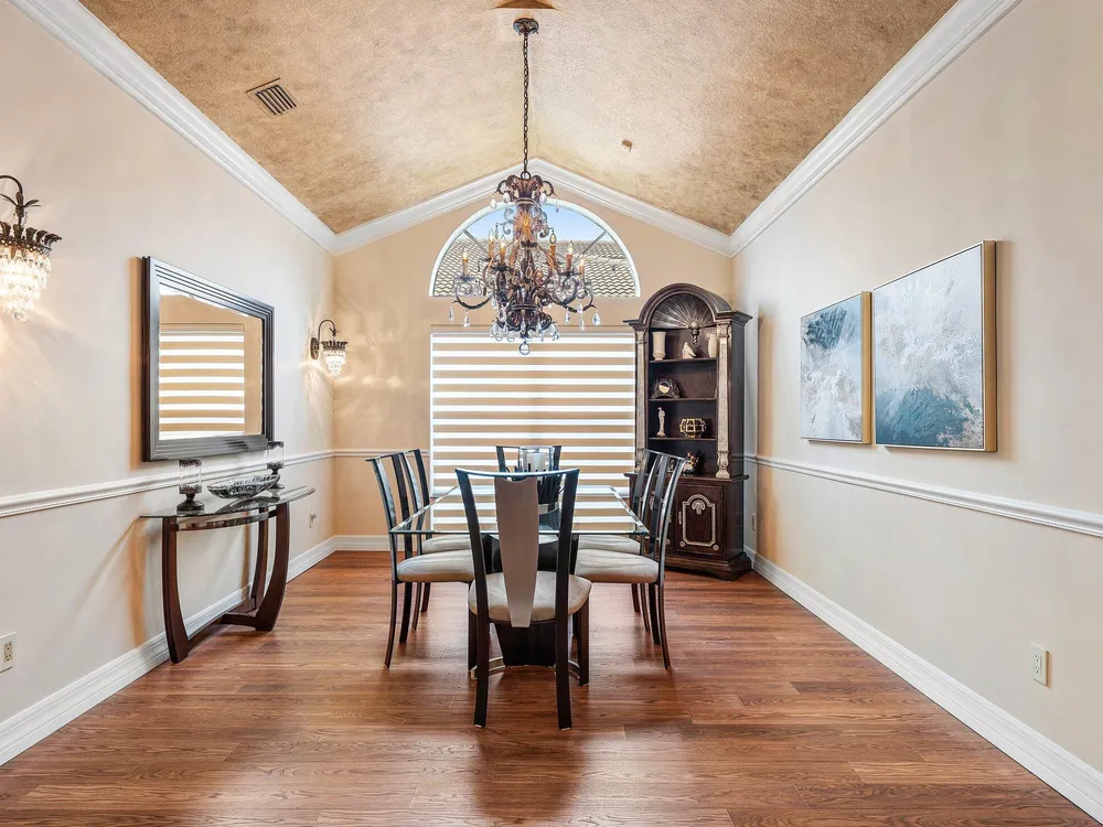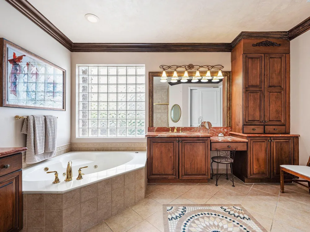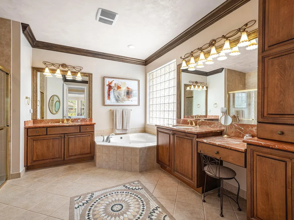 - Garden Tub/Roman Tub, Split Bedrooms, High Ceilings, Walk-In Closet(s), Family Room, Breakfast Area, Separate/Formal Dining Room, Blinds, Plantation Shutters, Dual Sinks, Primary Downstairs, Separate Shower, Bathtub, Storm Shutters