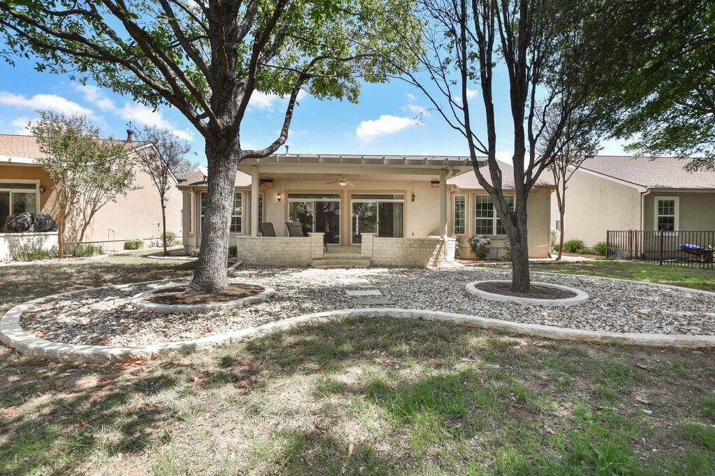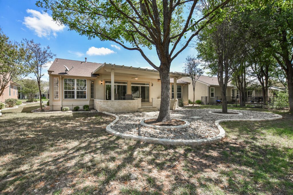 Welcome to this beautifully appointed LaSalle model in the highly sought-after Sun City Texas community. Offering exceptional design and thoughtful upgrades, this 2-bedroom, 2-bath home also features a private study, a bright four seasons room, and an extended garage. From the moment you arrive, you will be impressed by the home’s outstanding curb appeal, highlighted by a classic stucco exterior with elegant stone accents and a welcoming front porch. Inside, the open-concept floorplan is enhanced by engineered hardwood and tile flooring, crown molding, recessed lighting, and abundant natural light throughout. The spacious living area flows seamlessly into the gourmet kitchen, which features granite countertops, maple cabinetry, a center island, and quality built-in stainless steel appliances, including a gas cooktop. A charming bay-windowed breakfast area fills the space with natural light and connects effortlessly to the four seasons room, creating a versatile flex space perfect for relaxing or entertaining. The primary suite offers a peaceful retreat with an updated en-suite bath, complete with dual vanities, upgraded countertops, a large walk-in shower, and an oversized closet. Two privately situated guest bedrooms and a dedicated study/office provide flexibility for guests and work-from-home needs. Step outside to enjoy the extended covered patio with stone accents, overlooking a beautifully landscaped backyard with lush greenery and mature trees—ideal for outdoor living and relaxation. Residents of Sun City Texas enjoy access to world-class amenities, including state-of-the-art fitness centers, resort-style pools, golf courses, pickleball and tennis courts, and a vibrant, active lifestyle community. This home truly combines comfort, style, and resort living—don’t miss your opportunity to make it yours.
