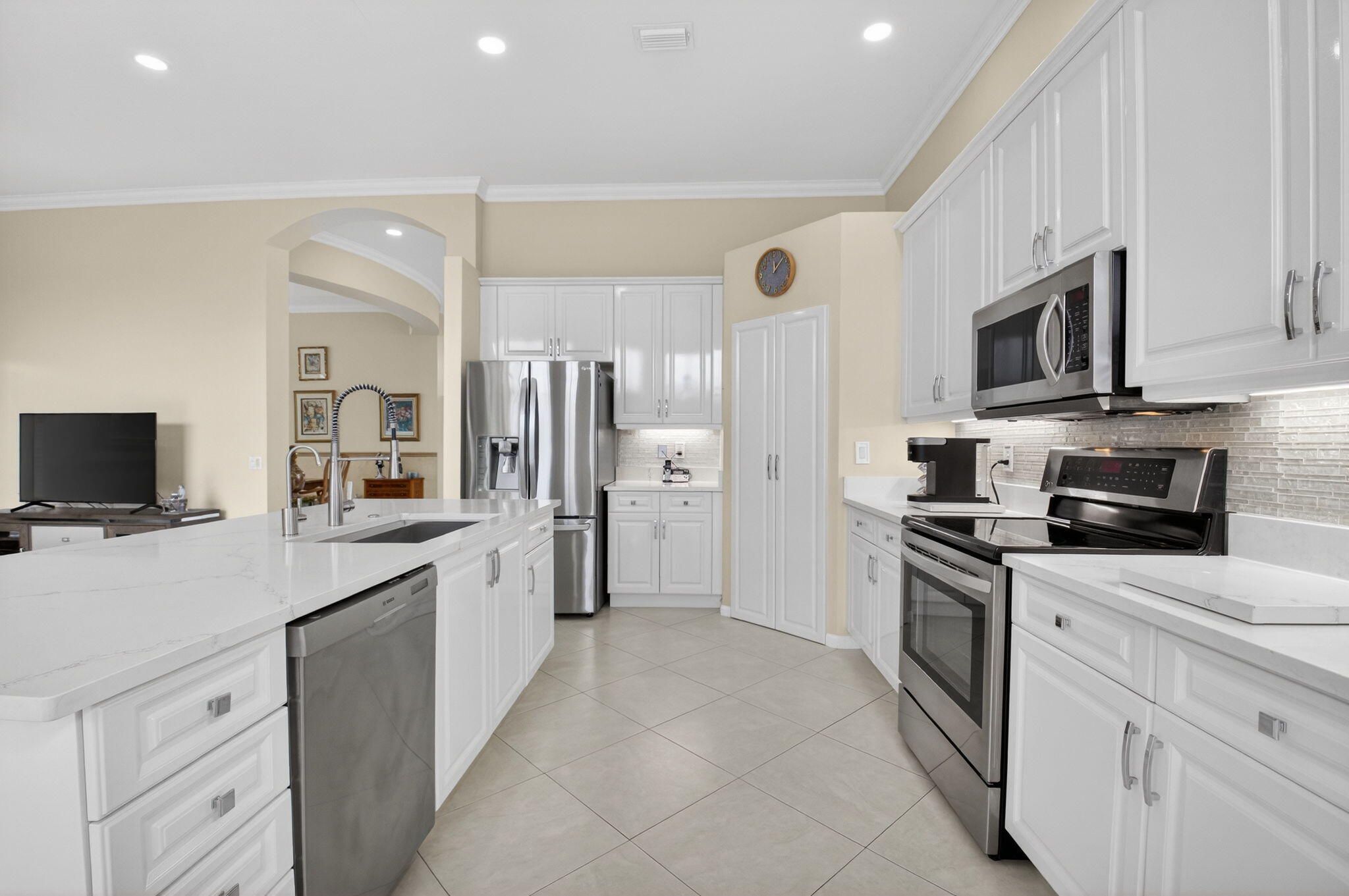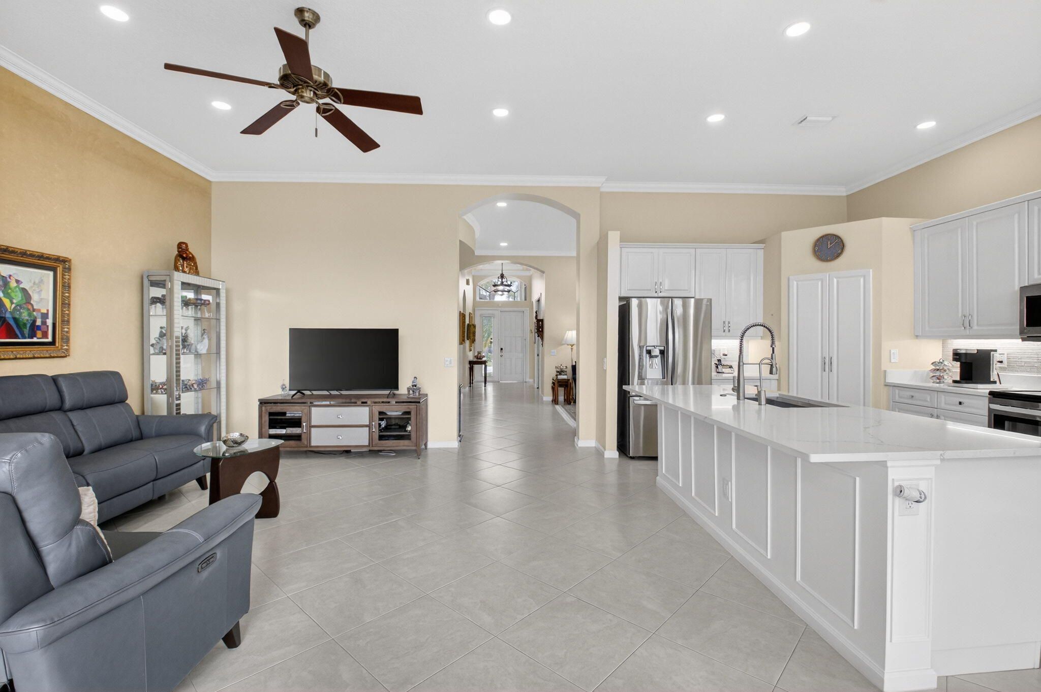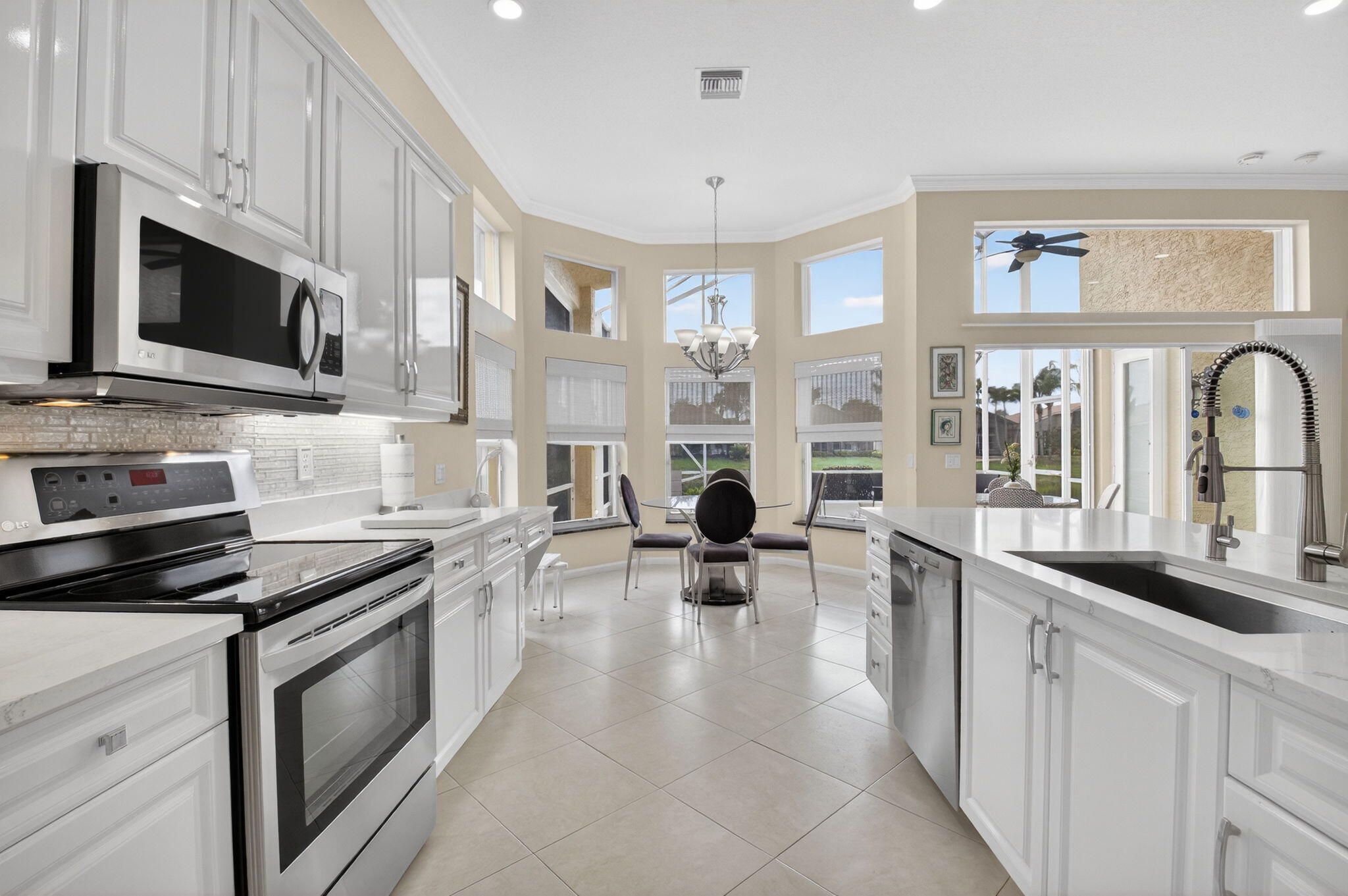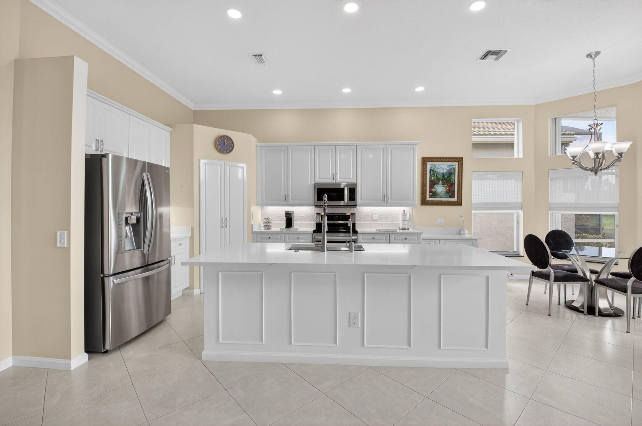 COME SEE THIS LOVELY CARIBBEAN MODEL ON THE WATER W/ A SPECTACULAR UPDATED KITCHEN. ENTER THE FOYER WITH DOUBLE TRAY CEILINGS AND IMMEDIATE VIEWS OF THE LAKE. THE DINING ROOM HAS BEAUTIFUL ARCHITECTURAL DETAIL IN THE CEILINGS ALSO. THE UPDATED KITCHEN HAS WHITE CABINETS W/ UNDER MOUNT LIGHTING, BOX MOLDING ON THE ISLAND, QUARTZ COUNTERTOPS, GLASS TILE BACKSPLASH, STAINLESS STEEL APPLIANCES & A BREAKFAST NOOK THAT OVERLOOKS THE LAKE. FAMILY ROOM HAS CROWN MOLDING, TELESCOPIC SLIDING DOORS & TRANSOM WINDOWS. PRIMARY BEDROOM W/ TRAY CEILING ALSO OVERLOOKS THE LAKE. THIRD BEDROOM USED AS OFFICE. SPACIOUS LAUNDY ROOM. POWDER ROOM HAS A LOVELY TRENDY VANITY. TOUR THE NEWER RENOVATED & EXPANDED CLUBHOUSE & NEWER PICKLE BALL COURTS. ALL MEASUREMENTS DEEMED ACCURATE & SHOULD BE VERIFIED .
