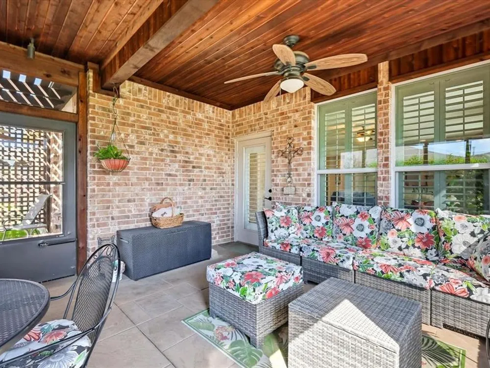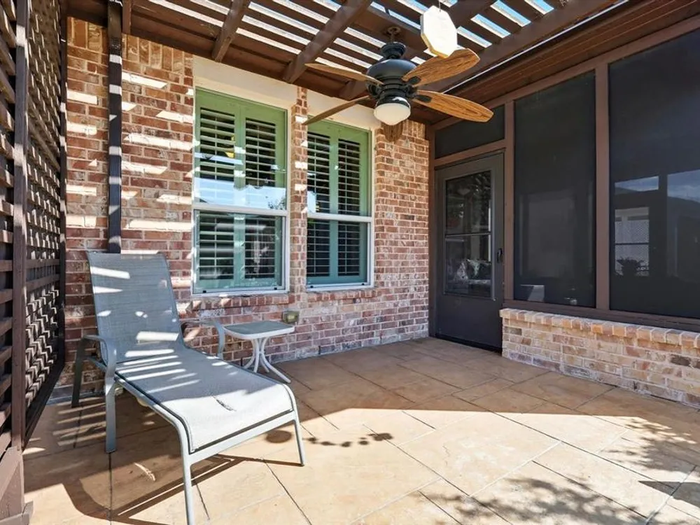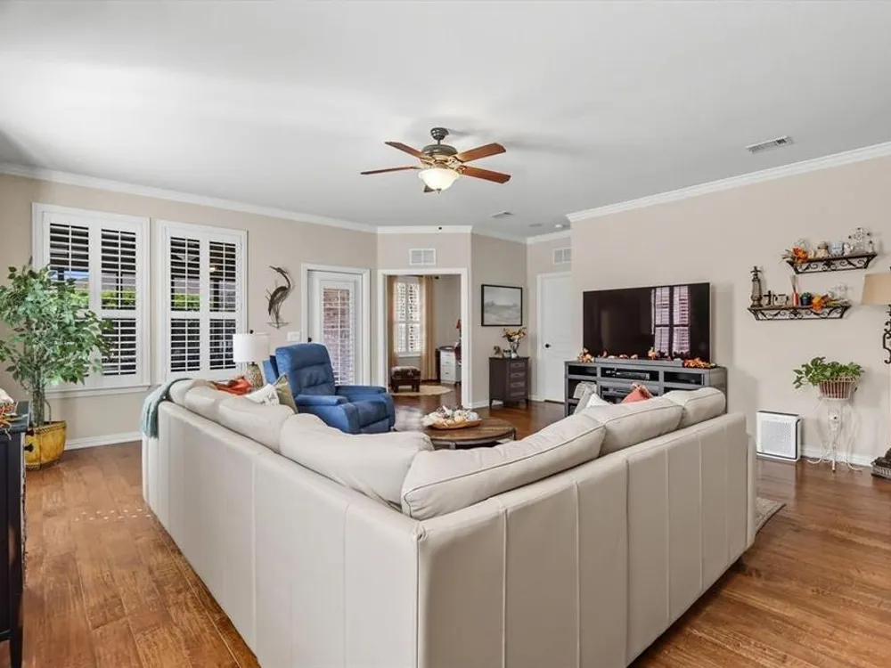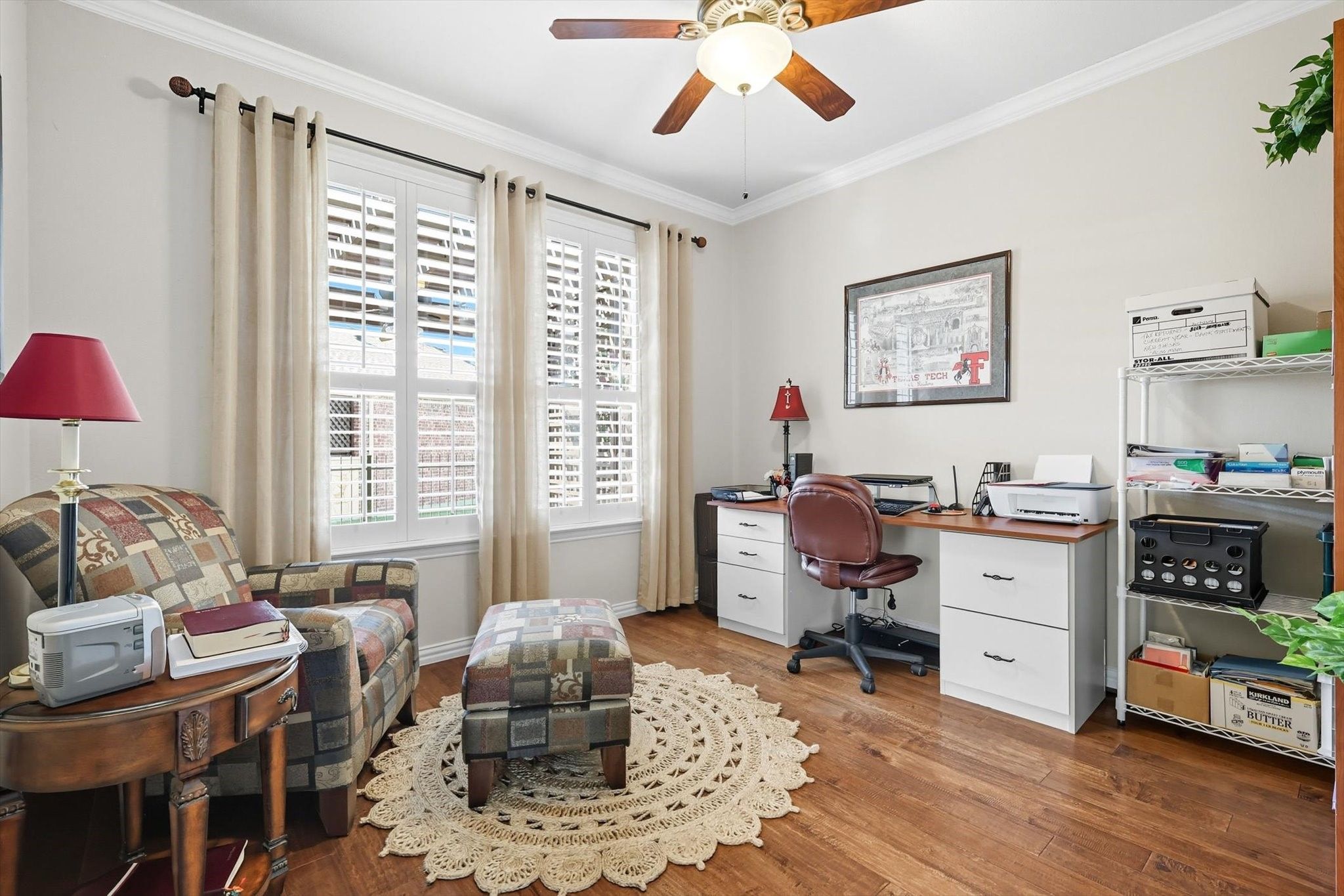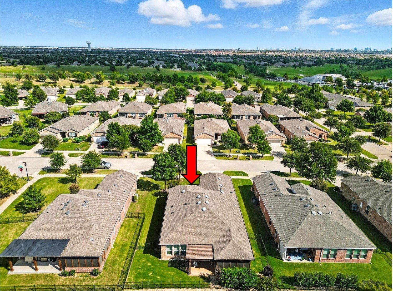 Stunning Surrey Crest Model located in the 55+ community of Frisco Lakes tailored for the active adult lifestyle! This meticulously maintained property embodies modern living with a lock and leave convenience allowing you to enjoy every moment worry free. Discover an inviting open floor plan featuring easy to maintain hand scraped hardwood floors in the Living Room and Office. Light tile floors are located in all other areas. Enjoy the large screened in patio with 2 ceiling fans and pull down sunshades. An external antenna is mounted on the outside screen. Primary Suite has a walk in closet and ensuite bathroom separated from the guest bedroom and bath for privacy. Living Room has crown molding, neutral colors, ceiling fan and Plantation Shutters. Gourmet Kitchen has a kitchen island and breakfast bar, stainless appliances, gas cooktop, electric oven, microwave, granite counters, 12-in tile backsplash and recessed lighting. This home is Energy Star Certified and has a radiant barrier and Plantation Shutters throughout. Enjoy Frisco Lakes 18-hole championship golf course, 3 clubhouses, 3 fitness centers, indoor & outdoor pools & spas, pickleball, tennis courts & walking trails.