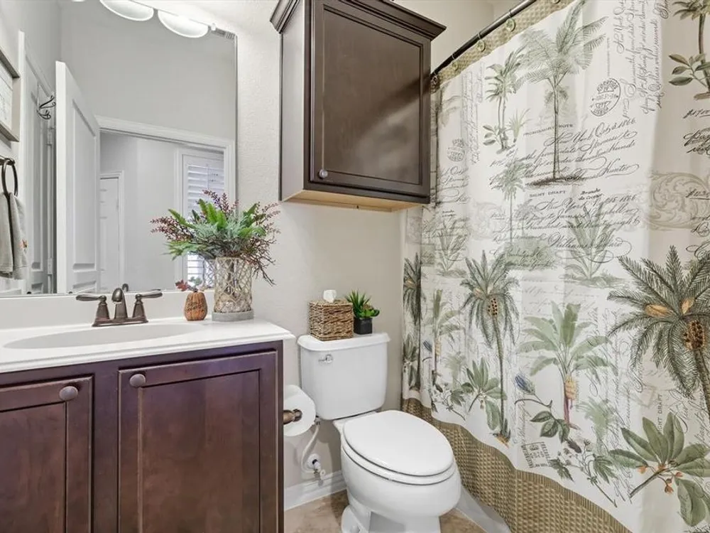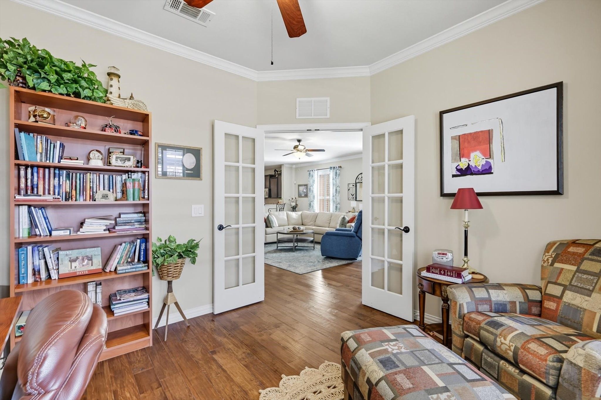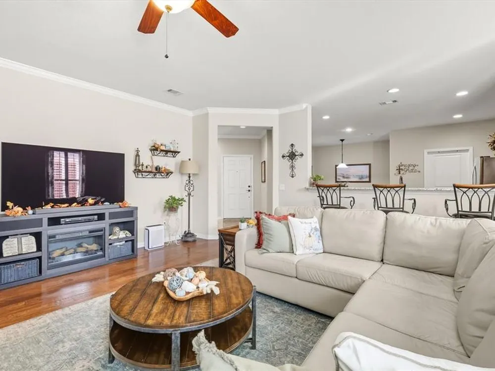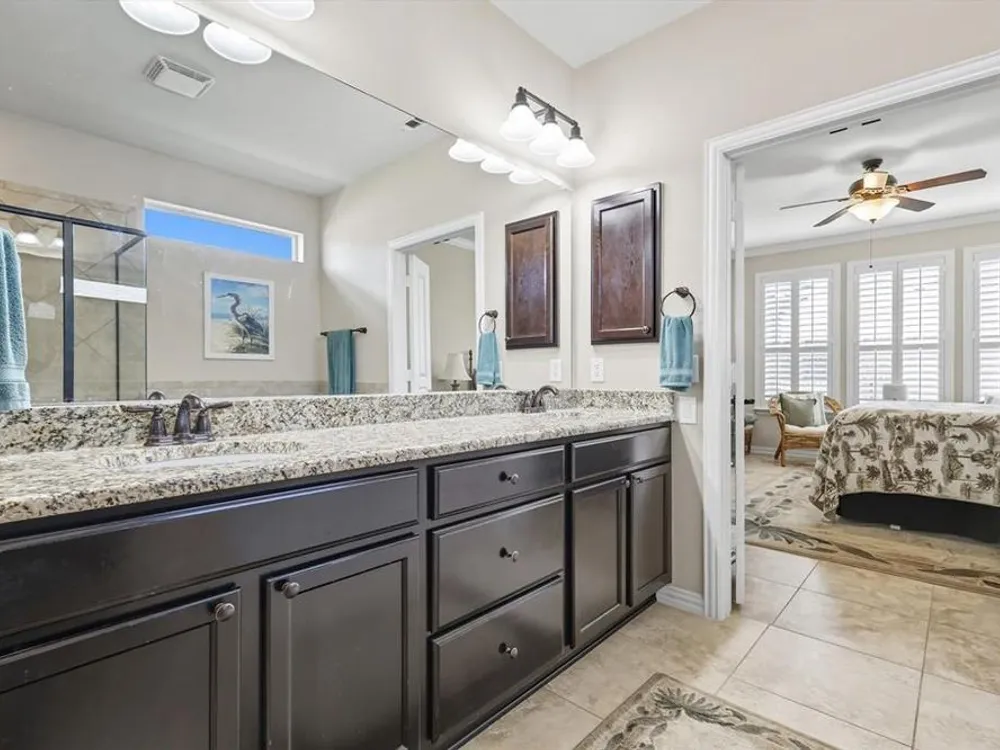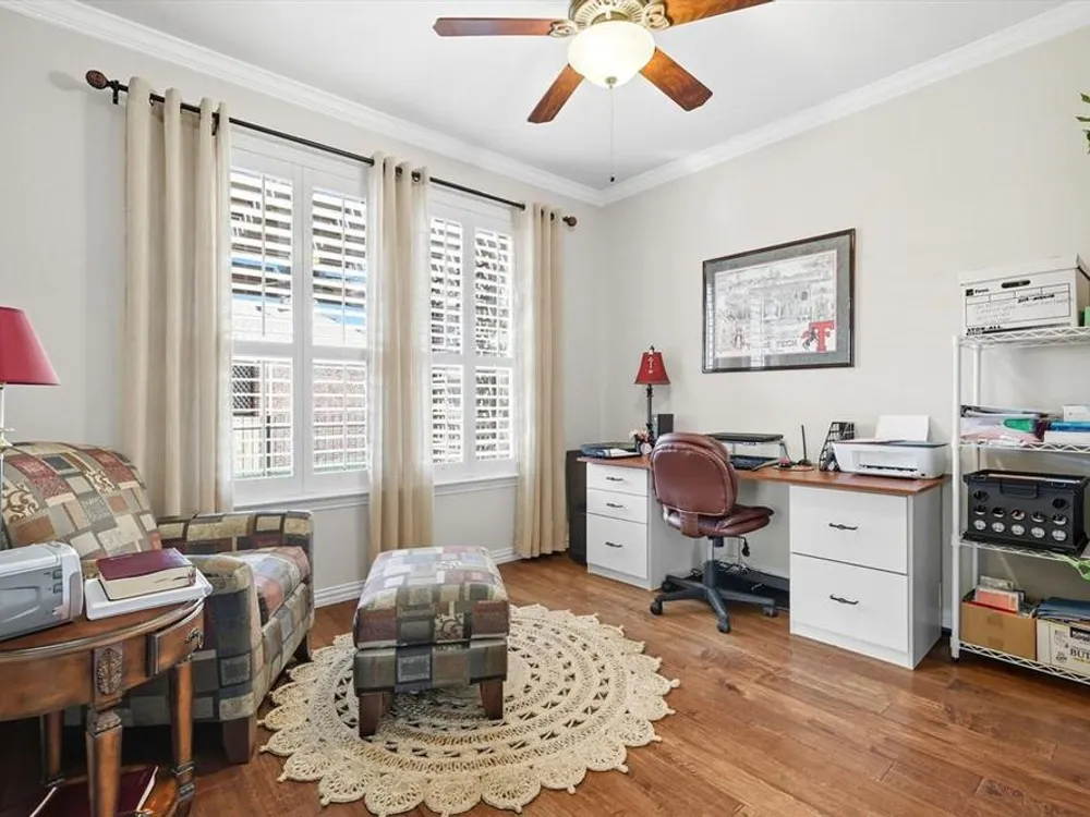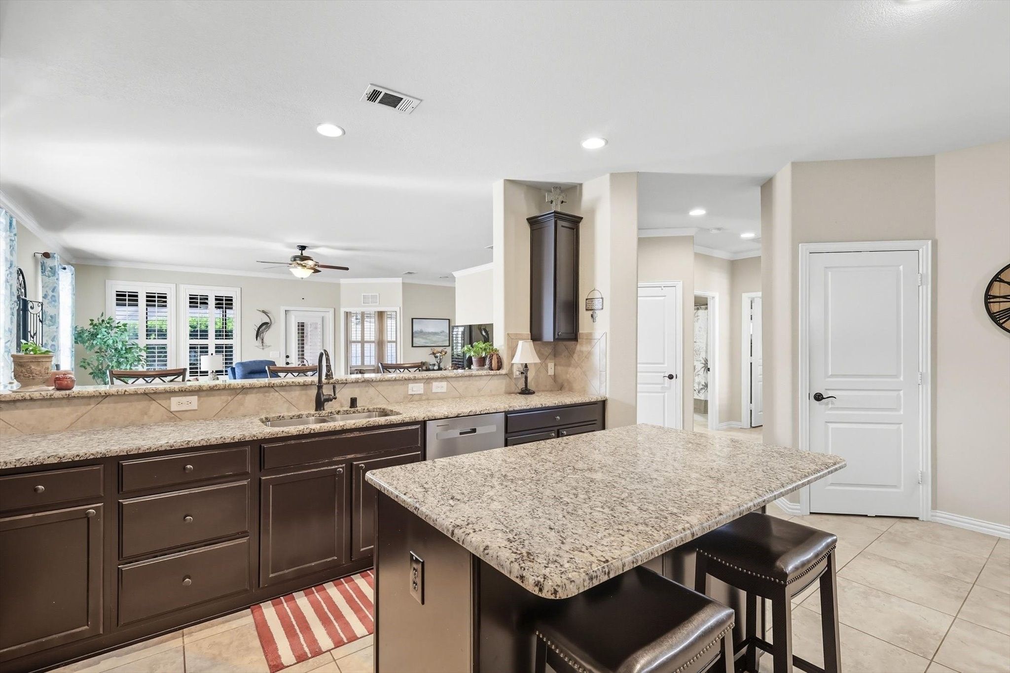 Stunning Surrey Crest Model located in the 55+ community of Frisco Lakes tailored for the active adult lifestyle! This meticulously maintained property embodies modern living with a lock and leave convenience allowing you to enjoy every moment worry free. Discover an inviting open floor plan featuring easy to maintain hand scraped hardwood floors in the Living Room and Office. Light tile floors are located in all other areas. Enjoy the large screened in patio with 2 ceiling fans and pull down sunshades. An external antenna is mounted on the outside screen. Primary Suite has a walk in closet and ensuite bathroom separated from the guest bedroom and bath for privacy. Living Room has crown molding, neutral colors, ceiling fan and Plantation Shutters. Gourmet Kitchen has a kitchen island and breakfast bar, stainless appliances, gas cooktop, electric oven, microwave, granite counters, 12-in tile backsplash and recessed lighting. This home is Energy Star Certified and has a radiant barrier and Plantation Shutters throughout. Enjoy Frisco Lakes 18-hole championship golf course, 3 clubhouses, 3 fitness centers, indoor & outdoor pools & spas, pickleball, tennis courts & walking trails.