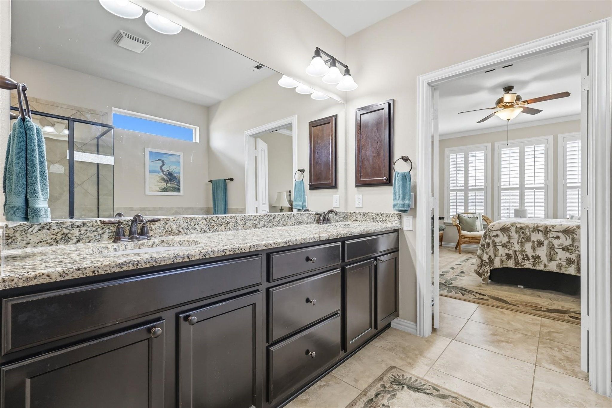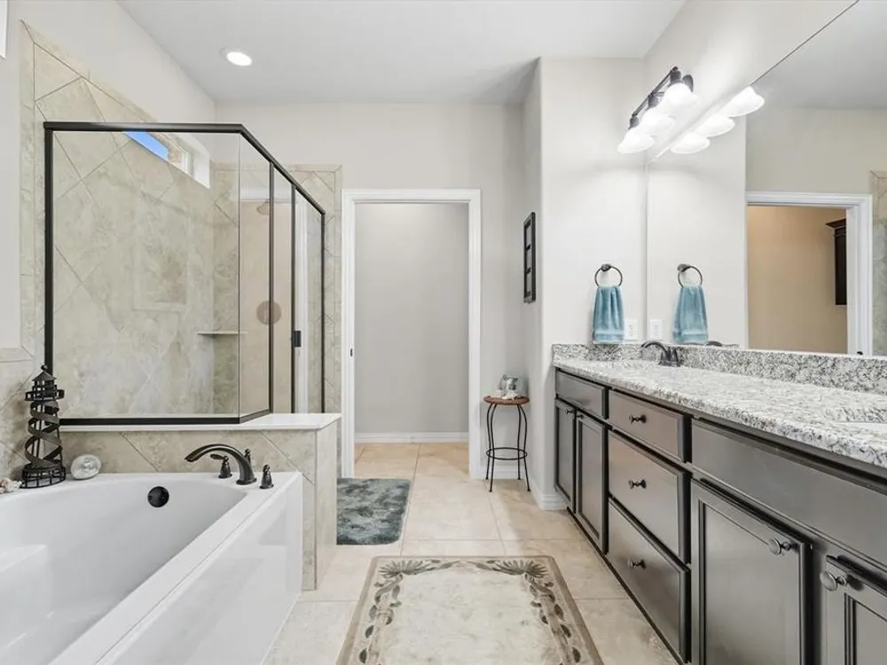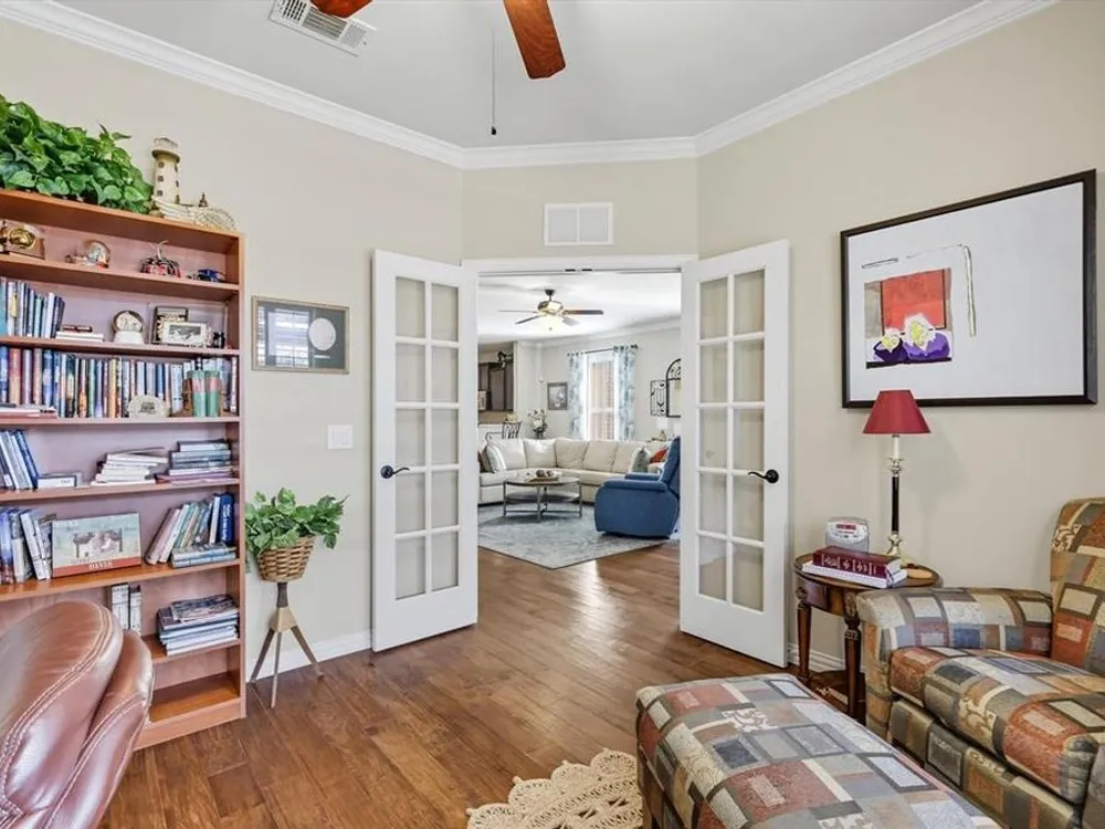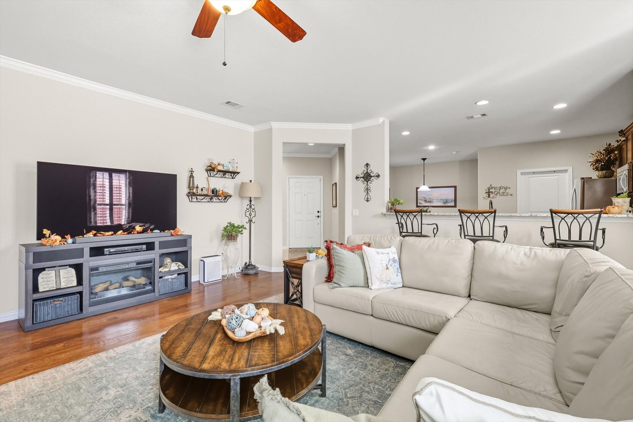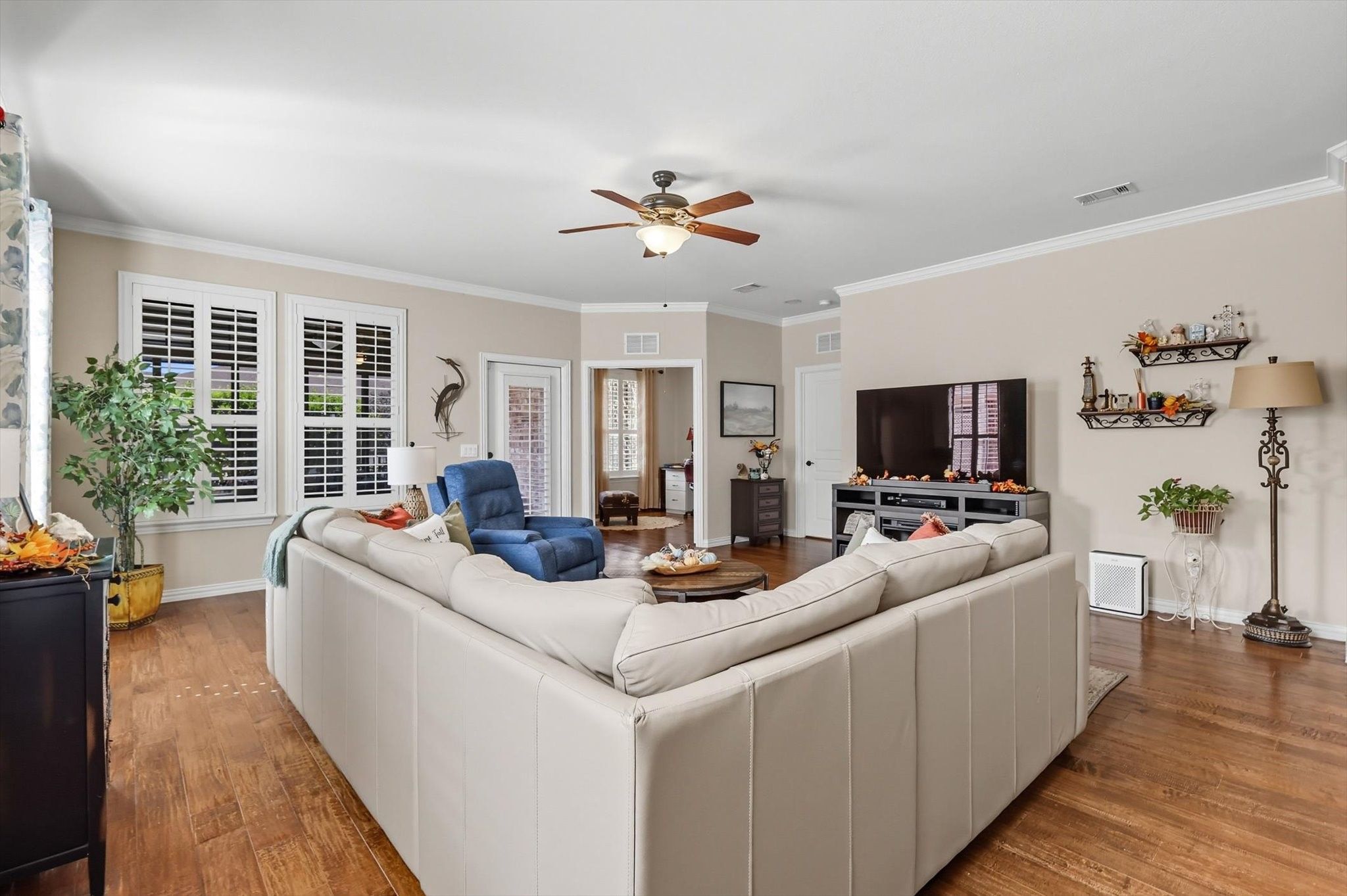 Stunning Surrey Crest Model located in the 55+ community of Frisco Lakes tailored for the active adult lifestyle! This meticulously maintained property embodies modern living with a lock and leave convenience allowing you to enjoy every moment worry free. Discover an inviting open floor plan featuring easy to maintain hand scraped hardwood floors in the Living Room and Office. Light tile floors are located in all other areas. Enjoy the large screened in patio with 2 ceiling fans and pull down sunshades. An external antenna is mounted on the outside screen. Primary Suite has a walk in closet and ensuite bathroom separated from the guest bedroom and bath for privacy. Living Room has crown molding, neutral colors, ceiling fan and Plantation Shutters. Gourmet Kitchen has a kitchen island and breakfast bar, stainless appliances, gas cooktop, electric oven, microwave, granite counters, 12-in tile backsplash and recessed lighting. This home is Energy Star Certified and has a radiant barrier and Plantation Shutters throughout. Enjoy Frisco Lakes 18-hole championship golf course, 3 clubhouses, 3 fitness centers, indoor & outdoor pools & spas, pickleball, tennis courts & walking trails.