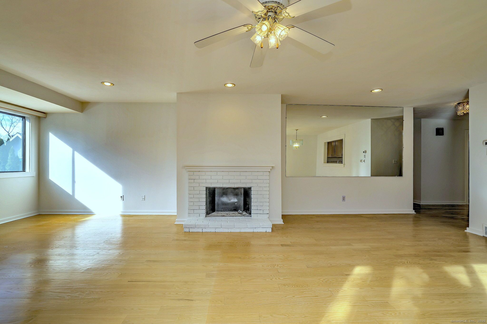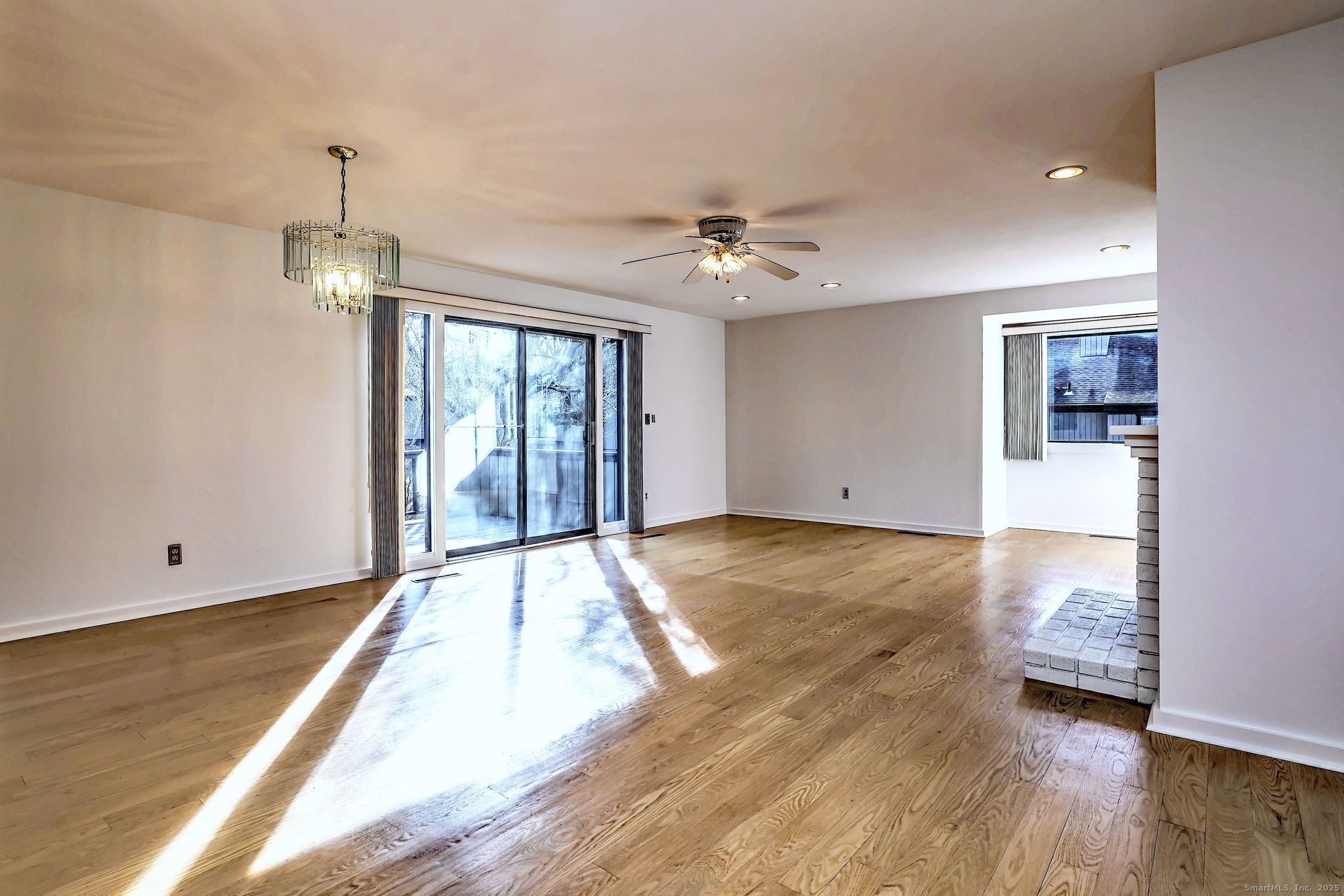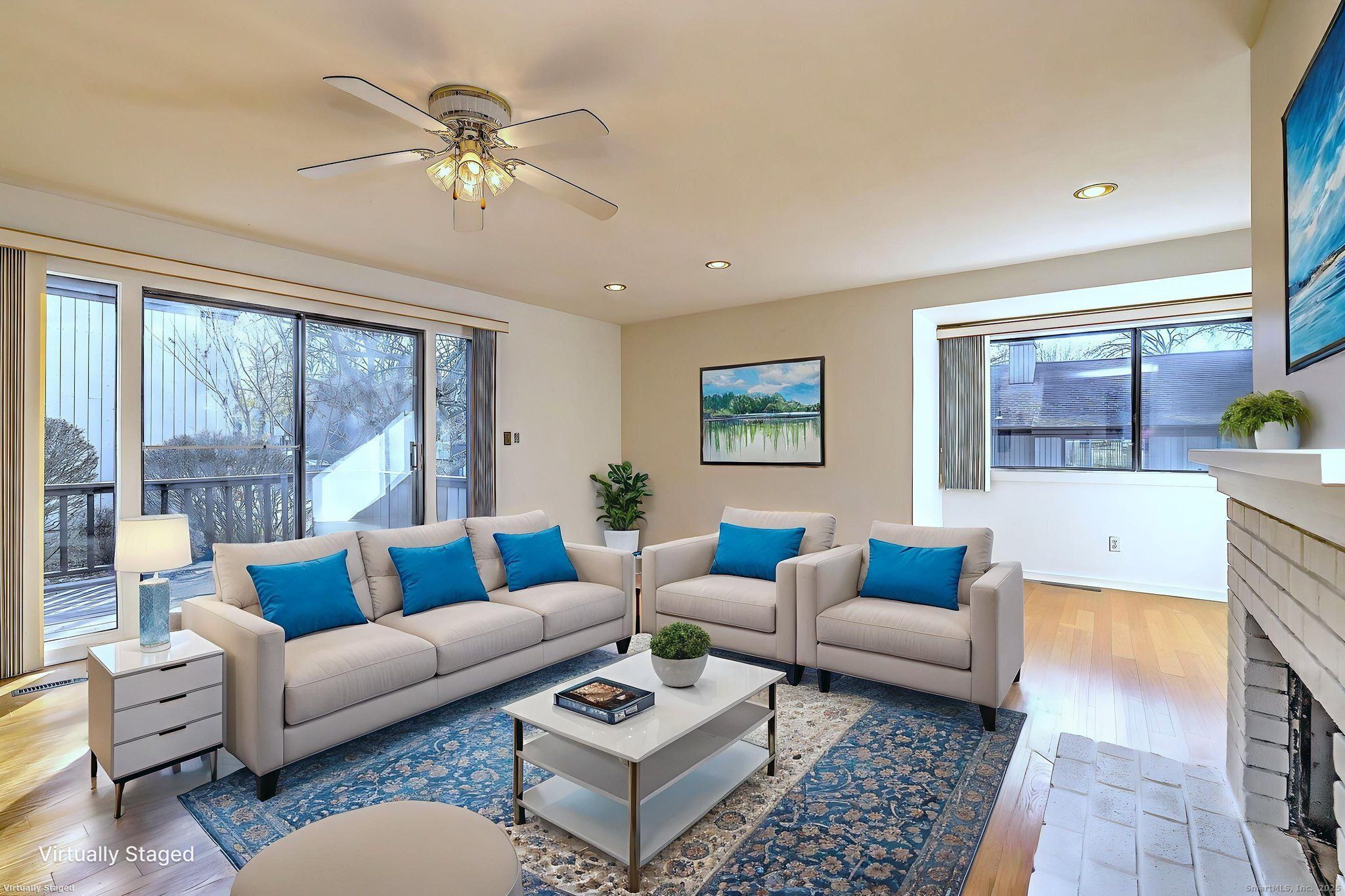 Highly sought-after Thoreau model in Oronoque Village, ideally located for privacy and convenience. The spacious living room features a mirrored wall that enhances depth and natural light, complemented by a glass sliding door leading to a beautiful deck and a large window that adds to the inviting ambiance. A cozy fireplace completes the space. The eat-in kitchen boasts Corian countertops, a deep stainless steel sink, tiled backsplash, and ceiling-height cabinetry for ample storage. A large double window offers serene views of the private yard. The dining room includes a chandelier and a convenient pass-through to the kitchen, perfect for buffet-style entertaining while maintaining separation from the cooking area. The full bath includes a walk-in shower for easy access. The versatile den can be converted into a second bedroom with the addition of closet doors or used as a home office. Gleaming hardwood floors run throughout the kitchen, den, living room, and dining room. The generous primary bedroom features wall-to-wall carpeting, two closets, a linen closet, and an updated en-suite bath. The lower-level family room offers a welcoming retreat with, faux stone accents, wall-to-wall carpeting, and a separate entrance. A full bath and kitchenette area make it ideal for use as an in-law suite. Unit also has a stone patio, handicap-accessible. Unit has been completely painted week of 11/17/2025 and professionally cleaned. Unit is immaculate. Move in fee of 3.50 percent of HOA common charges paid by buyer at closing $1,946 to the Oronoque Association.