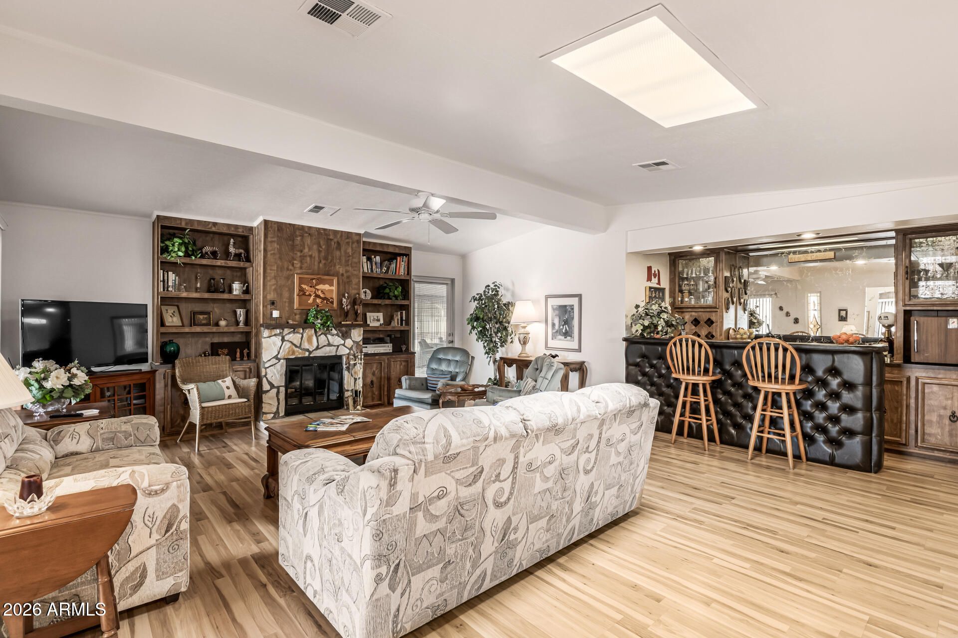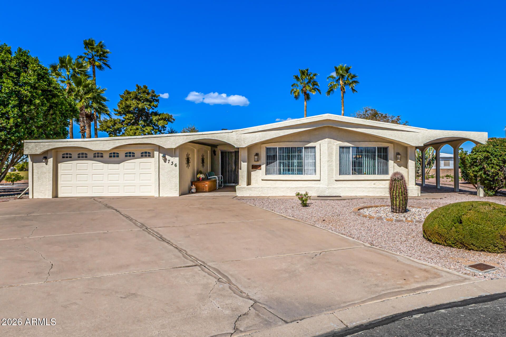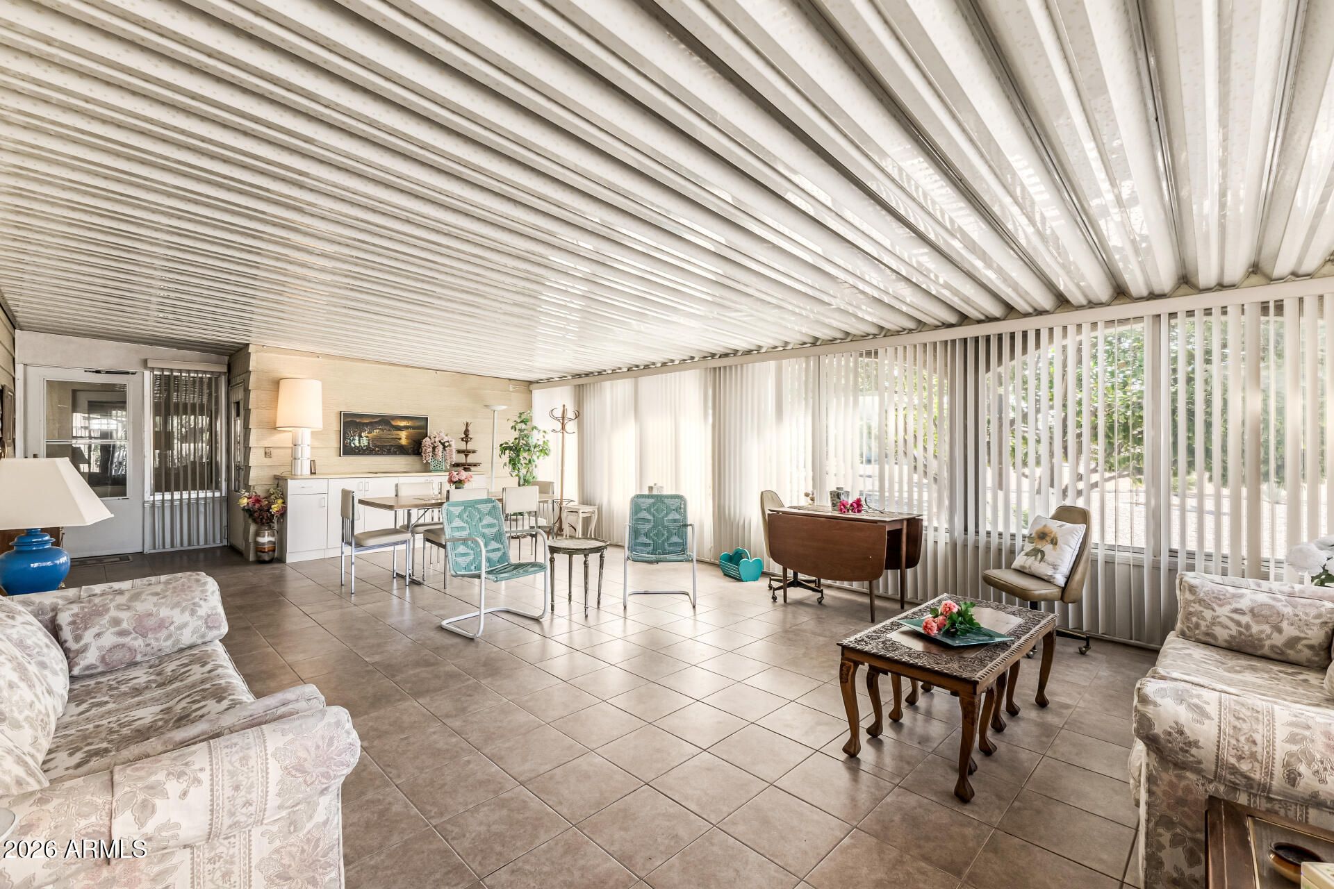 Spacious and lovely Golf Course Home, 2 bedrooms, 2 bathrooms, 2 car garage, workshop, 600 sf tiled Arizona Room, Living Room, Formal Dining Room, Family Room with stone fireplace. One of the largest lots in Fountain of the Sun, with a back patio overlooking the golf course and shady breezeway in the front. If you want space for entertaining, friends and family, this is the one you want to see.