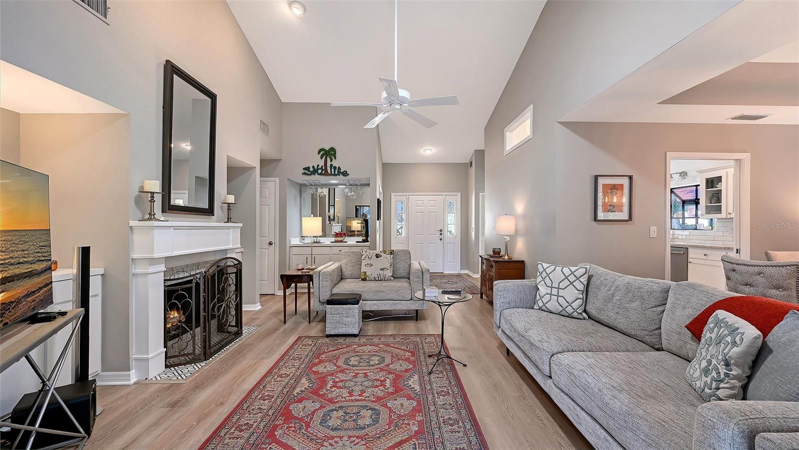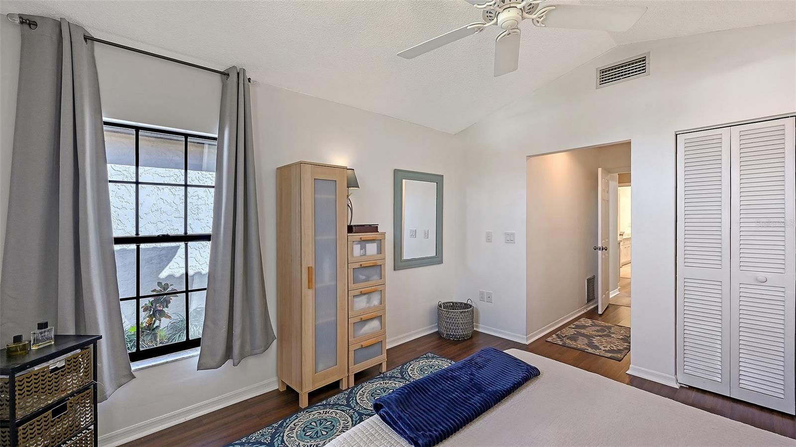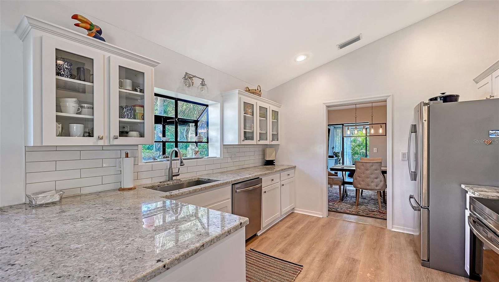 - Built-in Features, Cathedral Ceiling(s), Ceiling Fan(s), Dry Bar, Eat-in Kitchen, Main Level Primary, Stone Counters, Walk-In Closet(s), Window Treatments