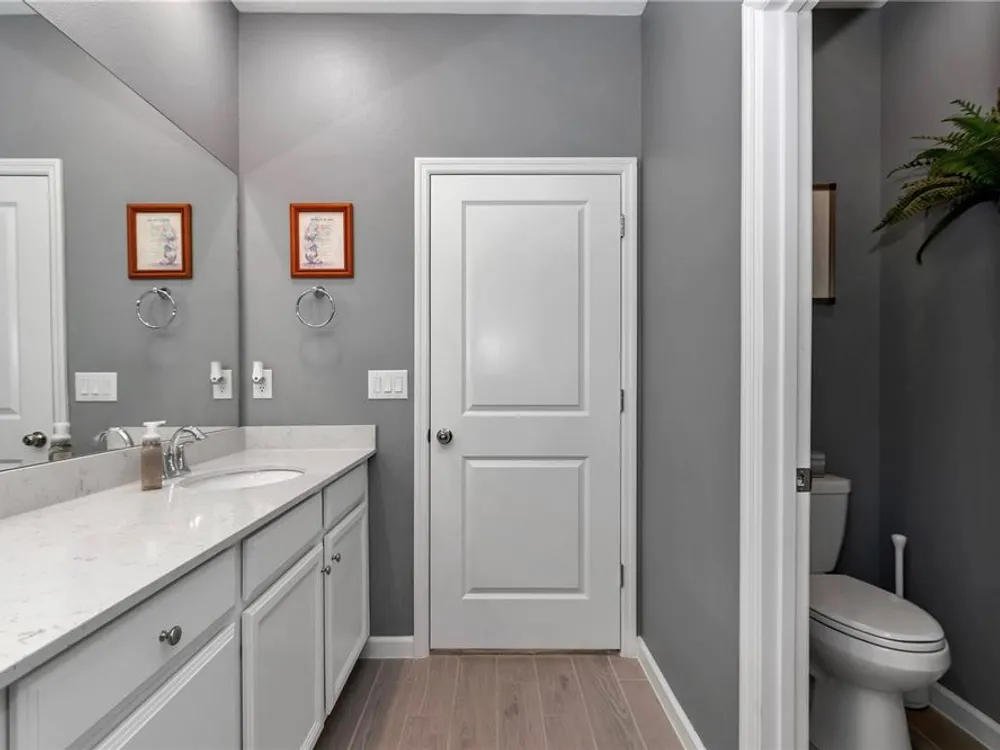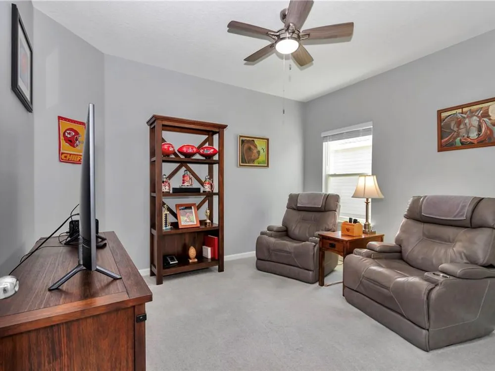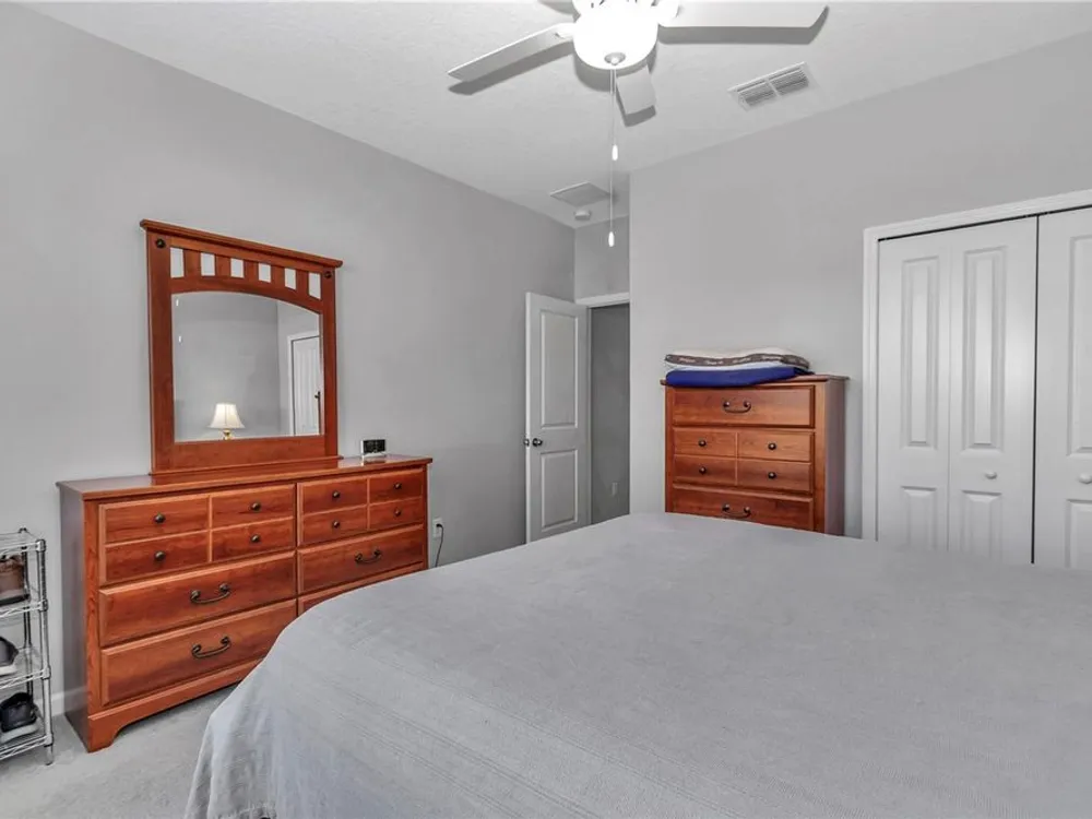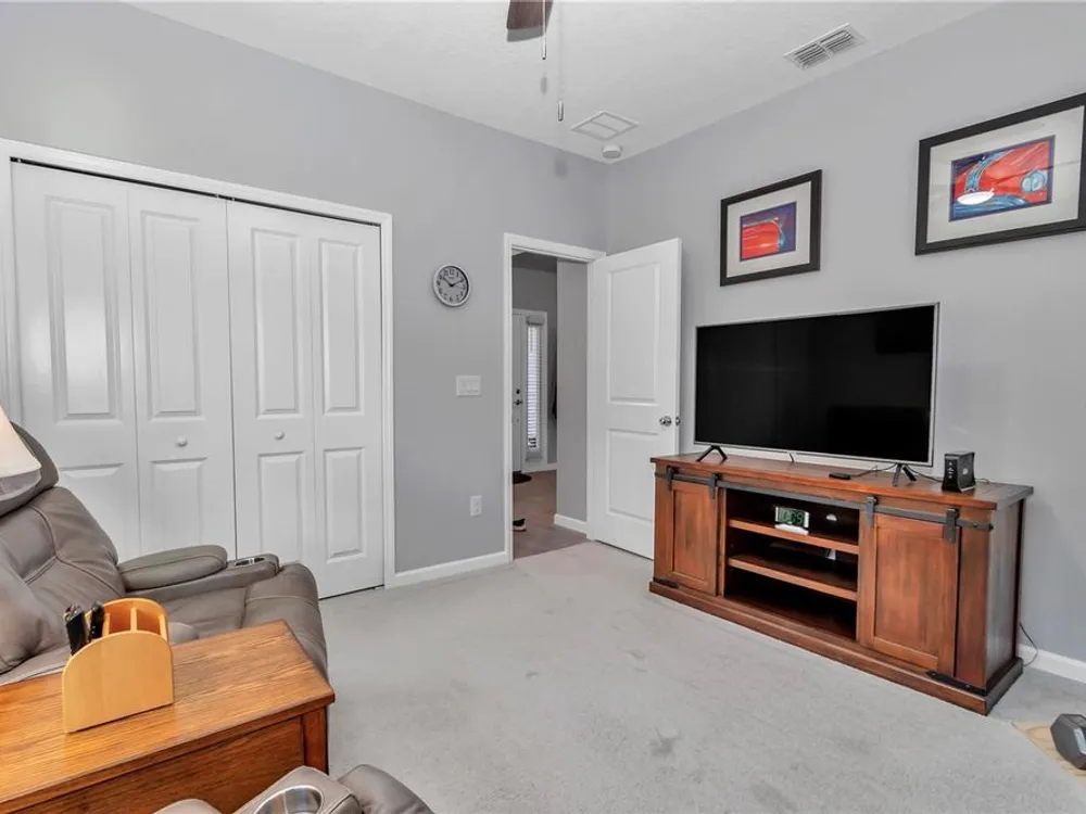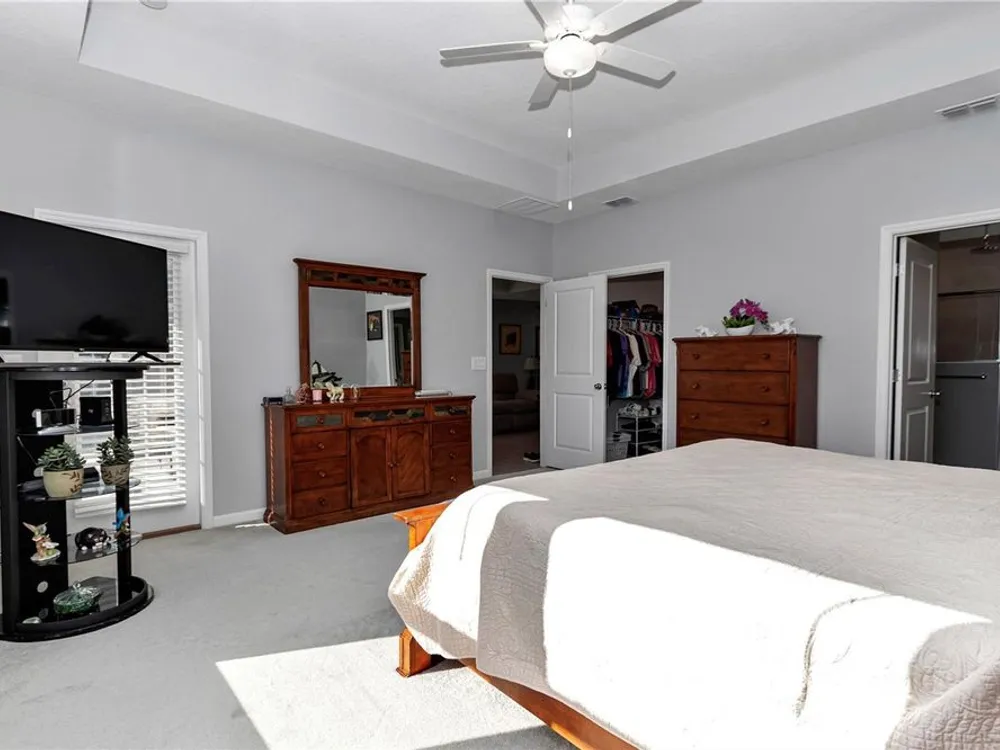 - Ceiling Fan(s), High Ceilings, Kitchen/Family Room Combo, Main Level Primary, Solid Surface Counters, Split Bedrooms, Thermostat, Walk-In Closet(s), Window Treatments