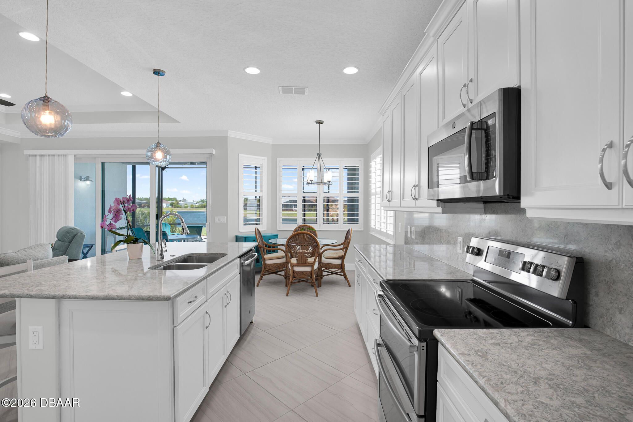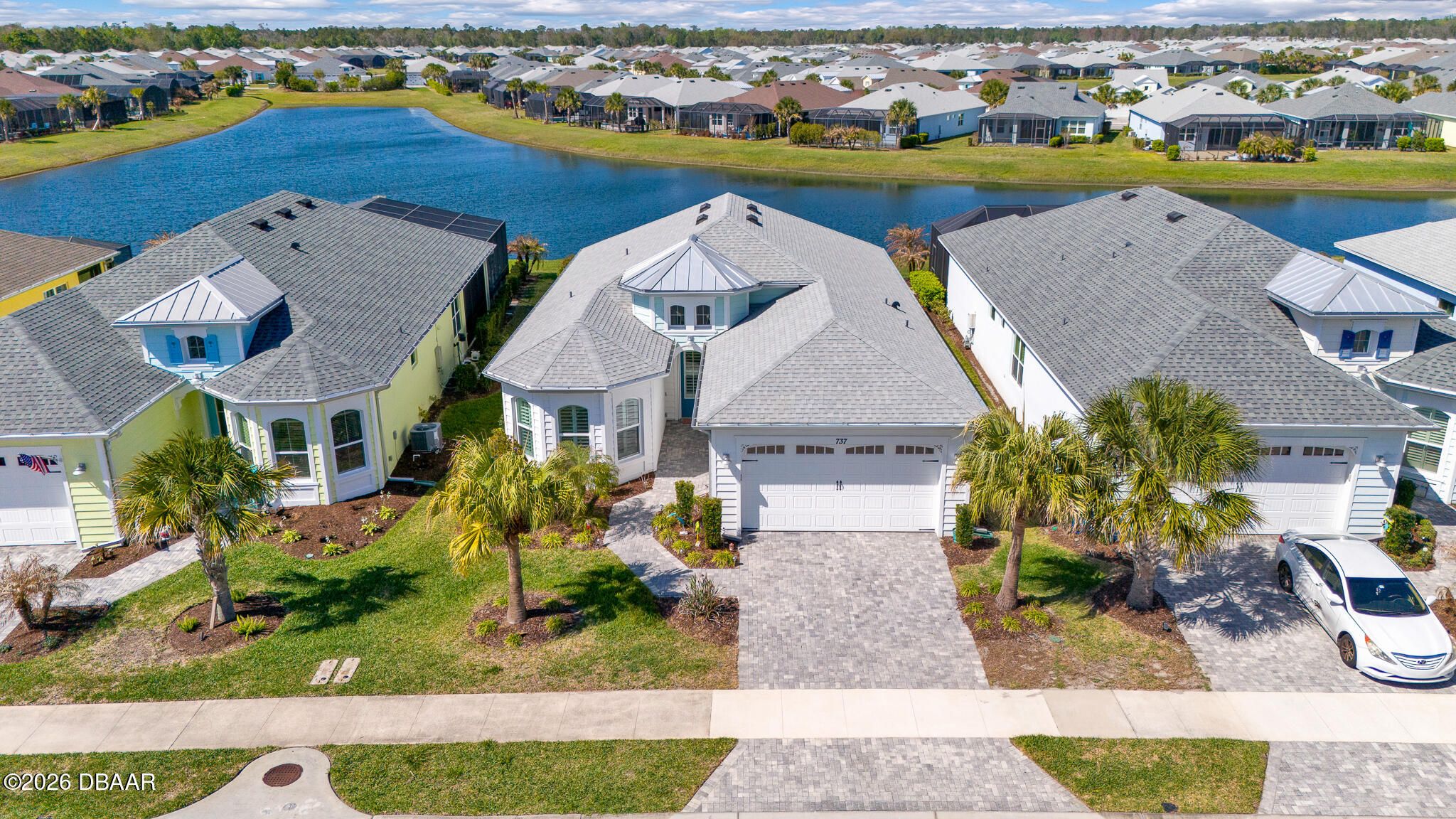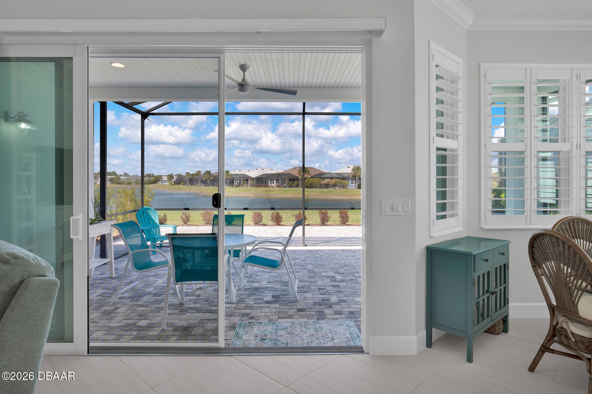 This FULLY FURNISHED LAKEFRONT PARROT with GOLF CART has it ALL! A rare find with HURRICANE WINDOWS AND DOORS, extra insulation in walls and garage attic, whole house water filtration system, UV light in the HVAC, and a retractable screen on the front door. This gorgeous 2 bedroom / 2 bath home has a den, formal dining room and a great room open to the kitchen. Light and bright diagonally installed tile floors throughout lend elegance to the floor plan. The kitchen boasts white 42'' upper cabinets and pull out shelving. Crown molding and plantation shutters throughout lend additional charm. There are an abundance of cabinets in the laundry room and a laundry sink. The garage has epoxy floors, a Hurricane resistant garage door, overhead shelving, storage cabinets, and a utility sink. Enjoy all of the amenities that 55 and better Latitude Margaritaville has to offer such as the Beach Club, Resort Pool, Theatre, Fitness Center, Restaurant/Bar, Pickleball, Bocci Ball, and Tennis.