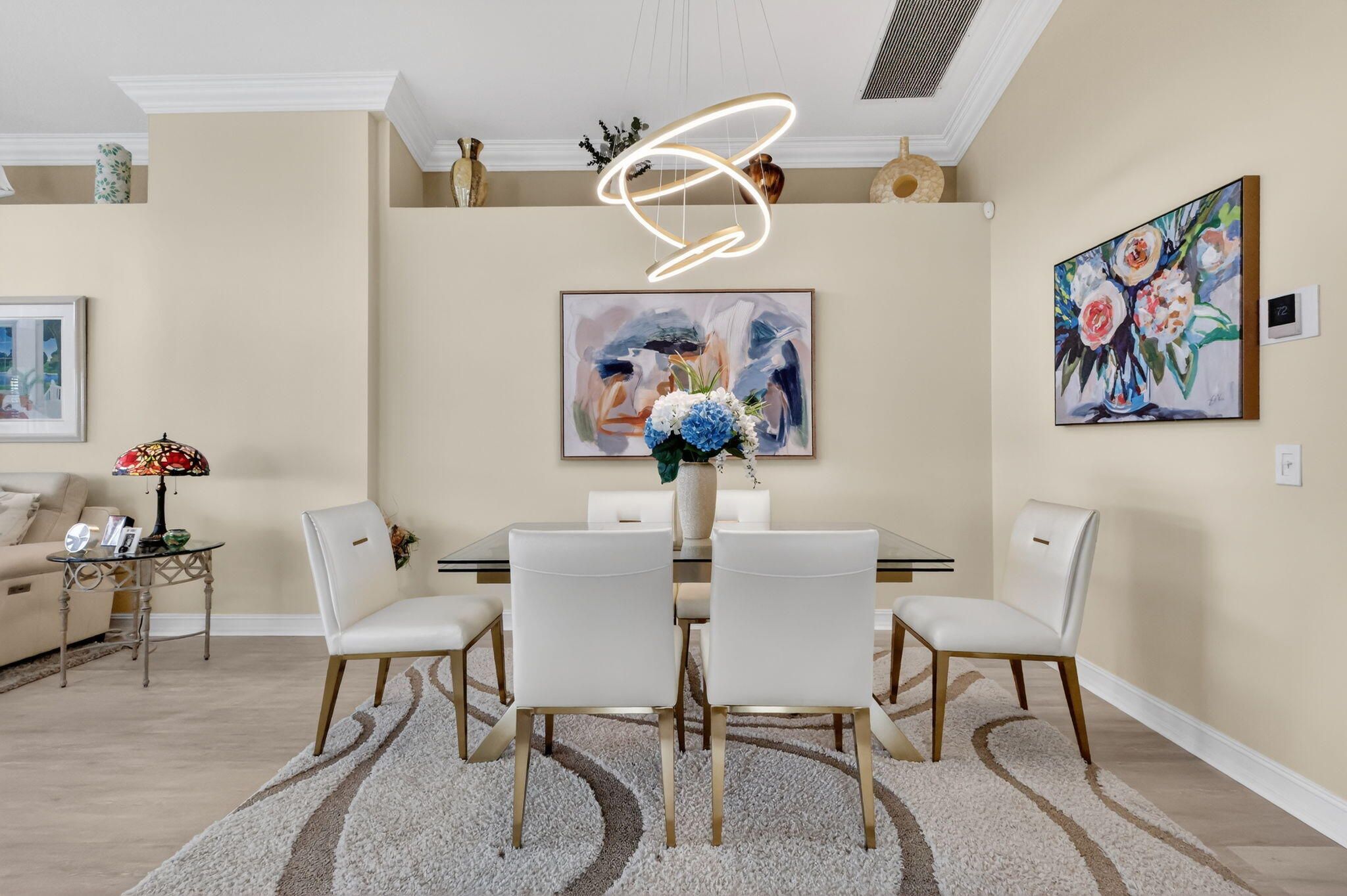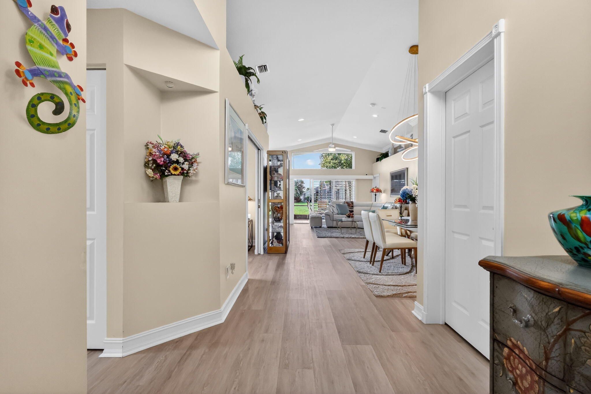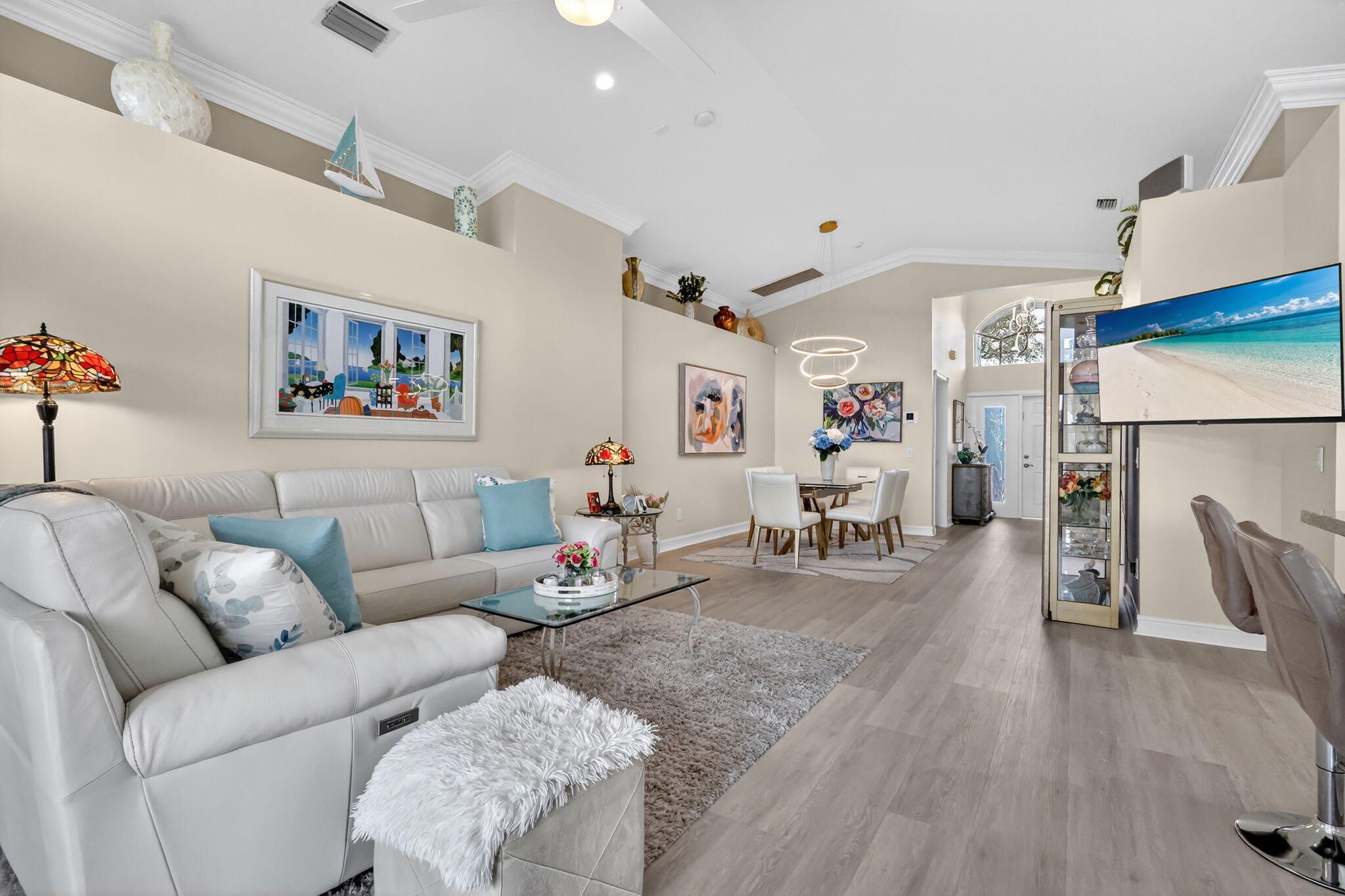 BRING YOUR SUITCASE & TOOTHBRUSH SO YOU CAN MOVE RIGHT IN TO THIS ELEGANT, SOPHISTICATED, IMPECCABLY UPDATED & MAINTAINED SOUTH PACIFIC MODEL ON THE WATER! LUXURY VINYL FLOORS INSTALLED 2025, ROOF REPLACED 2024, A/C REPLACED 2023, PRIMARY BATHROOM UPDATED 2023 WITH NEWER CABINETS, QUARTZ COUNTERTOPS, UPDATED FIXTURES & FAUCETS, FRAMELESS GLASS SHOWER DOOR. THE KITCHEN HAS ALSO BEEN UPDATED WITH WOOD CABINETS, QUARTZ COUNTERTOPS WITH TILE BACKSPLASH, LOTS OF POT DRAWERS, CONTEMPORARY PENDANT LIGHTS, GORGEOUS SAMSUNG FINGER PRINT RESISTANT APPLIANCES TOPPED OFF WITH A COZY BREAKFAST NOOK. CROWN MOLDING EVERYWHERE FOR A TOUCH OF ELEGANCE. THE FAMILY ROOM, DINING ROOM, PRIMARY BEDROOM & GUEST BEDROOM ALSO HAVE PLANTATION SHUTTERS. THE DINING ROOM & FAMILY ROOM HAVE A CATHEDRAL CEILING WHICH CREATES A LARGE OPEN FEELING. THE LANAI IS COVERED, EXTENDED AND SCREENED-IN WITH A TILE FLOOR WHICH IS PERFECT FOR ENJOYING THE FLORIDA OUTDOORS. ACCORDION SHUTTERS TO KEEP YOU SAFE FOR HURRICANE PROTECTION. YOU HAVE TO SEE THIS HOME TO TRULY APPRECIATE THE CARE AND PRIDE OF OWNERSHIP FOR THIS HOME. VALENCIA FALLS IS A 55+ COMMUNITY. THE CLUBHOUSE HAS BEEN RECENTLY RENOVATED & IT IS SPECTACULAR! THIS HOME AND THE CLUBHOUSE ARE A MUST SEE! ALL MEASUREMENTS & INFORMATION ARE DEEMED ACCURATE & SHOULD BE INDEPENDENTLY VERIFIED.
