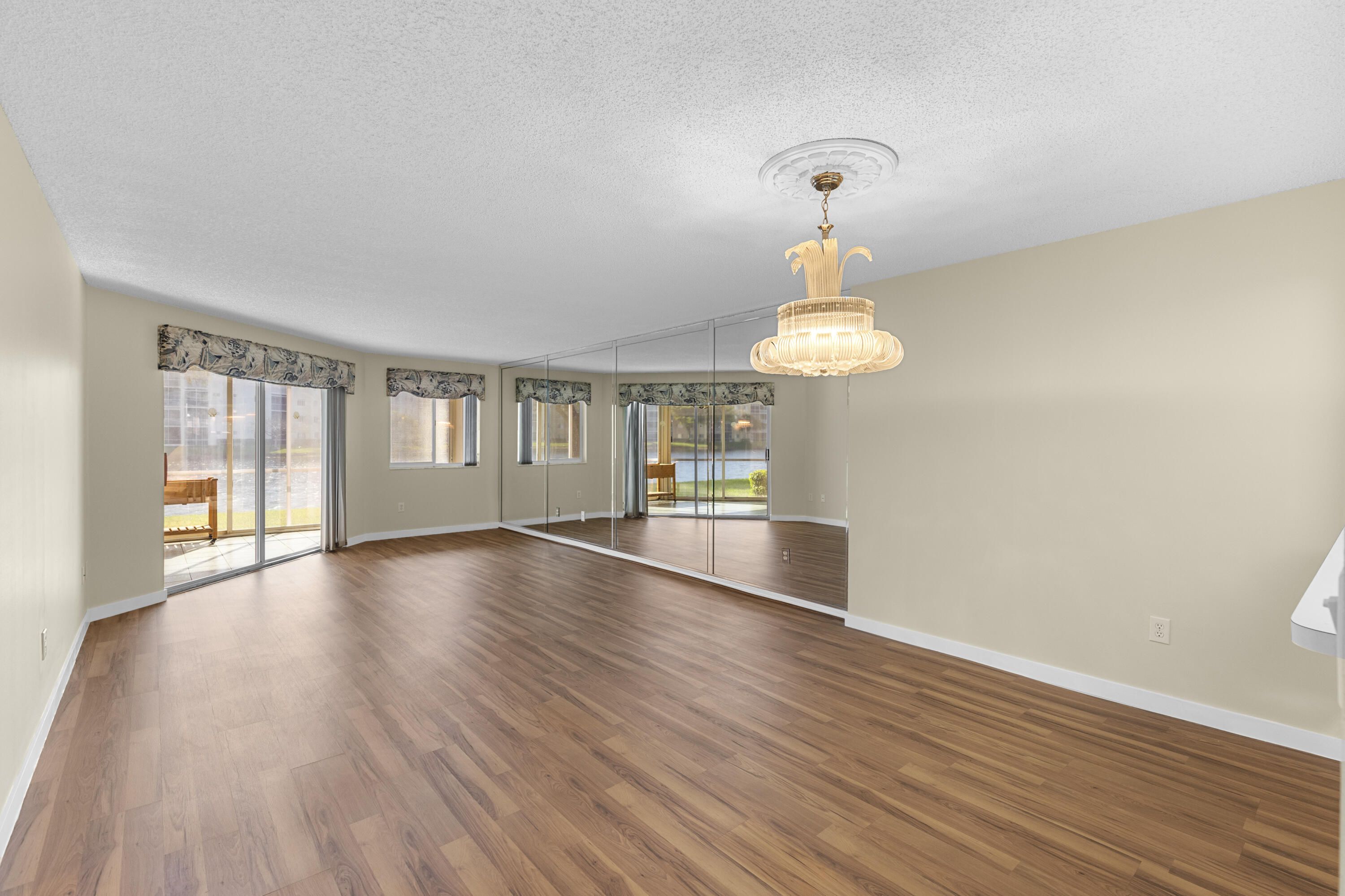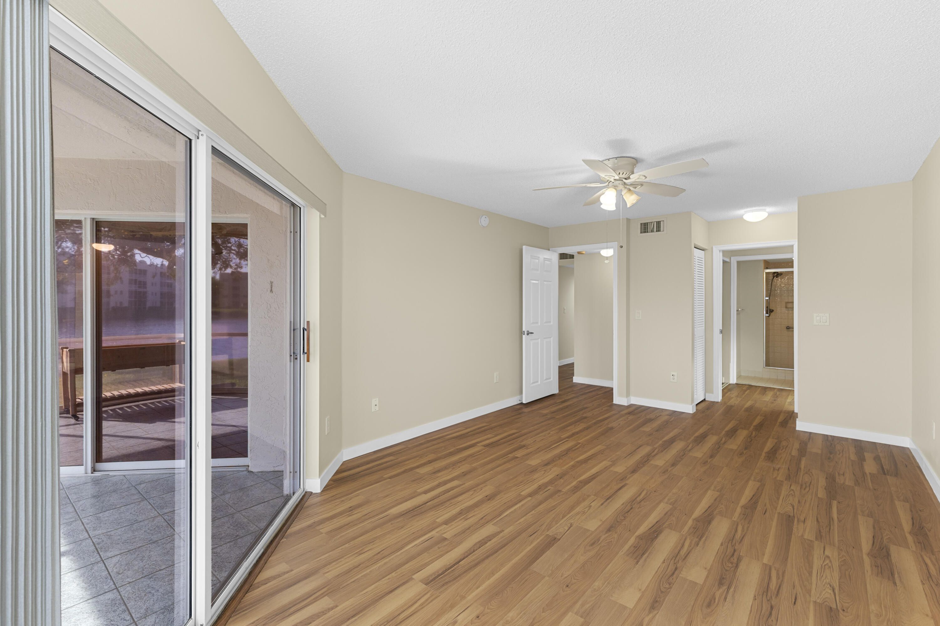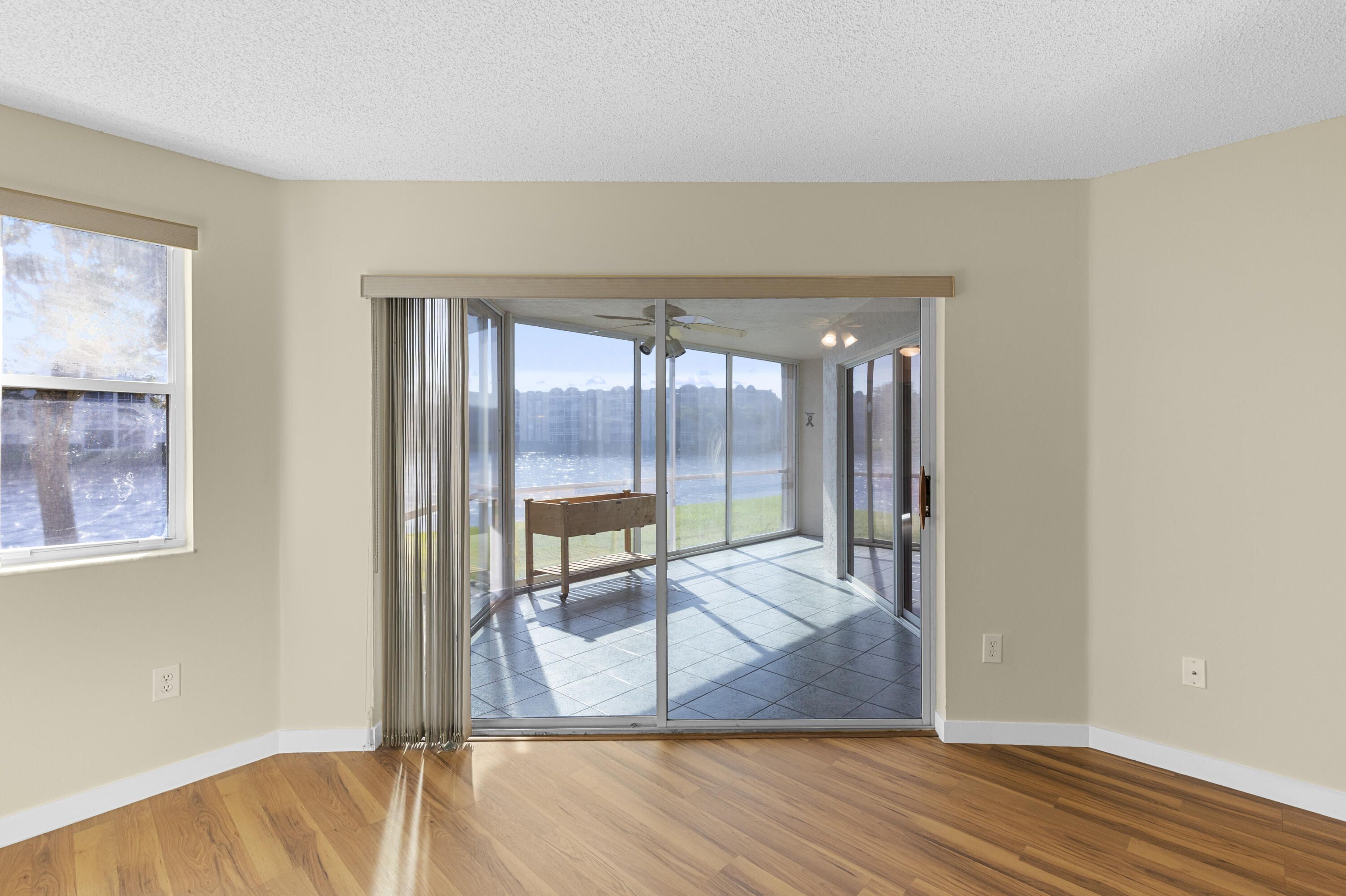 Rarely available first floor 2BR/2BA lake view residence in the desirable Granville neighborhood of Kings Point, a vibrant 55+ guard-gated community. This spacious 1,500 sq ft unit features a private gated courtyard entry, fresh paint and brand new flooring throughout. The layout offers a desirable split floor plan with a large living room, den, breakfast nook, separate laundry room and plenty of storage including a private exterior storage closet. Enjoy beautiful lake views from the glass-enclosed patio with sliding door access from both the living room and main bedroom, providing a gorgeous ground-level setting. Kings Point residents enjoy resort style amenities including pools, fitness center, tennis, pickleball, hobby rooms, business center, BBQ areas, clubhouses, and theatre.