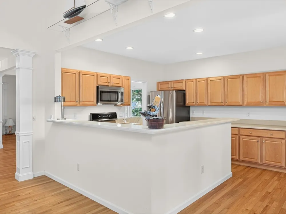 Stately free-standing "Laurel" on large lot with updated kitchen + appliances in Great Island within The Pinehills. Upon entering you notice the glistening hardwood throughout first floor & the open flow of the rooms. Hardwood staircase, off the dramatic two story foyer, leads to second level. Family room with cathedral ceiling and gas fireplace is adjacent to the chef’s kitchen. The kitchen has extended cabinetry with over/under lighting, gas range, and hardwood floors. A formal living room and dining room with decorative moldings enhance the beauty of this home. First floor primary suite is spacious with beautiful views. Completing the first level is a study off the foyer. The second level has a loft, two generous size bedrooms and a full bathroom. Be sure not to miss the three season porch with wooded views. Laundry room, 2 car garage, and bulkhead exit from lower level are added value to this property. Overlook clubhouse nearby with indoor pool, hot tub, gym and more!