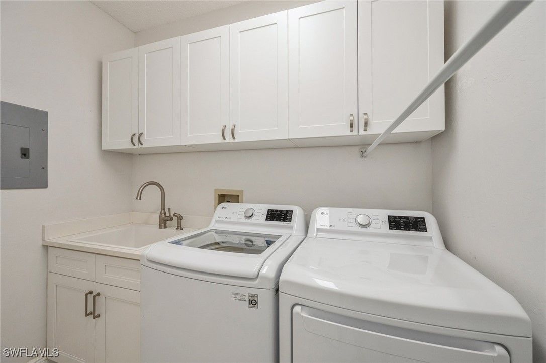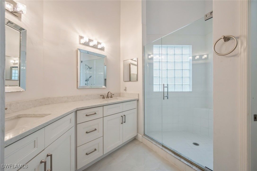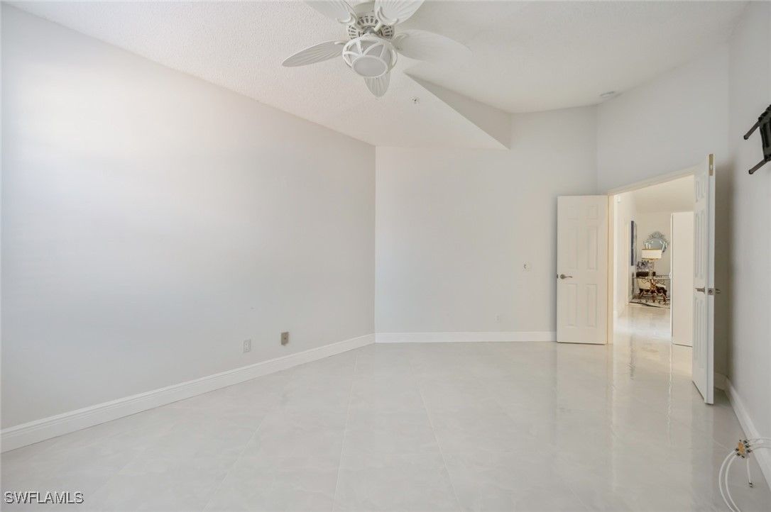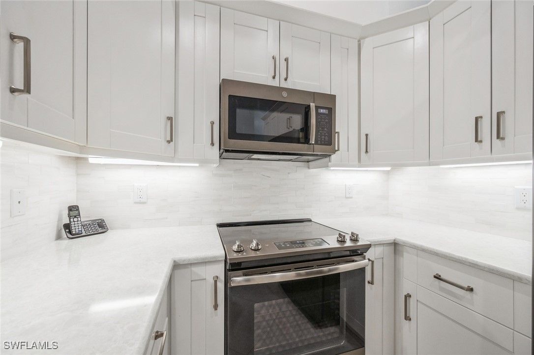 Experience refined Florida living in this beautifully remodeled second-floor coach home, located within the exclusive community of Silver Oaks at the prestigious Vineyards Country Club in Naples. Spanning 1,695 square feet, this 3-bedroom, 2-bathroom residence seamlessly blends comfort, elegance, and modern upgrades. Upon entering, you're greeted by soaring cathedral ceilings and gleaming white tile floors that extend throughout the main living areas and the screened lanai, creating a bright and airy ambiance. The open-concept layout is ideal for both entertaining and everyday living. The kitchen boasts white cabinetry, a white and light grey backsplash, and white and light grey quartz countertops, providing a sleek and functional culinary space. Complementing the design are GE slate appliances, which offer a smudge-proof, matte finish that harmonizes beautifully with the kitchen's color palette. The master bedroom features laminate flooring, a walk-in closet with custom white built-in cabinetry, and bright en-suite bathroom with dual sinks, white cabinets, white quartz countertops, and a walk-in shower. The second bedroom also offers laminate flooring, while the third bedroom is adorned with white tiles, making it ideal for guests or a home office. The second bathroom includes a tub, offering a relaxing retreat. Additional highlights of this home include a full-size laundry room with a utility sink, an attached one-car garage, and a whole-home water filtration system. The air conditioning is 3 years old. The screened lanai, featuring white tiles consistent with the rest of the home, offers a beautiful view of the landscaped surroundings, with partial views of the pool and clubhouse, providing a serene outdoor space. The community pool, spa, BBQ facilities, and clubhouse are all within walking distance. Optional membership to The Vineyards Country Club unlocks a world of luxury amenities, including 36 holes of championship golf, 12 Har-Tru tennis courts, 8 Gel-Cushioned pickleball courts, a new 15,000-square-foot Wellness Center & Spa, and a newly renovated 70,000-square-foot clubhouse.