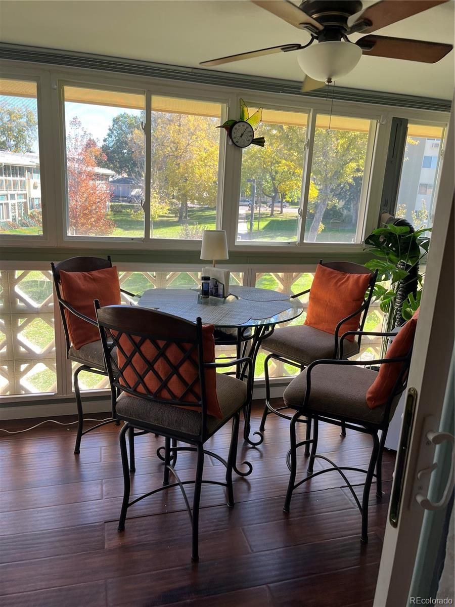 Windsor Gardens is a peaceful 55+ active adult condo community in a great location: close to both Parker Rd, and Havana St. Colorado Anschutz medical center, lots of shopping, and restaurants, and two 18 hole Golf Courses. What differentiates this condo from others for sale in Windsor Gardens is it's an end unit on the top floor which means only 1 common wall, and Vaulted/High ceilings. It also has newer windows and patio slider, newer high quality, rich tone LVP flooring and 4 AC units. The lanai/balcony features an AC unit to make it comfortable in the summer, a beautiful view of the green space, and trees adjacent to the building, and floor to ceiling windows with moveable shutters. Also it's being sold furnished. At first glance the HOA seems a bit pricey, but after considering the laundry list of amenities you'll realize it's pretty good deal: Heat, Water, Sewer, Trash, Grounds and Structure maintenance and insurance, snow removal, 24 hour security/patrolling community responders, on site management, 2 pools, Hot tub, sauna, fitness center, and a very nice, inexpensive, 9 hole golf course in your back yard - literally. And last but certainly not least - the HOA fee includes payment of your property TAXES. Unit is being sold fully furnished. If buyer doesn't want the furnishings, seller will remove. Seller will pay 6 months of HOA assessments at closing