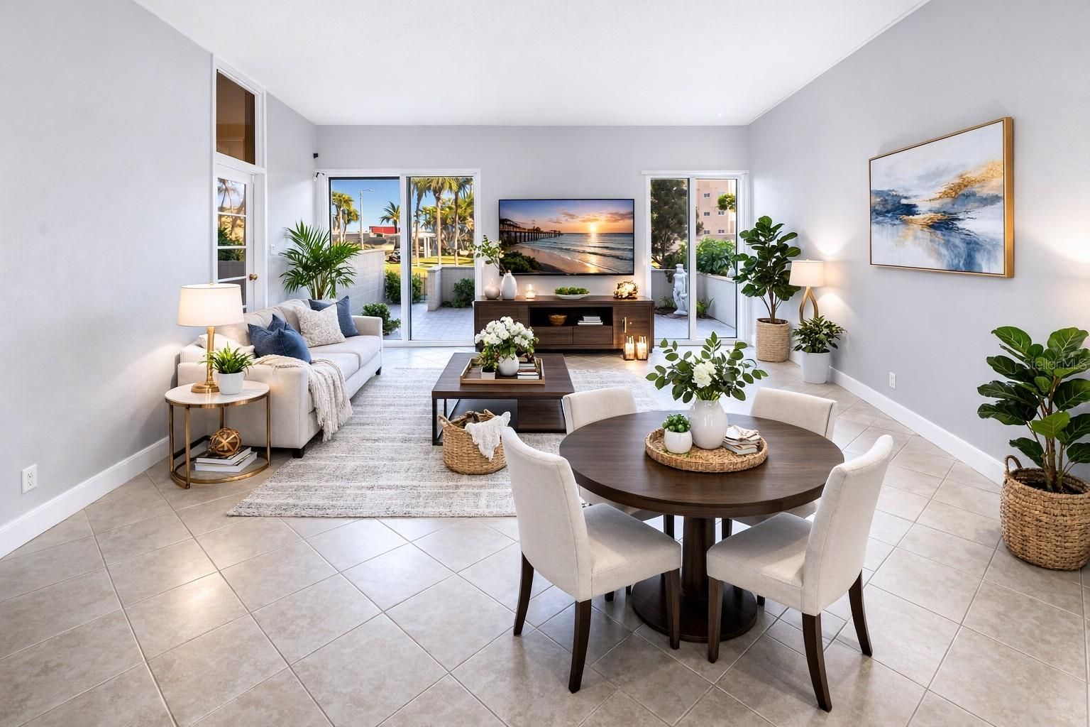 One or more photo(s) has been virtually staged. Welcome to 7400 Sun Island #103, located in the sought-after Bay Island Condominium community, a premier 55+ waterfront neighborhood just minutes from St. Pete Beach. This beautifully updated two-bedroom, two-bath condo offers modern coastal style and easy, comfortable living. The home features hurricane-impact windows and doors, soaring 10-foot ceilings, and three private patios that bring in natural light and refreshing coastal breezes. The brand-new kitchen stands out with crisp white cabinetry, elegant countertops, and stainless steel appliances. Both bathrooms have been thoughtfully remodeled with clean, modern finishes. The open layout connects the kitchen, dining, and living areas, creating a bright, welcoming space that’s perfect for everyday living or hosting guests. Step outside to any of your three private balconies and enjoy peaceful views in a well-maintained waterfront setting. Residents of Bay Island enjoy resort-style amenities, including multiple pools, tennis courts, a fitness center, clubhouse, marina, and a scenic waterfront walking trail. The location puts you close to award-winning beaches, great restaurants, shopping, medical facilities, and the energy of St. Petersburg and South Pinellas County. The HOA fee covers 24-hour guarded entry, cable and internet, water, sewer, trash, flood insurance, and exterior maintenance, giving you true low-maintenance living and added peace of mind. This move-in ready condo offers the perfect opportunity to enjoy the best of Tampa Bay’s coastal lifestyle.