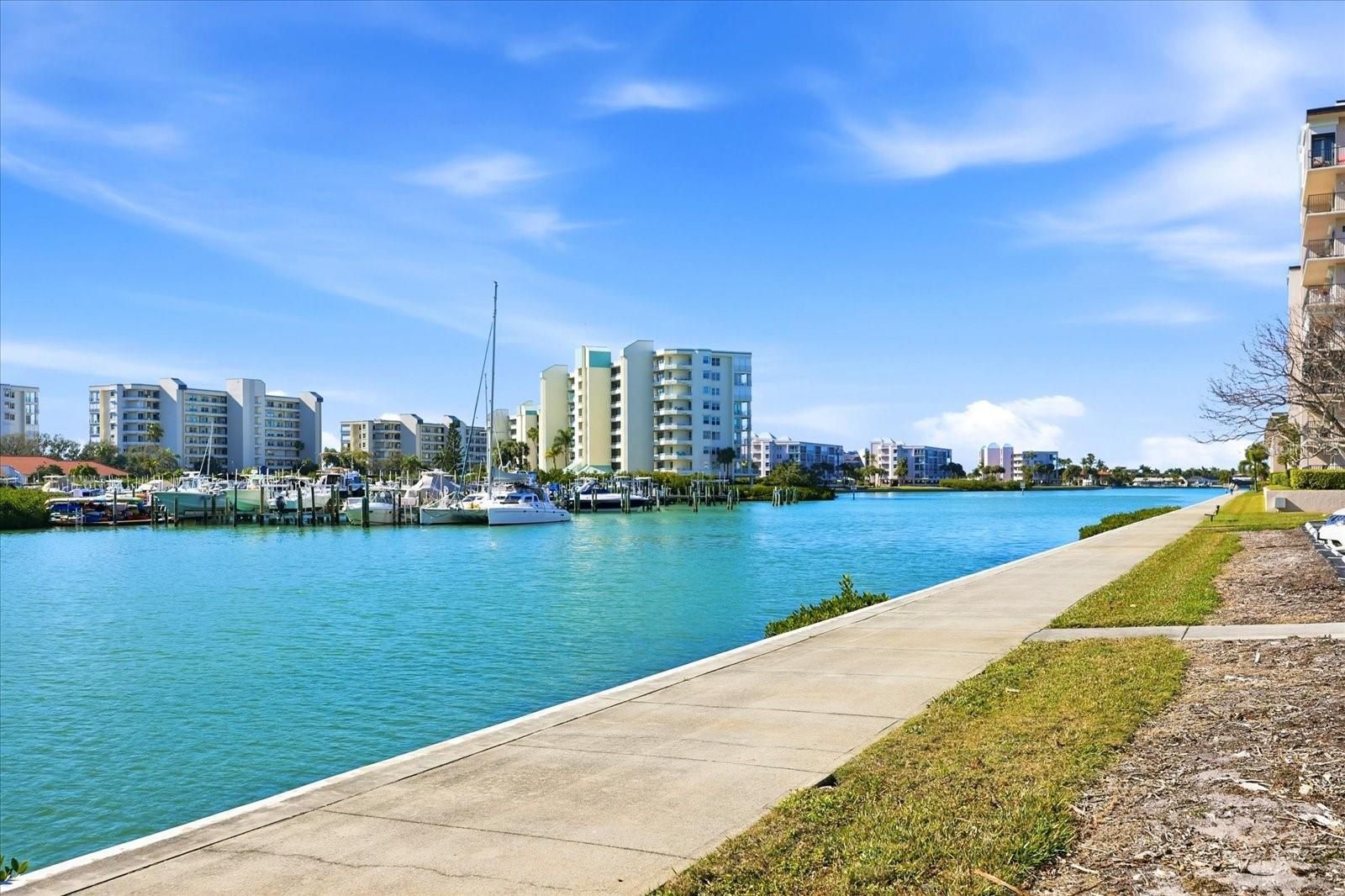 Top-floor, center-of-the-building residence with sweeping waterfront views in the highly sought-after Ambassador Building in a 55+ Community. This 2-bedroom, 2-bath condominium offers 1,230 square feet of light-filled living space overlooking Dolphin’s Pass—where boats glide by and dolphins are often spotted. The living room features plantation shutters framing serene water views, while the flexible guest bedroom doubles beautifully as an office or den with a built-in Murphy bed and full closet. Storage is abundant throughout, including generous interior closets plus a dedicated storage room. The primary suite enjoys tranquil water views, an oversized walk-in closet, and a walk-in shower. The guest bath includes a tub/shower combo—ideal for guests or family. Recent updates include HVAC (2022), interior paint (2025), and new carpet (2026). The Ambassador Building is one of the few in this 24/7 guard-gated waterfront community to feature a hot tub overlooking Dolphin’s Pass, along with secure building access, two elevators, and a beautifully renovated first floor with navy coastal accents. Laundry is conveniently located on the 5th floor, and the unit includes one covered parking space. Residents enjoy resort-style amenities: a clubhouse currently undergoing a full renovation with new flooring, paint, library, and entertainment spaces; separate men’s and women’s gyms with sun patios, showers, locker rooms, and sauna (under renovation); tennis courts, shuffleboard courts, waterfront BBQ areas with tiki huts, boat slips, and more. HOA only $856 Month. Pet friendly! Perfectly positioned between Pasadena and St. Pete Beach—less than 1.5 miles to Upham Beach and just across the street from Fred Held South Pasadena Habitat—this home offers the ideal blend of coastal living, convenience, and security.