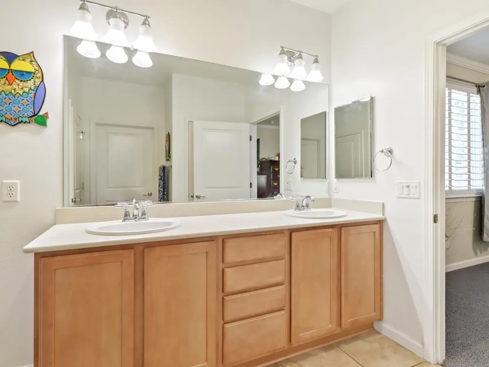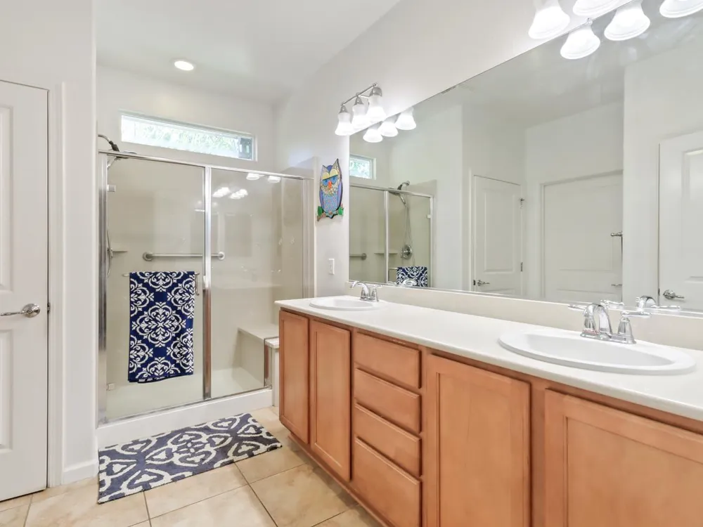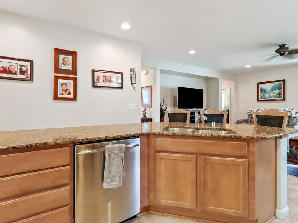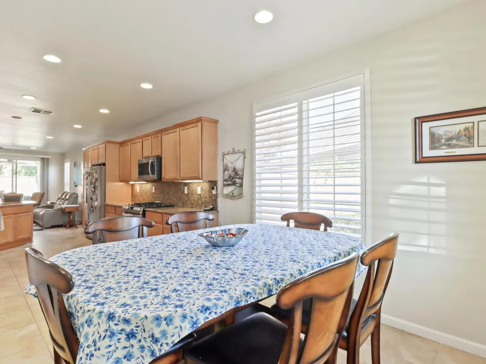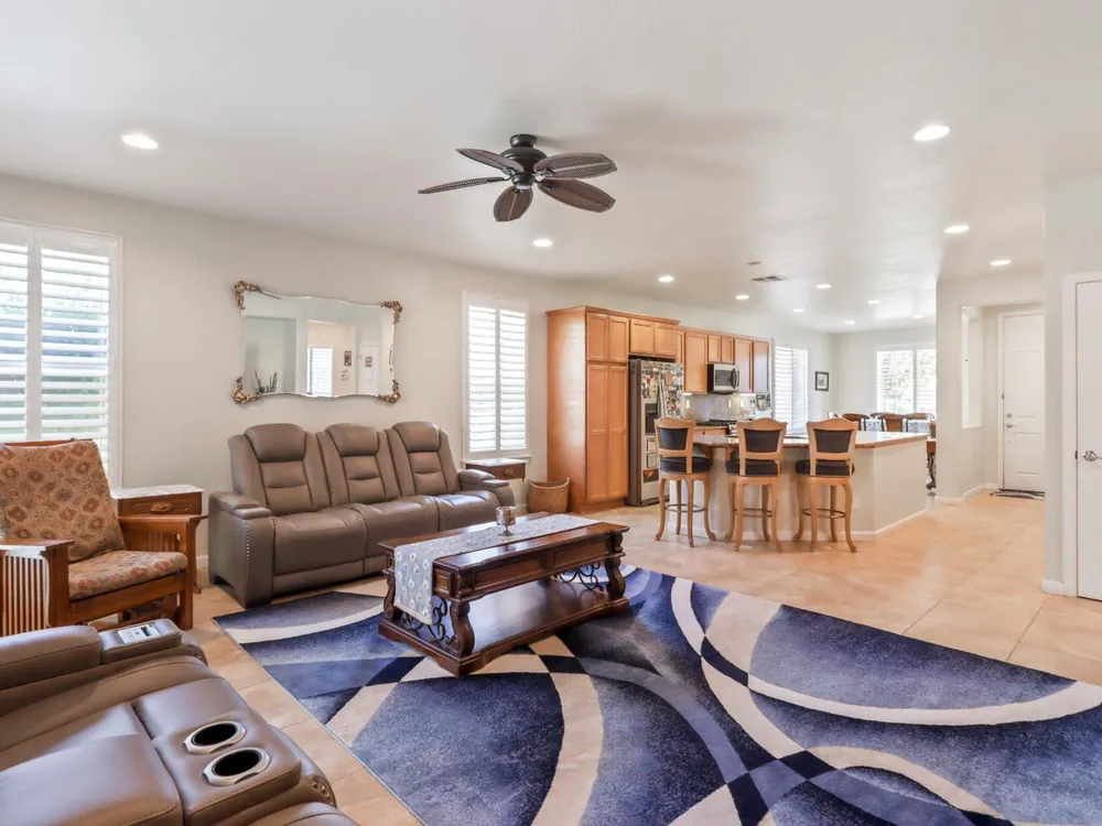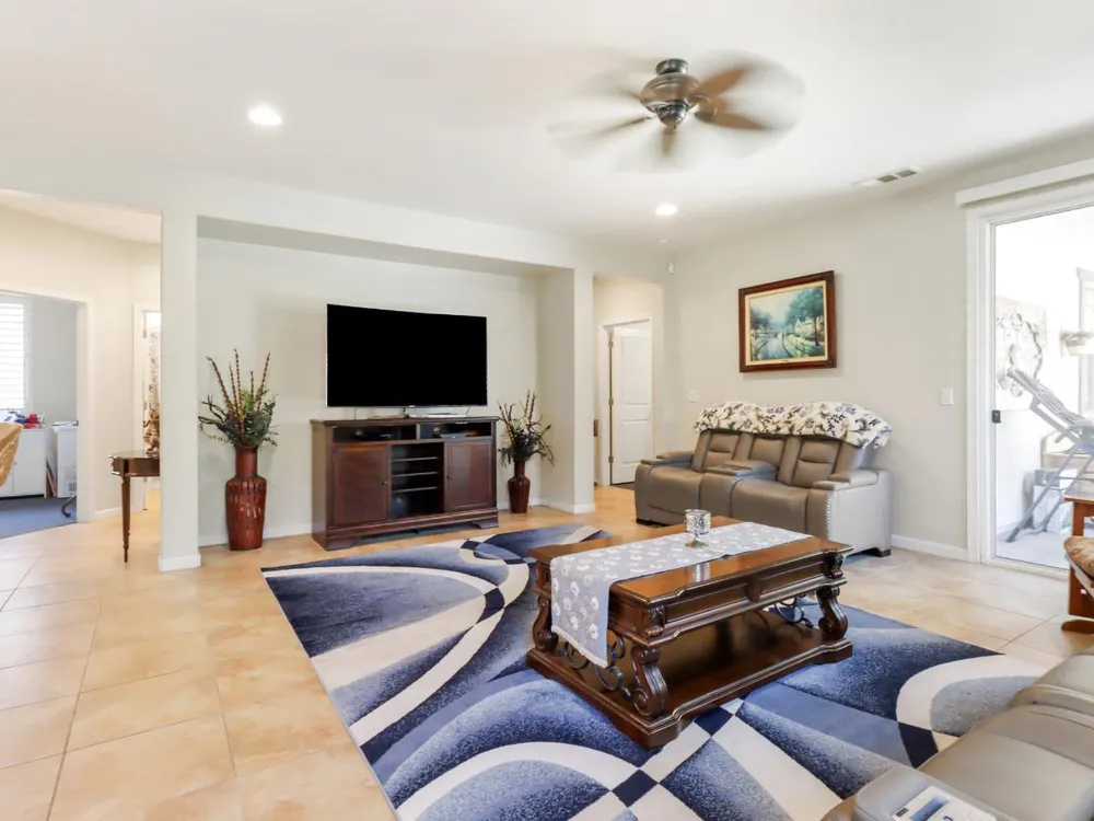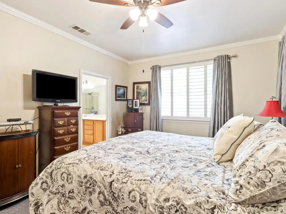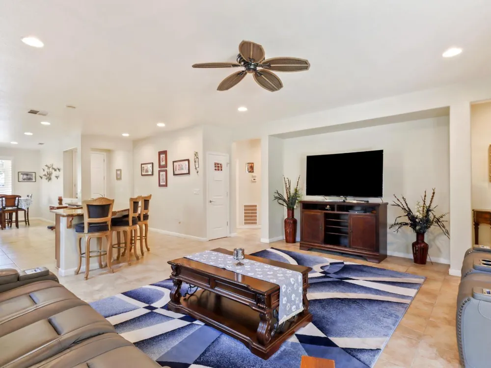 Welcome to Del Webb Glenbrooke, an active 55+ community where resort-style amenities and a warm, welcoming atmosphere make every day feel like a getaway. This immaculate Colby Model offers 3 bedrooms, 2 baths, and 1,644 sq. ft. of thoughtfully designed living space. The inviting great room seamlessly connects the living area, kitchen, and dining nook, perfect for both everyday living and entertaining. Dual-pane windows with plantation shutters fill the home with natural light, while the kitchen features stainless steel appliances, abundant storage, and a convenient breakfast bar. The spacious primary suite boasts his-and-hers sinks, a step-in shower, and a walk-in closet. Situated on an oversized lot, the beautifully landscaped backyard offers a covered patio with a ceiling fan, lush lawn, palm trees, and garden beds ready for your outdoor hobbies. As part of Glenbrooke, you'll enjoy pickleball, tennis, bocce, a pool, spa, fitness center, clubhouse, and dozens of social clubs and events just steps from your front door.