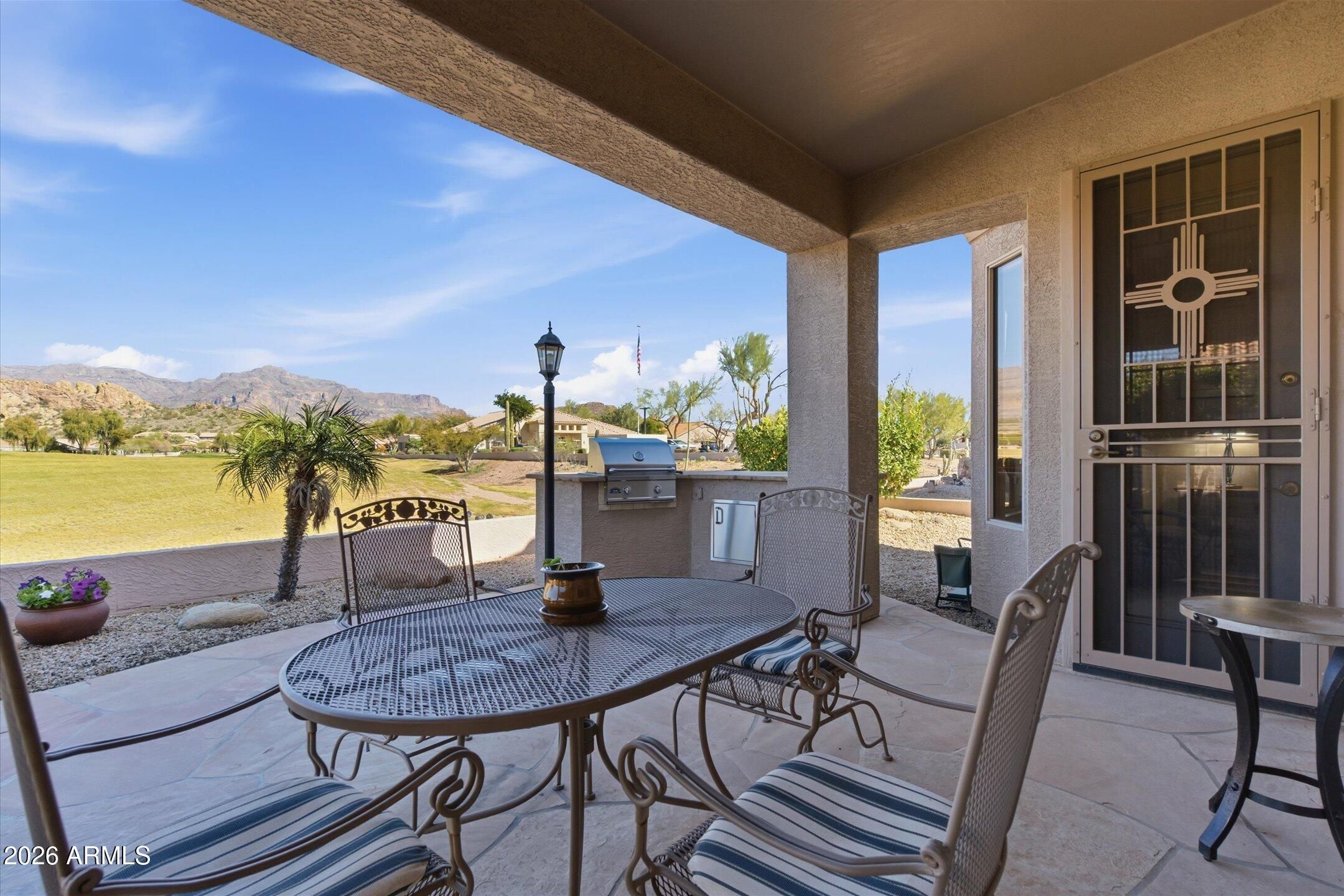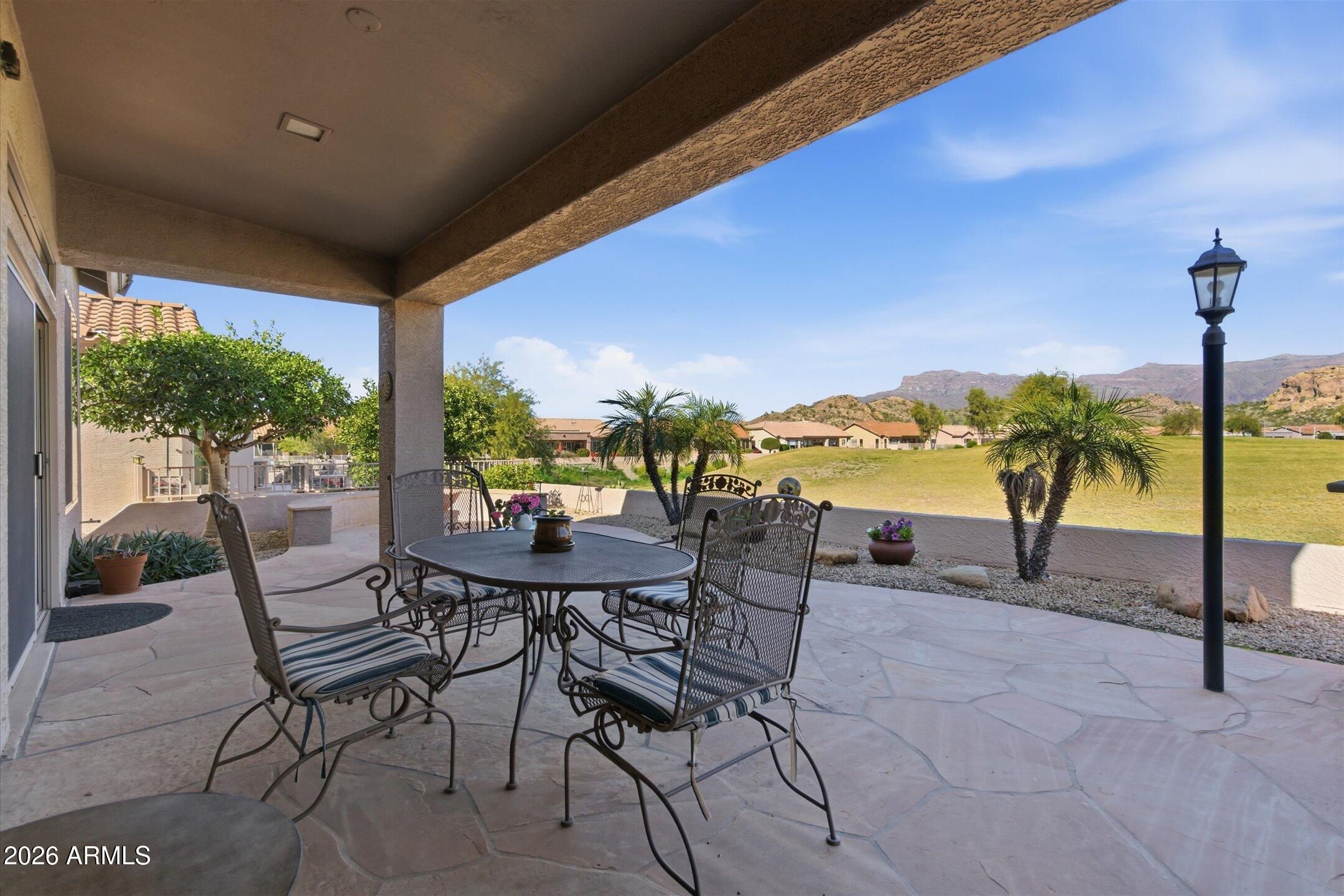 Rare opportunity to own one of the best view lots in MountainBrook Village with unobstructed Superstition Mountain views & direct golf course frontage. This furnished Picacho floorplan offers 3 bedrooms+den & 3 bathrooms, including a private casita + front courtyard with fireplace. The resort style backyard features an extended covered patio with flagstone, built in BBQ, all perfectly positioned to capture breathtaking mountain+golf course views. Inside, the kitchen was updated in 2020 with custom cabinets featuring pull outs, granite countertops, gas range, stainless steel appliances,+additional cabinetry in the breakfast room. Major updates completed in 2020 include a new roof and new A/C, New laminate flooring in the dining and living area The spacious primary suite offers patio access and an ensuite bath with dual sinks, garden tub, walk in shower, and linen closet with pull outs. Oversized laundry room with folding table and cabinets. Two car garage with extensive built in storage, workbench, utility sink, water softener, and side yard access. MountainBrook is a vibrant 55+ community offering golf, clubhouse amenities, pools, fitness center, pickleball, and a full calendar of social activities. Homes with this level of view, upgrades, and location rarely come available. Schedule your showing today.