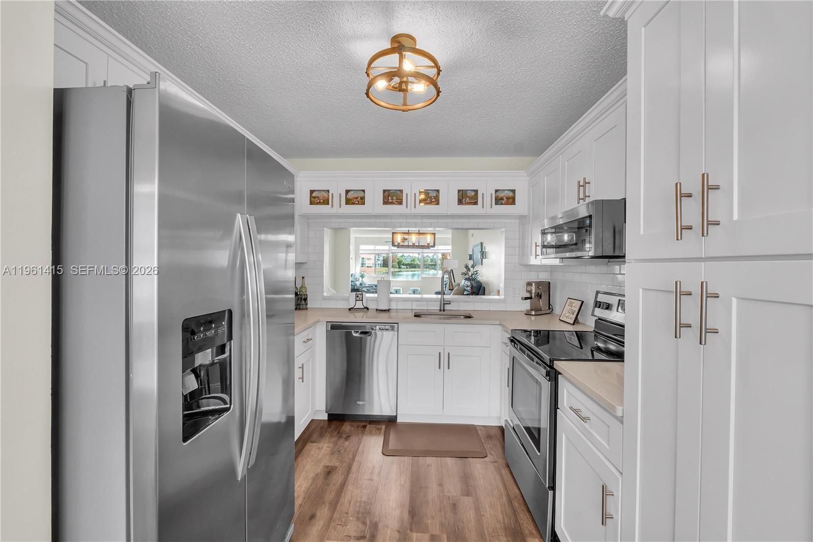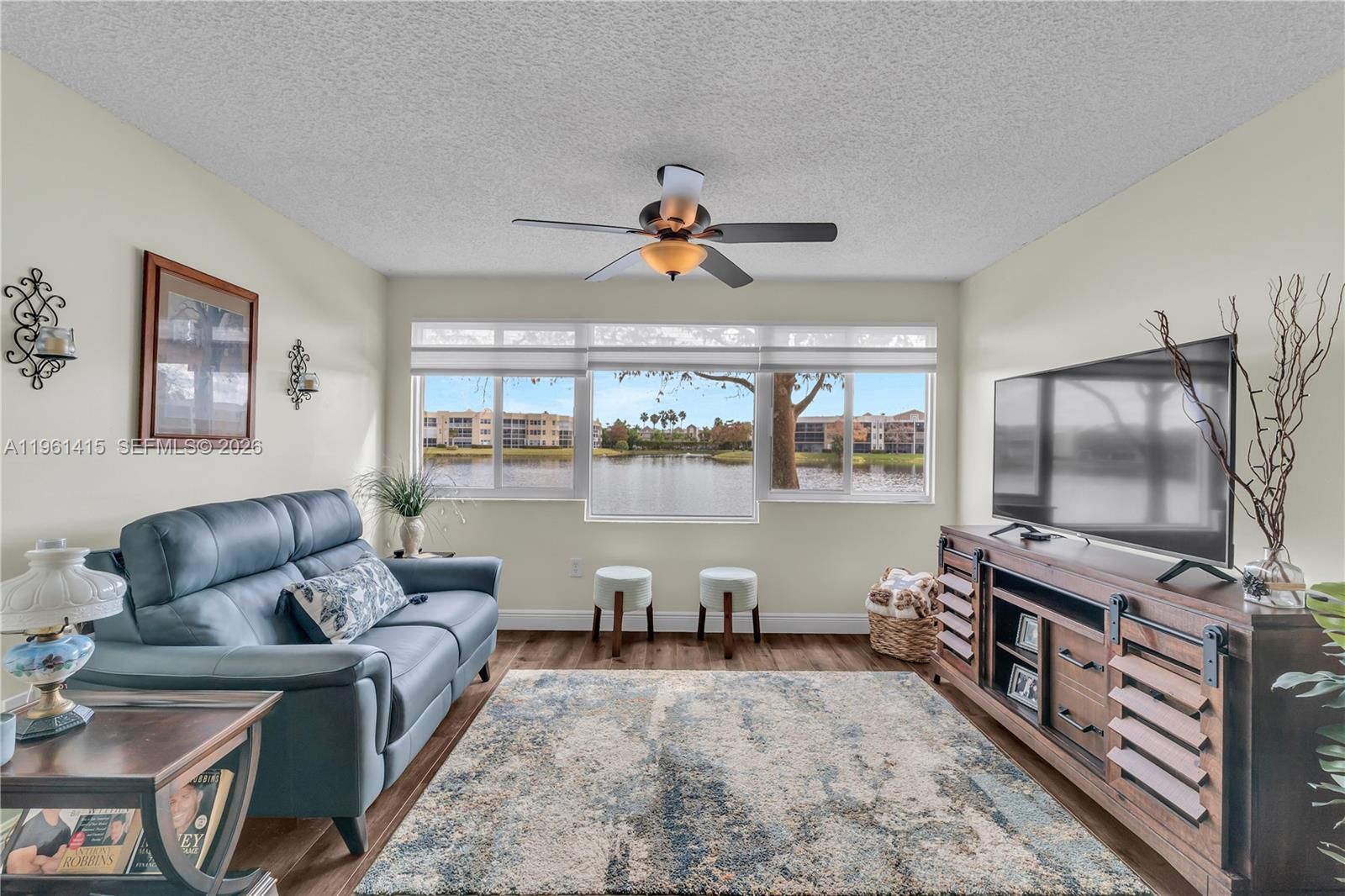 Come see this beautifully updated, immaculate and desirable, first floor 2/2 waterfront condo with breath-taking views, assigned parking space directly in front of unit, Devon clubhouse, pool and shuffleboard courts located steps away and diagonally across from your building! The extended great room and spacious master bedroom has new impact windows over-looking lake views and the kitchen and second bedroom have accordion shutters for your added protection. You will fall in love with the updated white kitchen cabinets, countertops, full size pantry, SS appliances, updated master and guest bathrooms with updated tile, toilet, cabinet and countertops. Enjoy relaxing and entertaining in your great room and looking out to the serene water view from the pass-through opening in the kitchen! Other features include; premium wide plank laminate flooring throughout the condo, alarm system, neutral wall color, new light fixtures, new fans, new custom light filtering fabric shades in all rooms and incredible oversized laundry room with additional storage and full-size washer/dryer that you will love! Embrace the resort-style living with a Broadway-style theater, clubhouse, fitness center, pool, courtesy bus, endless clubs and countless activities for your enjoyment!