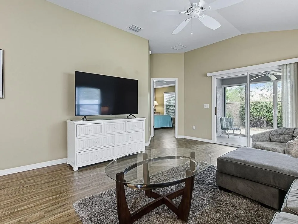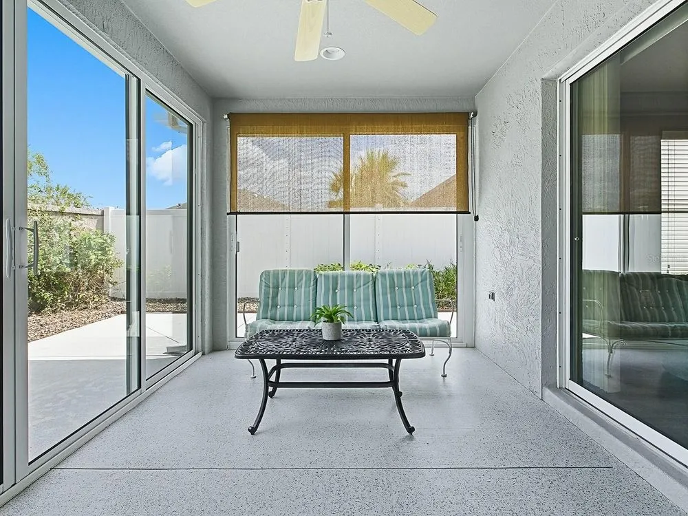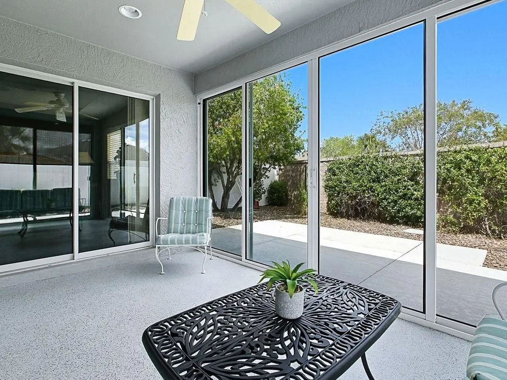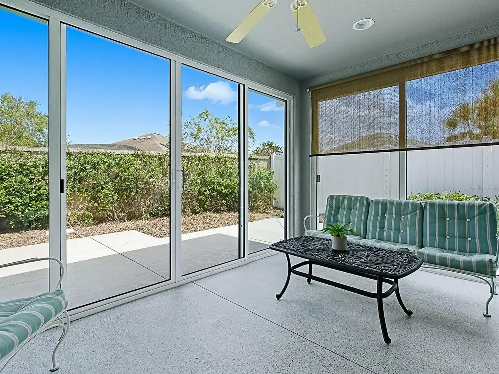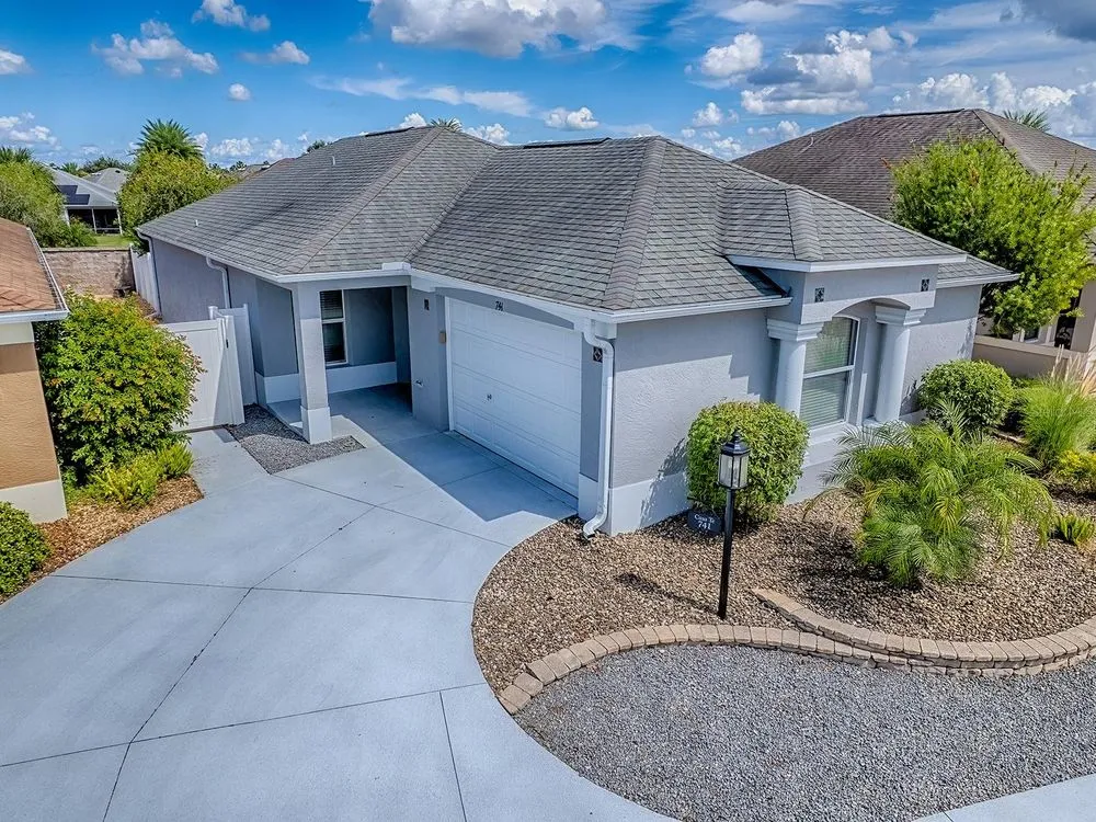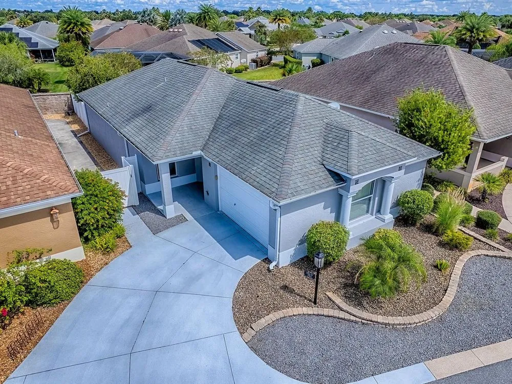 TURNKEY! Come see this beautifully constructed Concrete Cambridge Courtyard Villa located in the desirable Village of Sanibel. From the moment you arrive, you’ll notice the painted driveway and walkway, surrounded by low-maintenance rock landscaping and tropical plantings for year-round curb appeal. Inside, you’ll find NO CARPET—luxury vinyl plank flooring runs throughout the home. The spacious living room features vaulted ceilings and sliding glass doors that open to the glass-enclosed lanai, creating the perfect blend of indoor and outdoor living. The eat-in kitchen boasts a tiled backsplash, high-definition countertops, and a convenient closet pantry. The open dining area seamlessly flows into the living room, providing ample space for entertaining family and friends. The glass-enclosed lanai provides even more space to gather, featuring sliding glass doors that offer easy access to the patio for grilling or outdoor activities. The owner’s suite offers tray ceilings, a large walk-in closet, and a private bath with a tiled shower (complete with seat) and dual sinks. The guest suite also features vaulted ceilings and direct access to the guest bath, providing comfort and privacy. Additional highlights include an epoxy-finished garage floor and attic stairs for added storage space. This villa is ideally located near Sanibel and Captiva pools, the Colony Rec Center, shopping, dining, the Sarasota Golf Center, Bonifay Country Club, and more. You’ll be just 10 minutes from Brownwood Paddock Square and medical facilities, as well as 12 minutes from Lake Sumter Landing. Multiple executive and championship golf courses are nearby, making this a perfect spot to enjoy all The Villages has to offer.