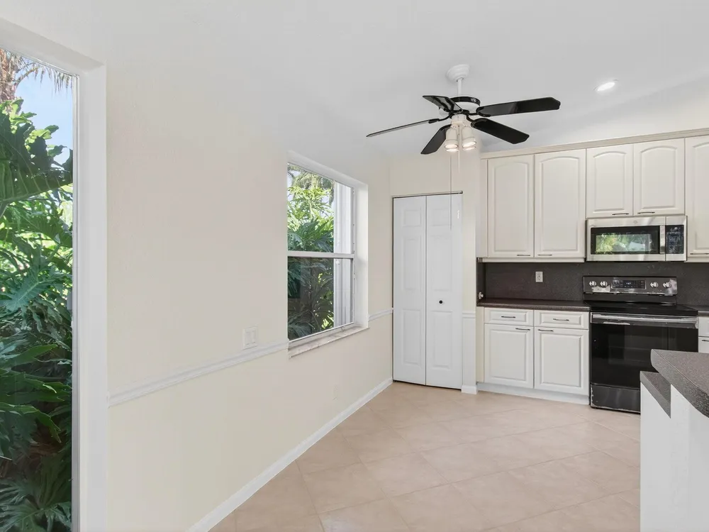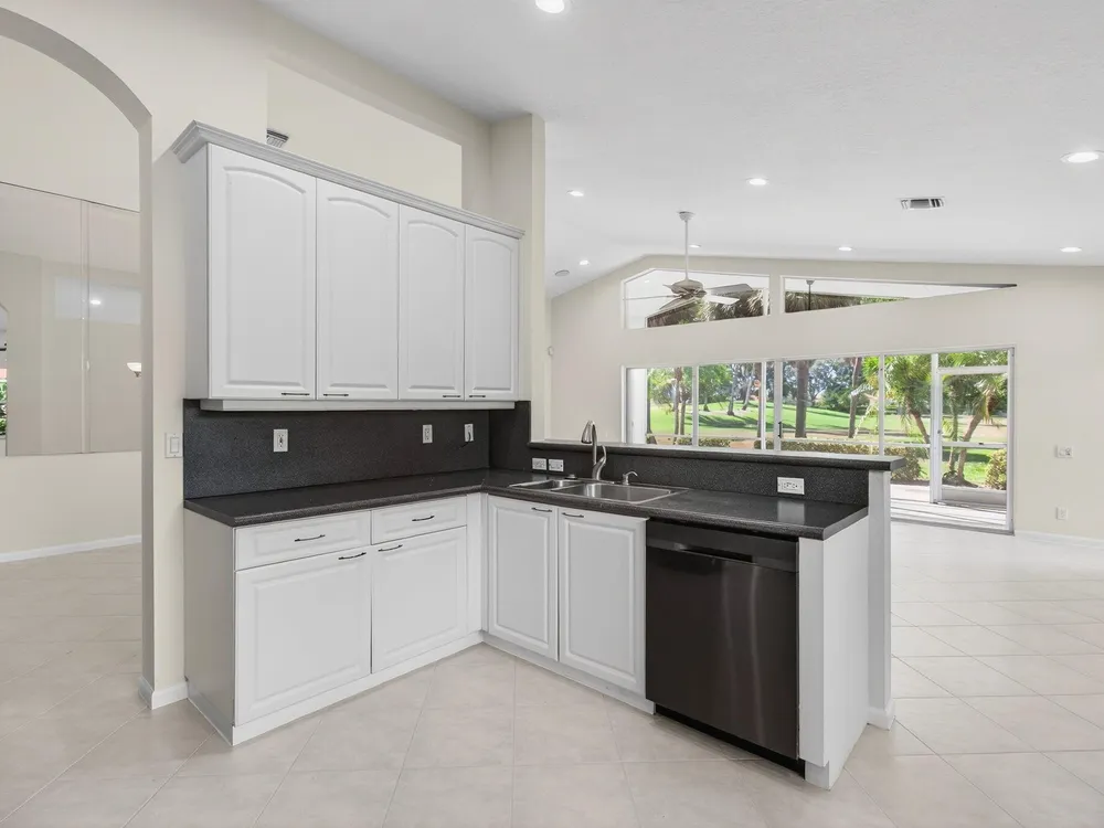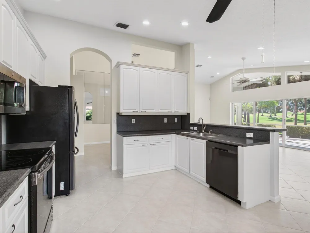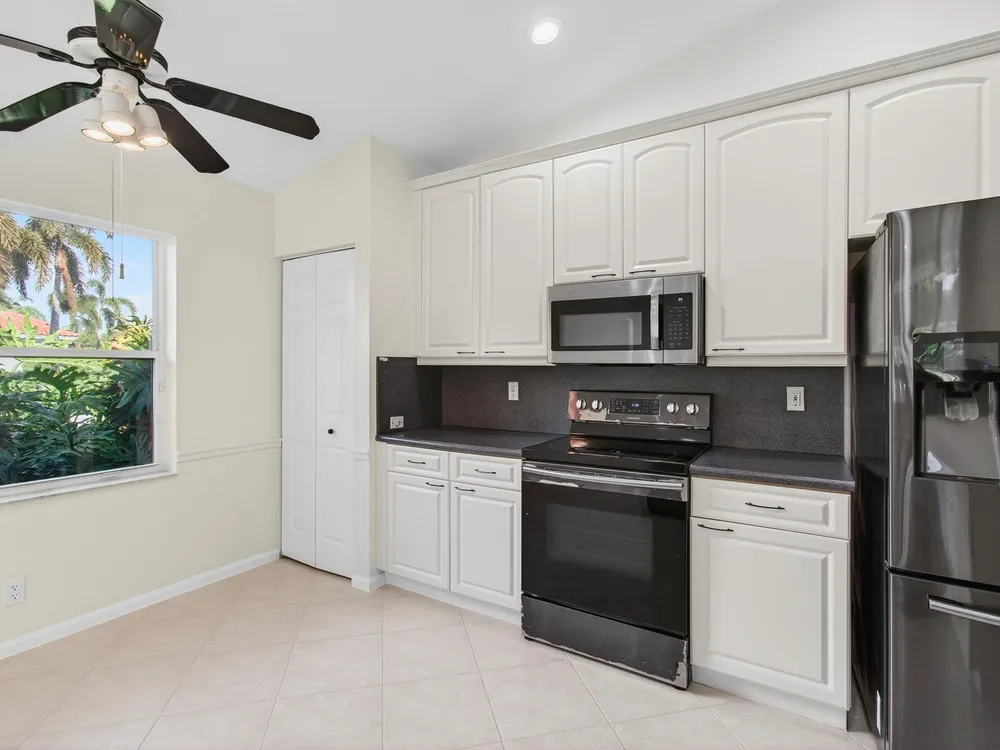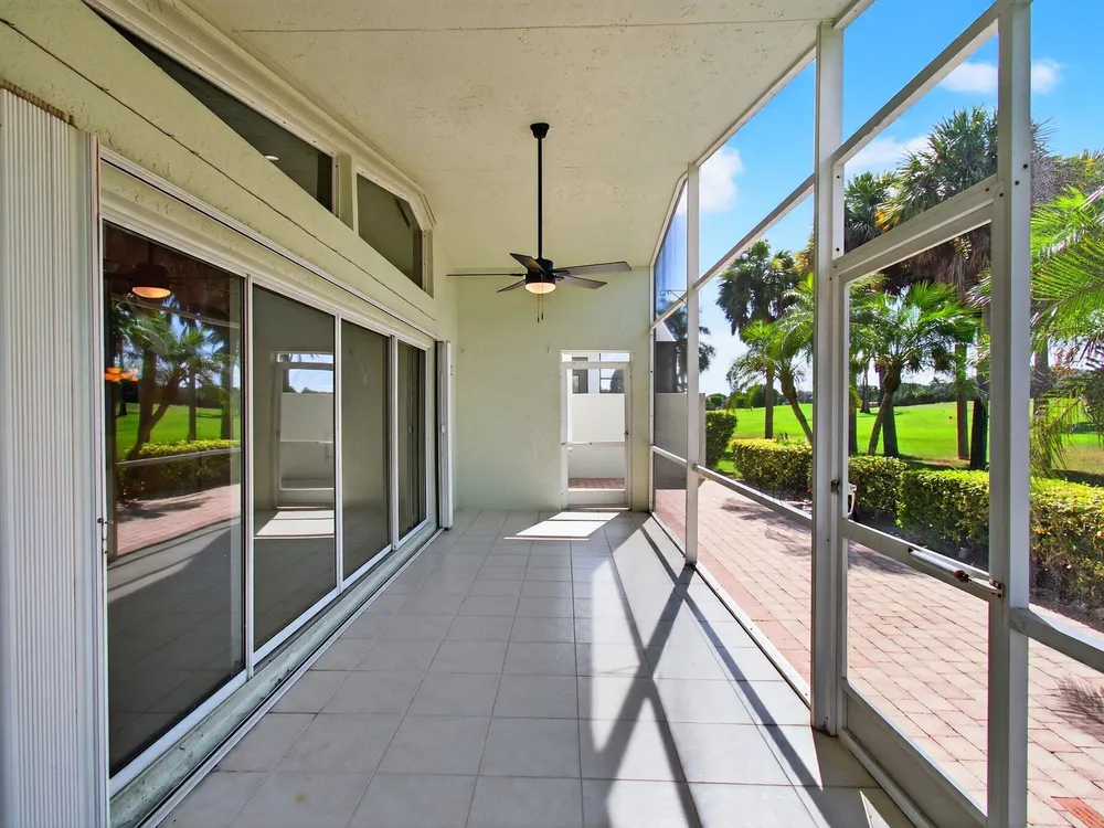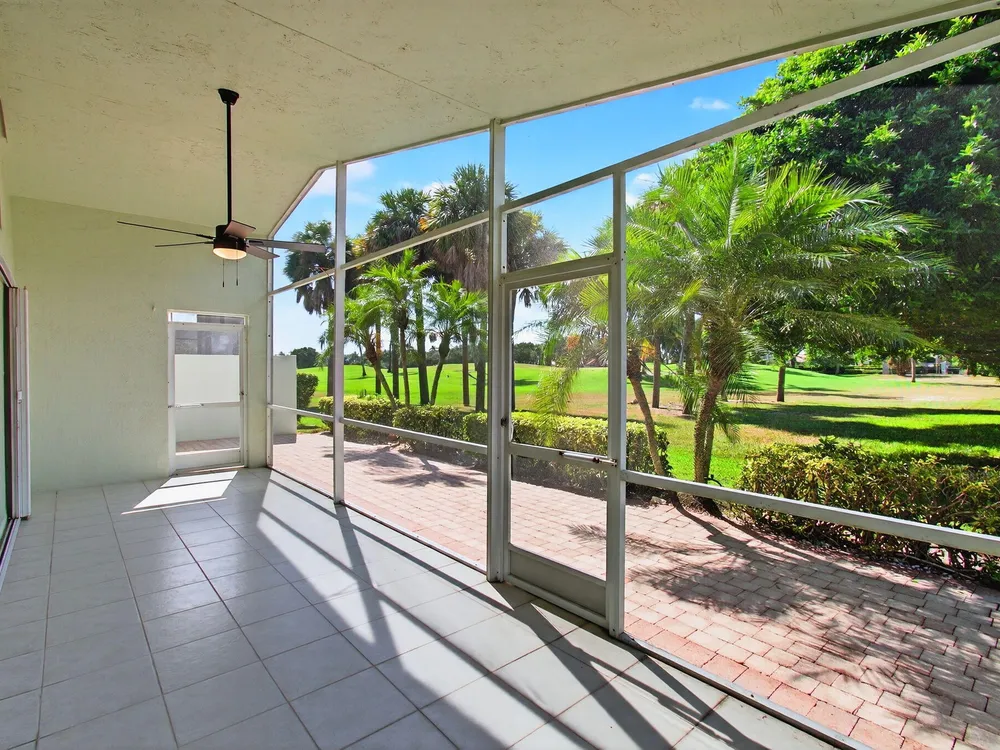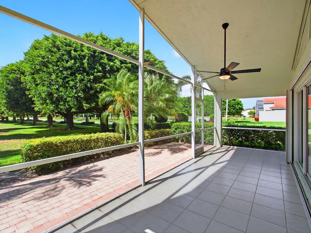 Wake up to gorgeous golf course views in this 2-bedroom plus den Balmoral floor plan home in the desirable Cascades community of Boynton Beach. This corner home offers over 1,800 sq. ft. of open living space with tile flooring throughout and a bright, airy layout that seamlessly connects the living, dining, and kitchen areas.The kitchen features black stainless steel appliances and an eat-in area that overlooks the golf course, making it the perfect spot to enjoy your morning coffee or host casual meals with friends. The split bedroom layout ensures privacy, with the second bedroom and full bath located at the front of the home. The primary suite includes a walk-in closet, double sinks, and a separate tub and shower, creating a serene retreat.