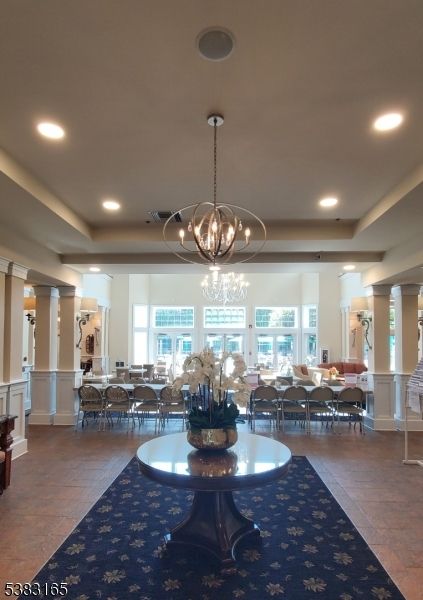 Immaculate, move-in-ready TOP FLOOR unit in building 7 is conveniently located NEXT TO THE CLUB HOUSE of this scenic community. This 1768 SF Colfax model, a Del Webb 55+ Active Adult Community has beautiful upgrades throughout. Enter into this meticulously maintained unit and immerse yourself in the large, sun filled open living space. The foyer leads into a bright living room & dining room next to a den separated by beautiful French doors. LR, DR, and den floors are hardwood, the 2 BDRS carpet. The modern EIK has tile floor, decorative tile backsplash, wood cabinets, a pantry, & white appliance. Off the kitchen is a storage/laundry room with stackable washer and dryer. There are ceiling fans, and decorative moldings throughout and plenty of large closets with CUSTOM BUILT ORGANIZERS & plenty storage space. The 2 Baths have CERAMIC TILE TUBS. Enjoy beautiful views from the balcony just off LR. This unit comes with 1 under the building deeded parking spot. Wanaque Reserve offers wonderful water features, views of the Ramapo Mountains, close to walking trails, close to shops and major highways. The complex was completely renovated in 2022. The 20,000 SF clubhouse has a large open lounge with fireplace, cafe , ballroom, movie theater, exercise room, sauna, indoor and outdoor pool, billiards room, arts & crafts room and more than 40 clubs & activities including pickleball, tennis, Mah Jong, canasta, poker, travel, & so much more. This community is a 24/7 gated community
