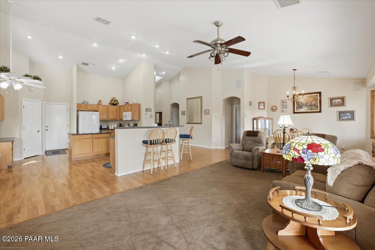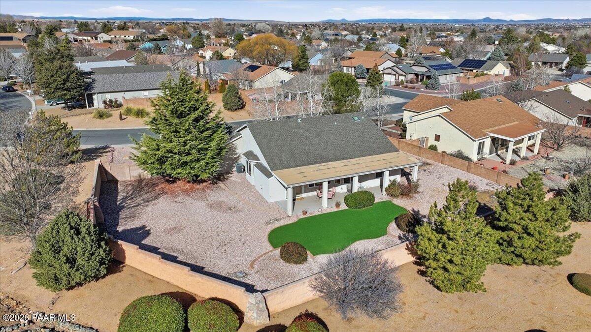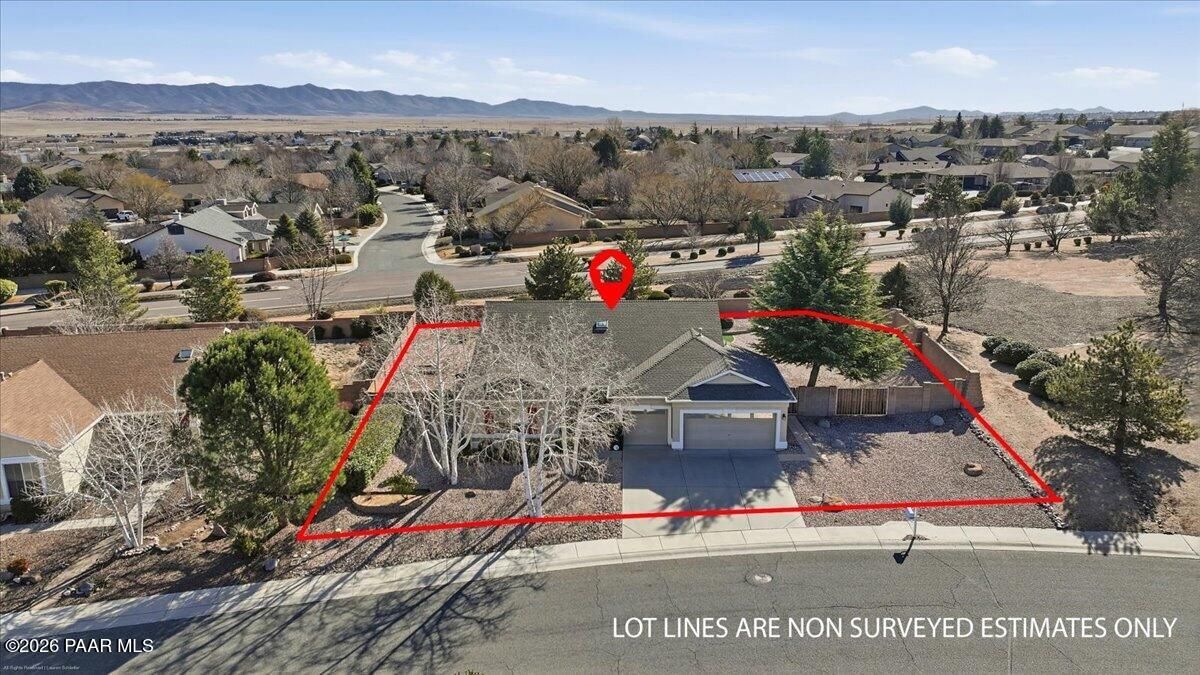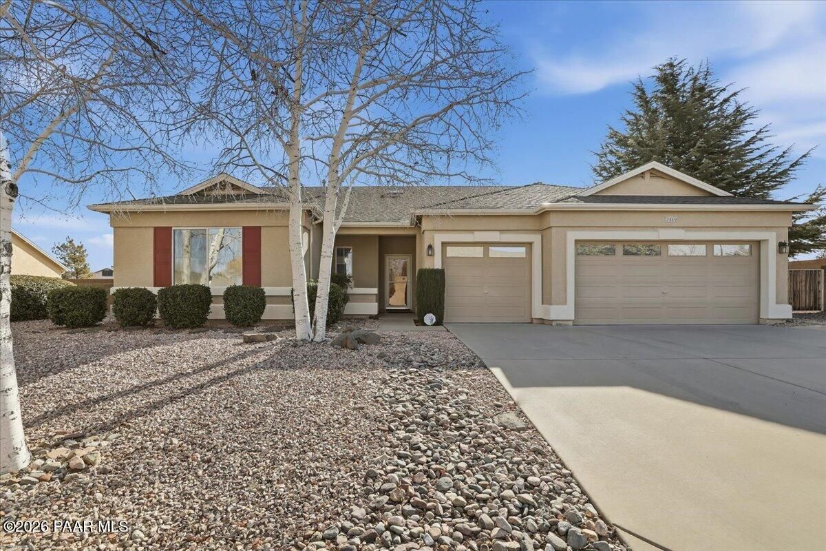 Turn-key home on a spacious, fully fenced .32-acre lot with Mingus Mountain views, ideally located next to Antelope Valley Park. This 1,963 sq ft residence offers 3 bedrooms, 2 bathrooms, and a generous 3-car garage. The open-concept kitchen features Corian countertops, dual islands, a cook's desk, vaulted ceilings, a walk-in pantry, and a bay-window dining area. Interior highlights include wood laminate and carpet flooring, lighted ceiling fans, two-panel doors with brushed-nickel hardware, wood shutters, sound wiring, and double French doors leading to a full-length covered back patio. The primary suite includes a glass-enclosed shower, executive-height marble vanity, walk-in closet, and private toilet room. The expansive backyard offers artificial turf, mature trees, a raised garden area, and both 4-foot and 8-foot gates for easy access. Functional, private, and truly move-in ready. Schedule your showing today.