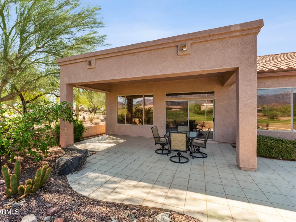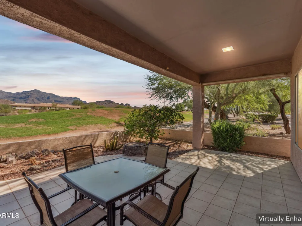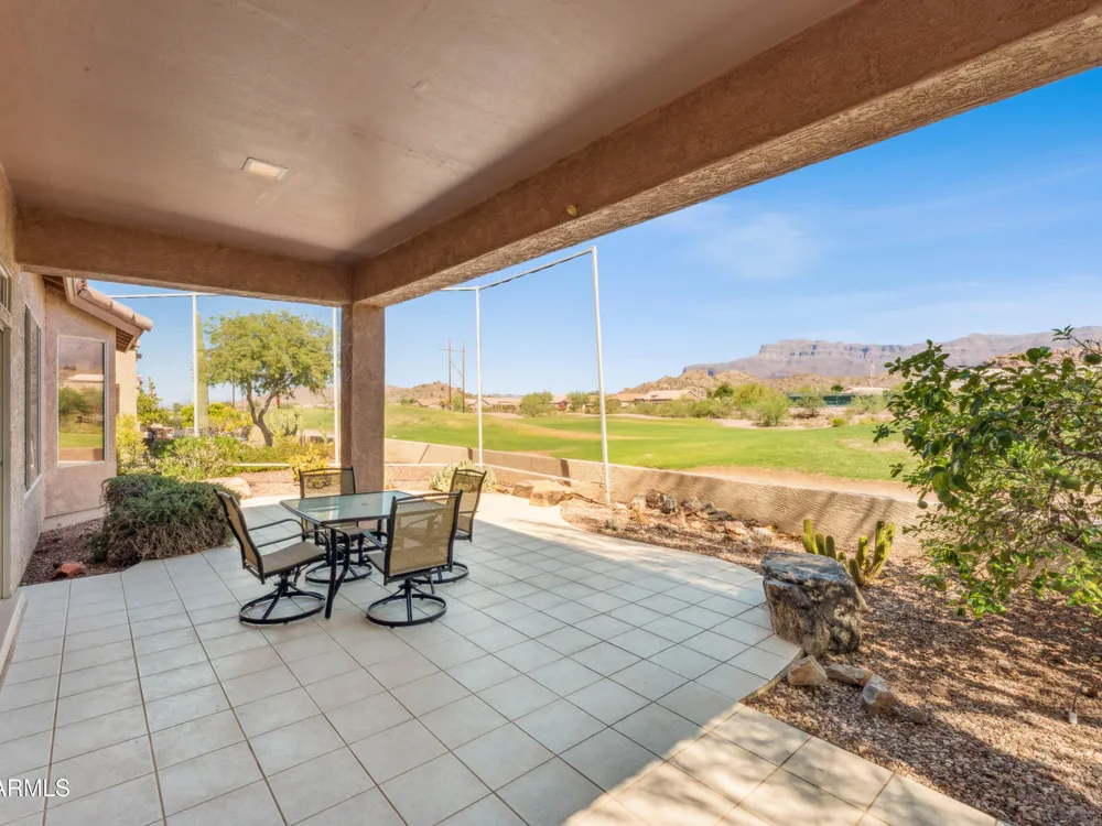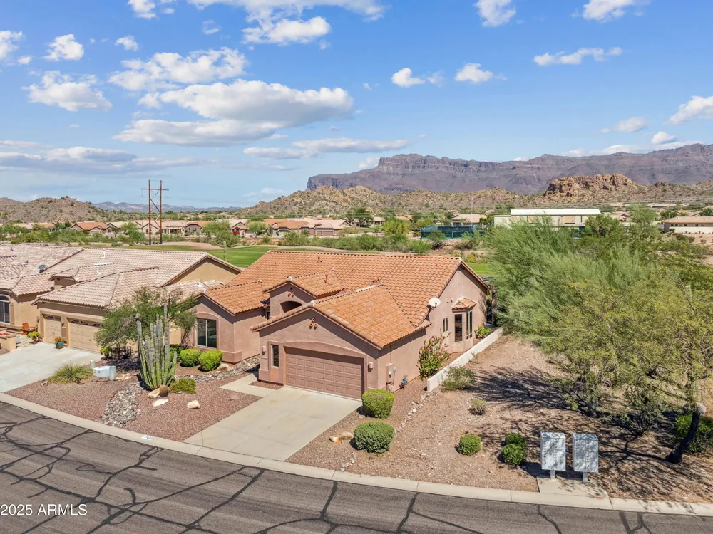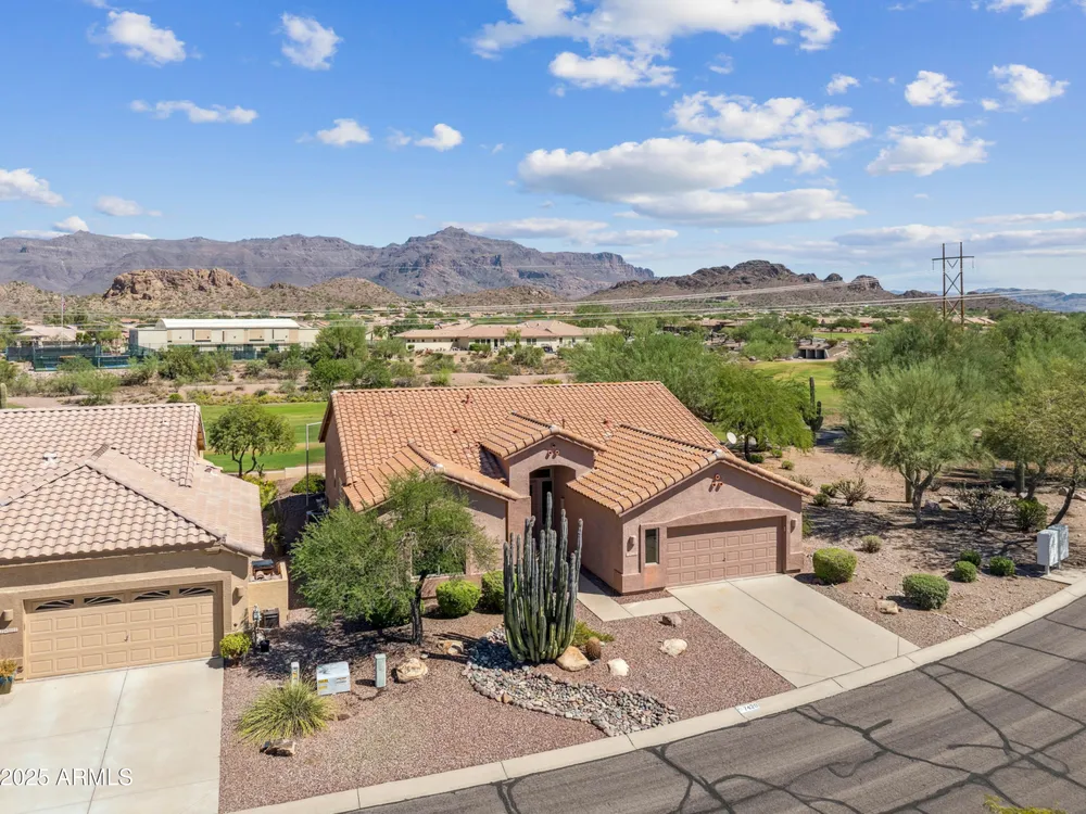 Prime MountainBrook Golf Course Location! Overlooking the 18th fairway with Superstition Mountain views. NEW ROOF & REFRIGERATOR IN 2025. This 3BR/2BA home offers privacy with no neighbors behind and spacious common area on the right side. Entertain and enjoy sunsets under your covered rear patio while the mountains glow pink at sunset. Features include a wall of windows in the great room, large breakfast bar with kitchen dinette, 2 ½-car garage with storage. Live the best of active adult living with top-notch amenities, public golf, and on-site dining-nestled at the base of the Majestic Superstition Mountains.