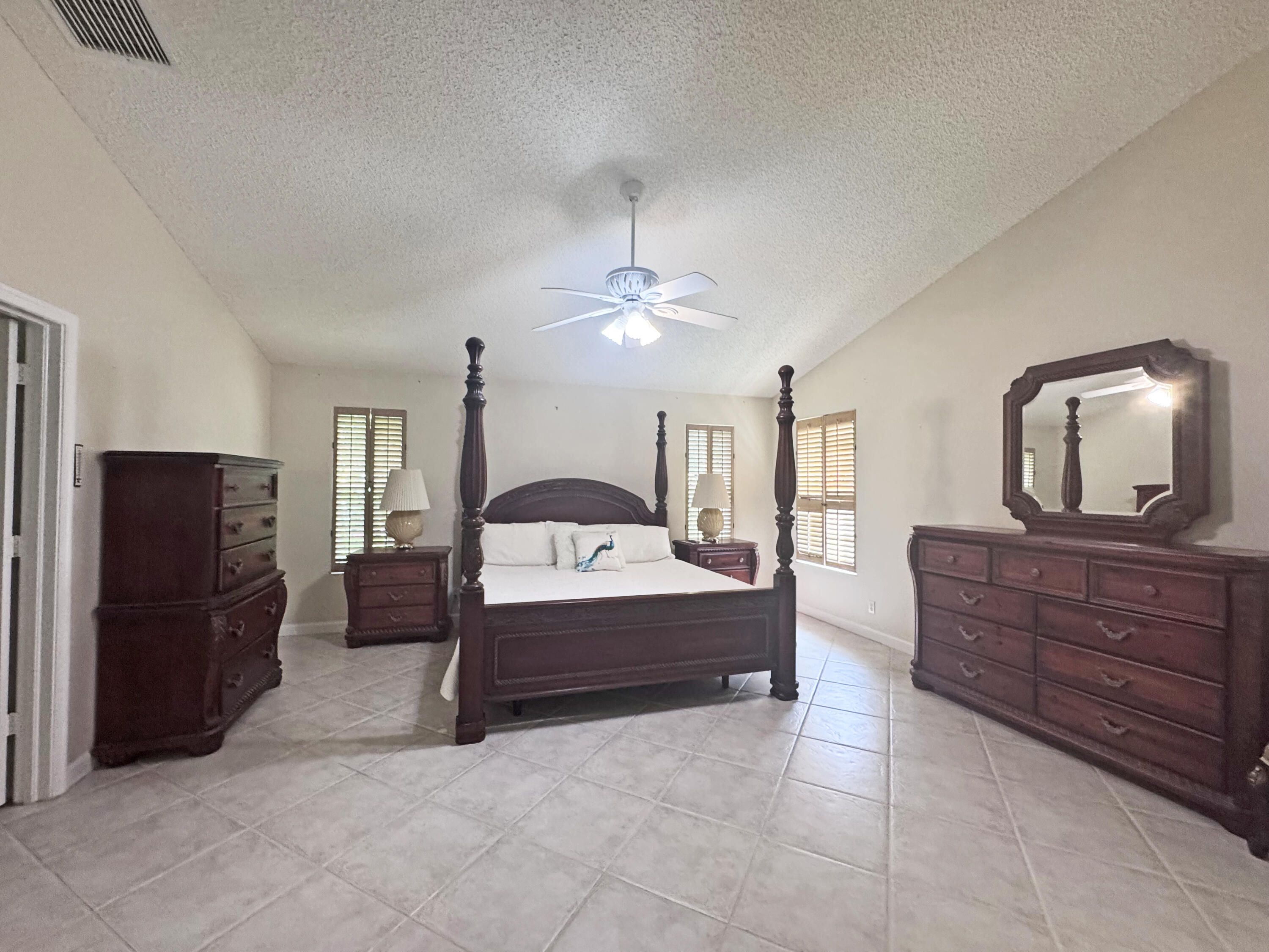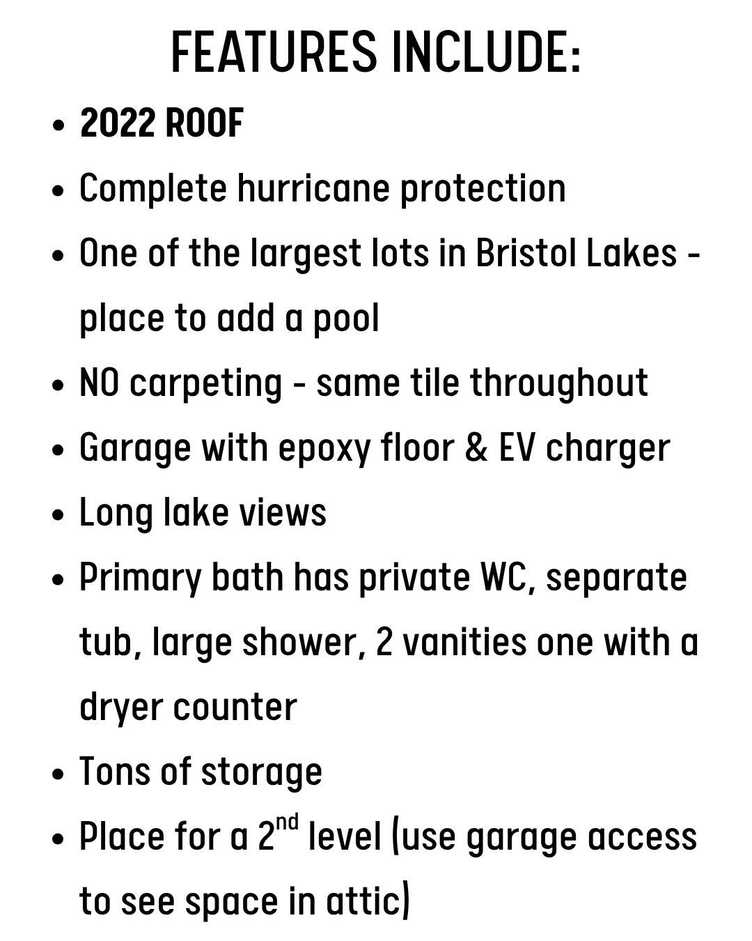 This lake-view home is in an all-ages, gated community on a large waterfront lot. Its almost 3,000 sq.ft. is made even more grand by its vaulted ceilings. There are 3 bedrooms, family room, living room, dining area, kitchen eat-in area, PLUS a flex space that can be used as a den or enclosed as an extra bedroom. The kitchen has granite, breakfast bar, counter lights & pantry. The main bedroom has a walk-in and double-wide closets, and a bathroom with a shower, separate tub and private WC. The screened, covered patio has views of the garden, pond, and a long view of the lake & fountain. The 2022 roof, accordion shutters, & front impact windows protect this spacious home. The garage has epoxy floors & EV charger. No mandatory country club fees. Aberdeen Golf & Country Club is optional.