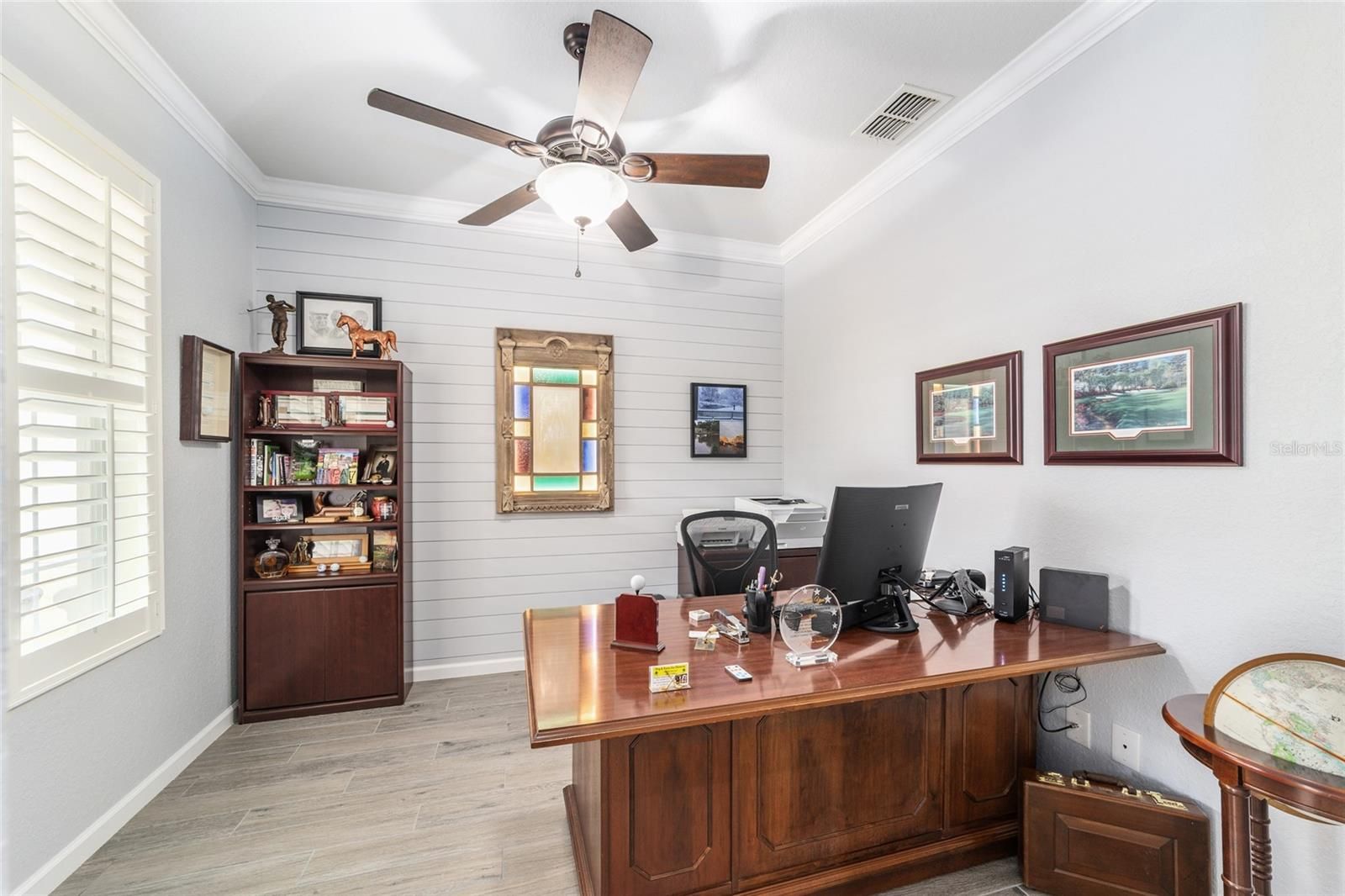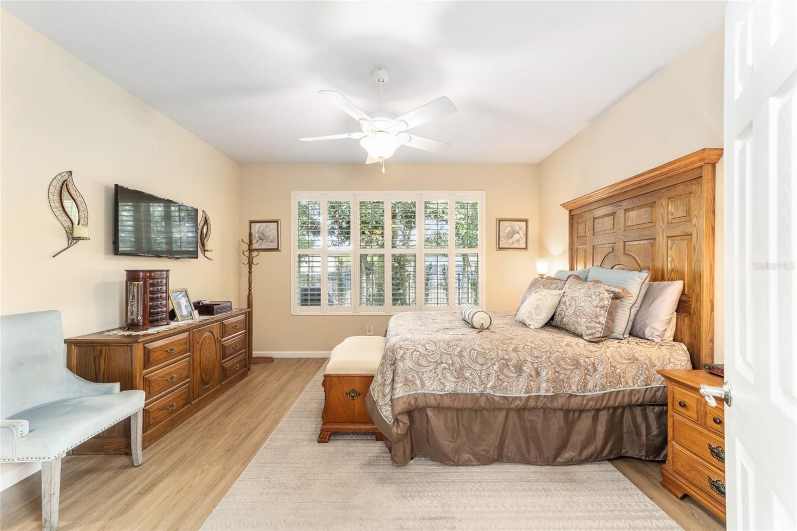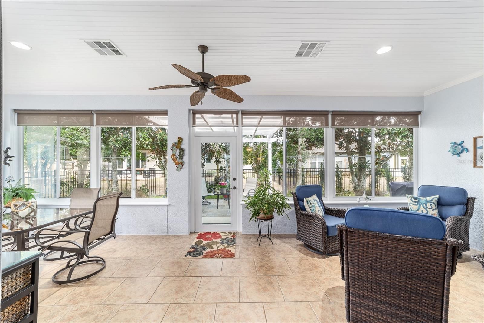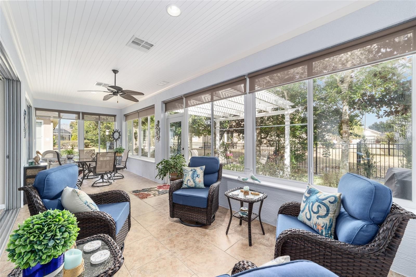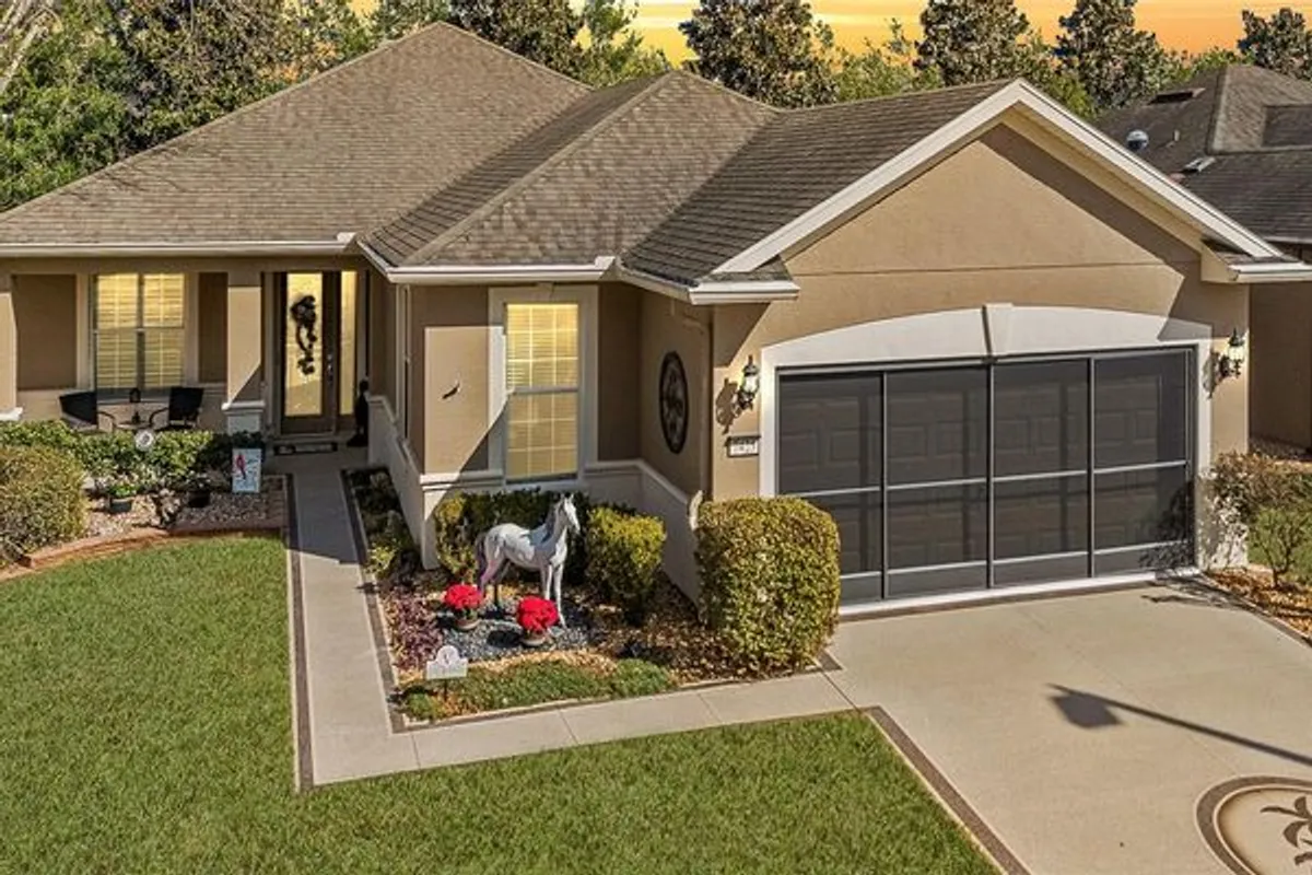Resort-style living comes naturally in this spacious Shenandoah model, ideally located in the Arlington neighborhood of the gated, 55+ Stone Creek Golf Course Community. Thoughtfully designed for comfort and flexibility, this home offers 2 bedrooms, 2 baths, a versatile flex room, an extended garage, and a large climate-controlled lanai for year-round enjoyment. Curb appeal impresses immediately with a painted driveway and walkway, mature landscaping, and a welcoming front porch with a glass-inset entry door. Inside, the light-filled living area features luxury vinyl plank flooring and Plantation shutters throughout, creating a clean and cohesive look. The gathering room showcases high ceilings, elegant crown molding, and a full wall of sliding glass doors that open seamlessly to the climate-controlled four-season lanai. This inviting space includes a bead-board ceiling and finished window ledges, making it perfect for relaxing or entertaining. The flex room, enhanced with barn doors and a striking shiplap accent wall, offers an ideal setting for a home office or den. The Chef’s kitchen is beautifully appointed with brand-new stainless-steel appliances, granite countertops and sink, upgraded cabinetry with lower pull-outs, a stylish glass tile backsplash, and a convenient pantry. The connecting casual dining area is accented with striking wainscoting and sliders leading to the lanai for effortless indoor-outdoor flow. The Owner’s Suite provides a peaceful retreat with a spacious walk-in closet and French doors opening to the en suite bath. The bath includes a double-sink vanity with dressing table, a large step-in shower with a transom window for natural light, and a private water closet. Outdoor living is equally inviting. An aluminum-fenced backyard with mature landscaping, a paver patio, and a pergola creates a private oasis for evening dinners, morning coffee, or unwinding after a round of golf. The two-car extended garage offers plenty of space for two golf carts and features an insulated garage attic and garage doors. Thoughtful upgrades include high-rise toilets, a new water heater, a new water softener, a WiFi thermostat, a WiFi sprinkler system, and a new roof scheduled for installation, all offering valuable peace of mind. Embrace the exceptional lifestyle of this vibrant community, featuring a 24/7 staffed gated entrance for security and peace of mind. Luxury-inspired amenities include heated pools, a state-of-the-art fitness center, a spa, and relaxing hot tubs and saunas. Stay active with pickleball, bocce, tennis, and a softball field, while a dedicated lifestyle staff curates entertainment, activities, and special events to foster connections. Just beyond the gates, enjoy a golf course, pro shop, and restaurant, perfect for socializing and unwinding. Make your move today and experience resort-style living at its finest!