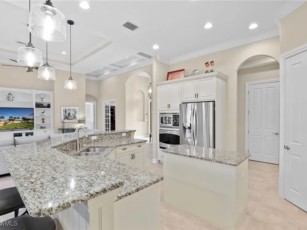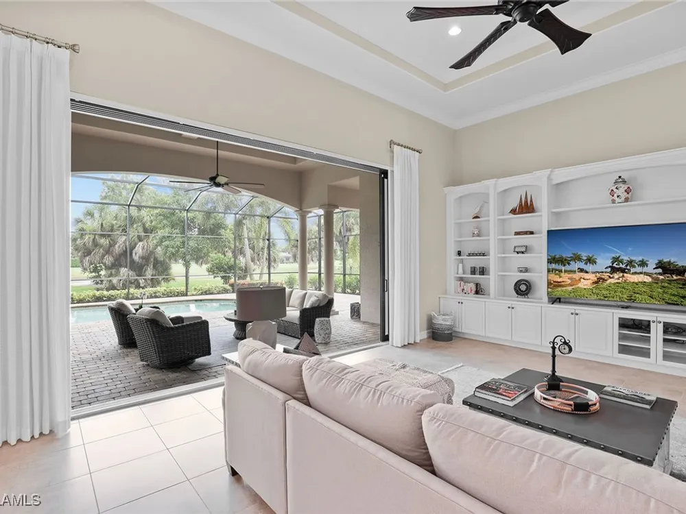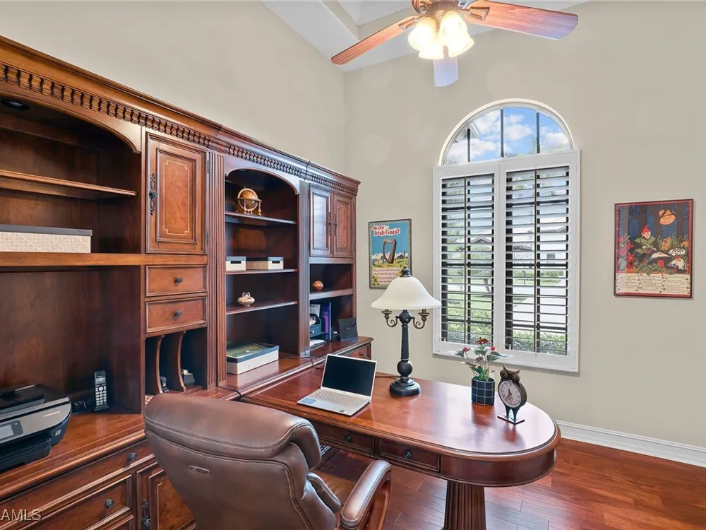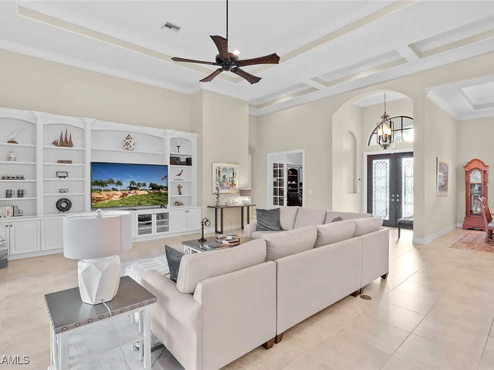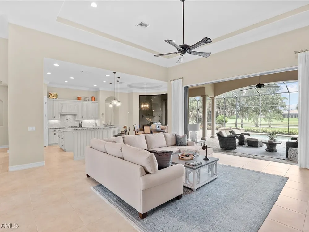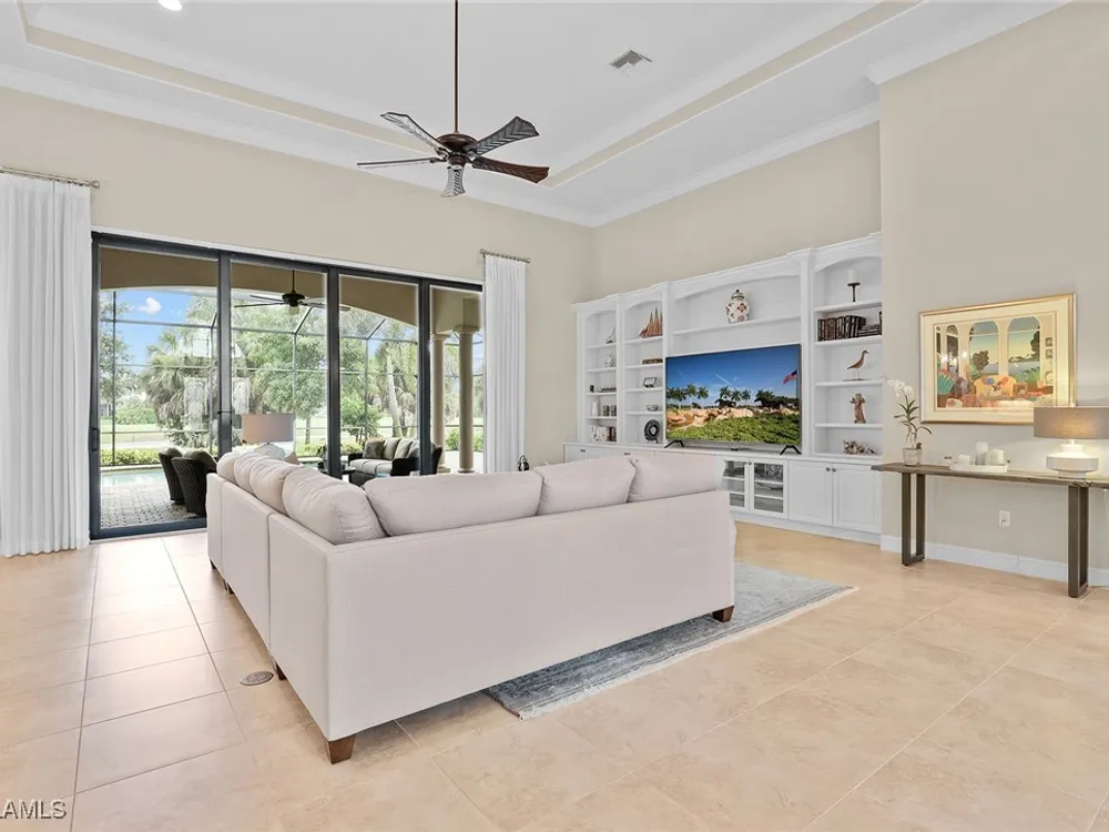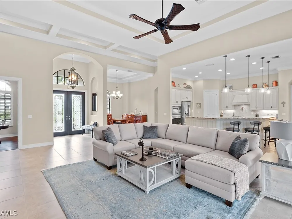 In the esteemed guard-gated Classics Plantation Estates at Lely Resort, this stunning great-room Muirfield model is a standout. Positioned on a generous premium lot with serene golf course vistas, this impeccably maintained estate offers ample space with four bedrooms, a den, and 3.5 bathrooms. Brimming with modern enhancements, it features plantation shutters, electric rolldown hurricane shutters, custom built-ins, fresh paint, and elegant crown molding throughout. The expansive covered lanai includes a vented gas outdoor kitchen, while the large screened area envelops a heated pool and spa, creating an entertainer’s paradise. The gourmet kitchen has custom light wood cabinetry, granite countertops, stainless steel appliances, gas cooktop and walk-in pantry. Conveniently just minutes from the beaches of Old Naples and Marco Island. Enjoy the highly renowned Players Club & Spa which offers resort-style swimming pools, state-of-the-art tennis and pickleball facility, fitness center, bocce ball, several restaurants, tiki bar and grill, billiards room, theater room and spa. Lely Resort is also home to three championship 18-hole golf courses.