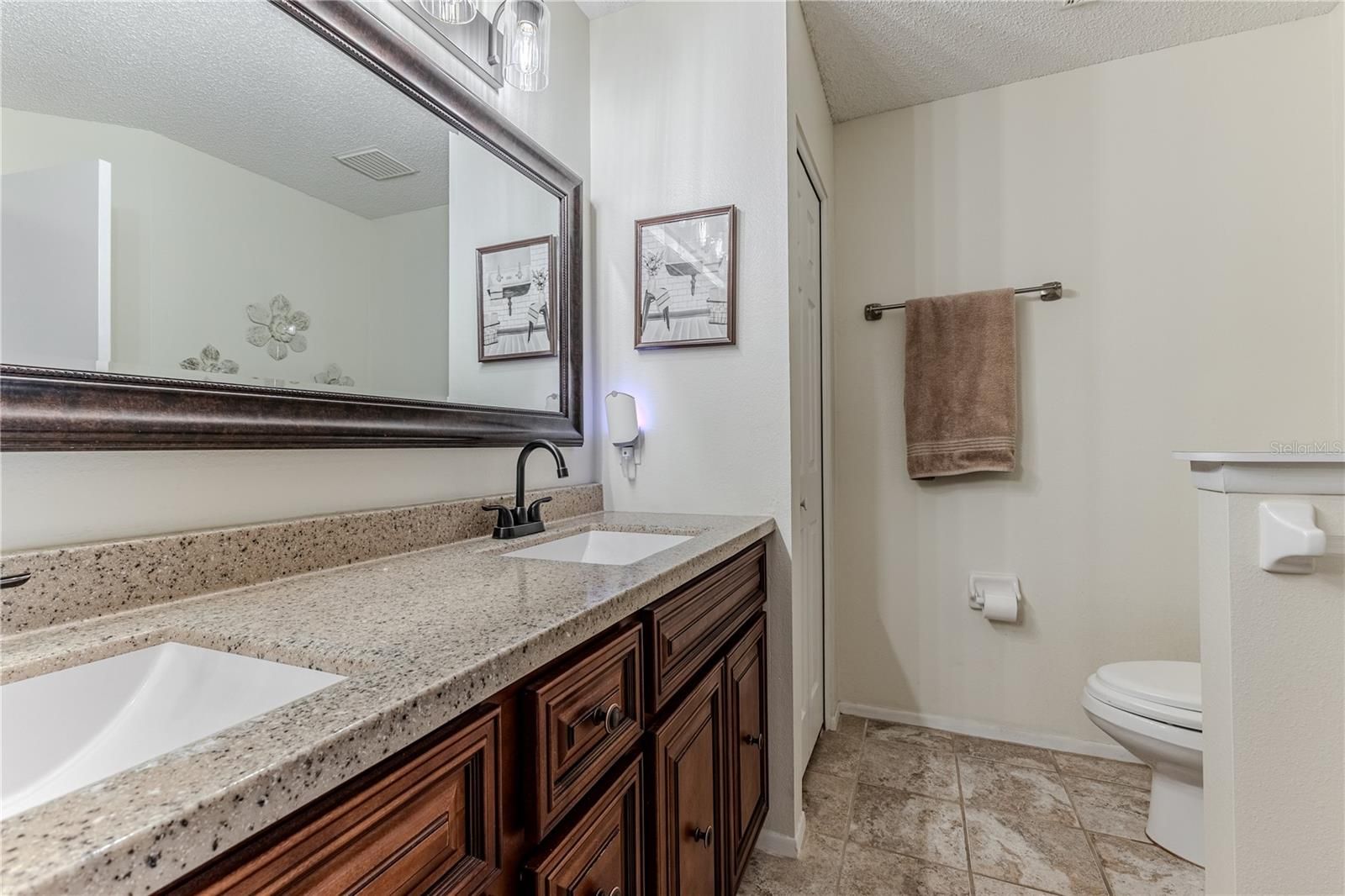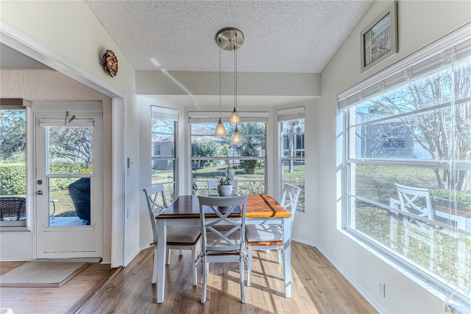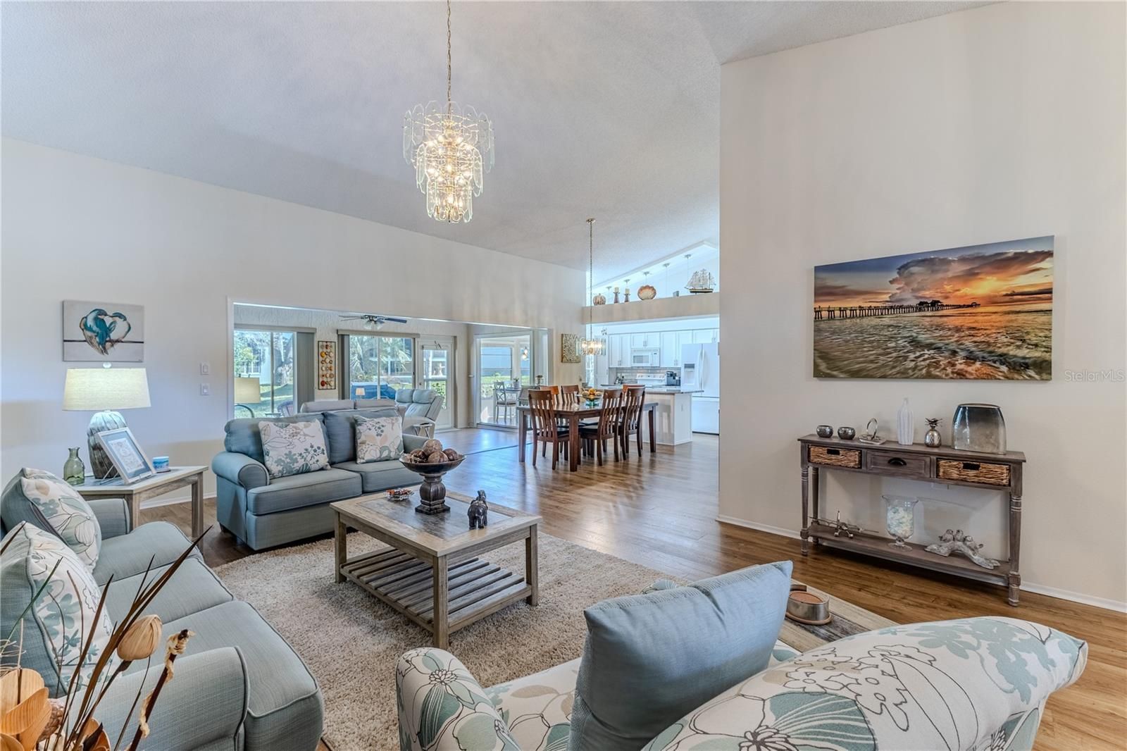 Desirable end-unit villa offering 2 bedrooms, 2 bathrooms, and a spacious 2-car garage is furnished and includes the golf cart. The vaulted ceilings in the living and dining room combination create an open, airy feel, complemented by elegant chandeliers and wood-look laminate flooring throughout the main living areas. The beautifully updated kitchen features white cabinetry, granite countertops, designer pendant lighting, closet pantry plus an additional storage pantry, and a bright eat-in area overlooking the retention area and golf course. The extended family room offers additional living space and includes a ceiling fan for comfort. Step outside to enjoy peaceful golf course views from your private rear patio, complete with a concrete pad ideal for grilling and outdoor furnishings. The guest suite is thoughtfully positioned at the front of the home and can be closed off with a pocket door for privacy. It features an updated full bathroom with a stylish vanity, tile flooring, and a tub/shower combination. The guest bedroom includes an oversized walk-in closet offering exceptional storage space. The primary bedroom overlooks the serene backyard and includes two large walk-in closets and a ceiling fan. The primary bath features a spacious walk-in shower with dual showerheads, dual sink vanity, linen closet, wood cabinetry, and beautiful tile flooring. Additional highlights include an interior laundry room with utility sink, washer and dryer included, and shelving for storage. The garage offers built-in shelving, a workbench, pull-down attic access, and a convenient side service door for easy entry. Roof 2020. HVAC 2017. A note for the animal lovers - this village is a no-dog zone. Maintenance covers exterior painting, irrigation, lawnmowing, front hedge trimming, lawn fertilization, cable tv, internet, village pool -- simplifying ownership and freeing up your time. Timber Pines is an award-winning, guard-gated, 55+ community, where residents enjoy three 18-hole golf courses, a 9-hole pitch & putt, 12pickleball courts, tennis, two community pools, a country club restaurant and bar, fitness center, performing arts, billiards, and over 100social clubs and activities. The villa offers a peaceful, beautiful view and an easy-care lifestyle.