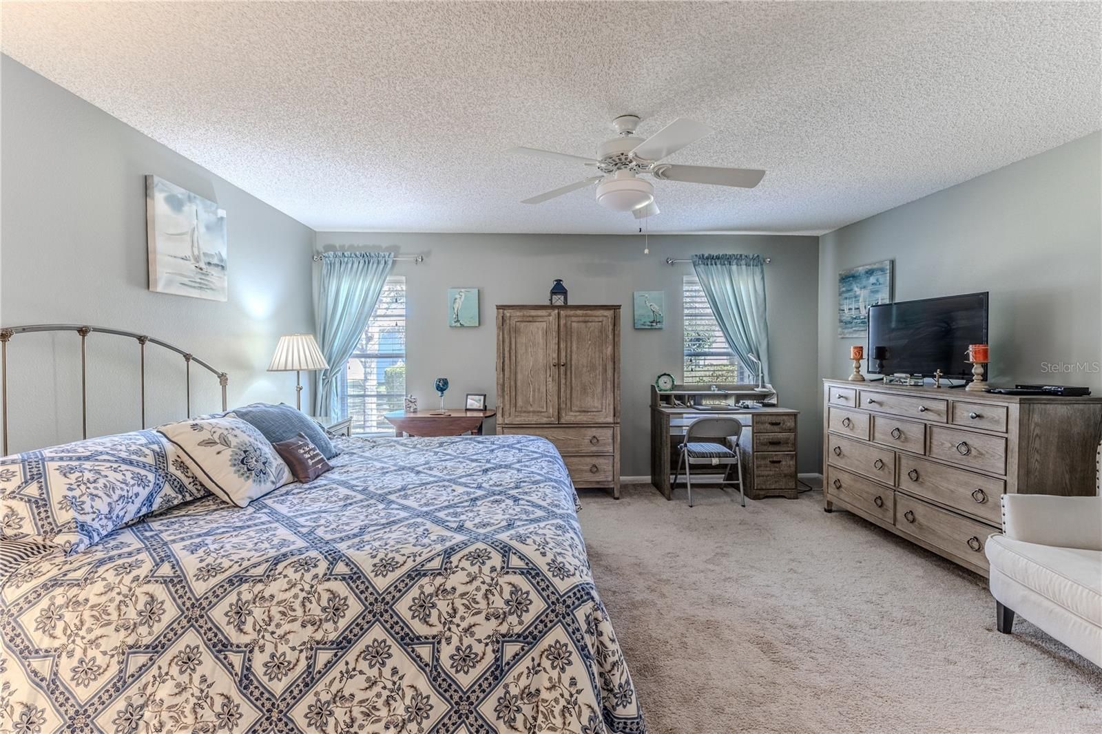- Ceiling Fan(s), Eat-in Kitchen, High Ceilings, L-Shaped Dining Room, Living/Dining Room, Open Floorplan, Main Level Primary, Solid Surface Counters, Solid-Wood Cabinets, Stone Counters, Vaulted Ceiling(s), Walk-In Closet(s), Window Treatments