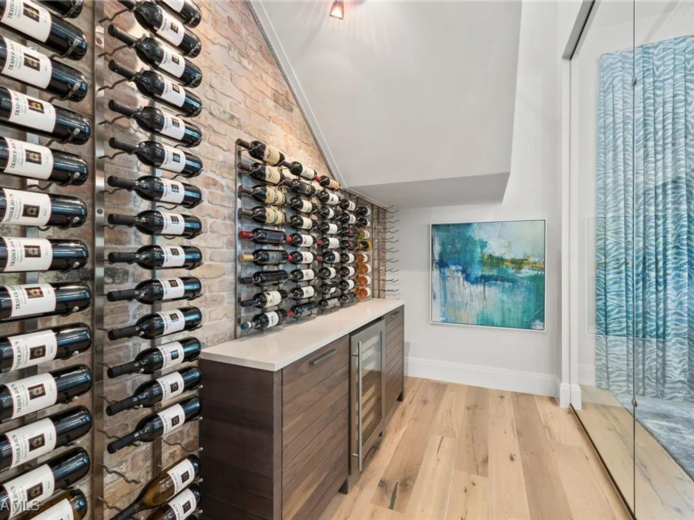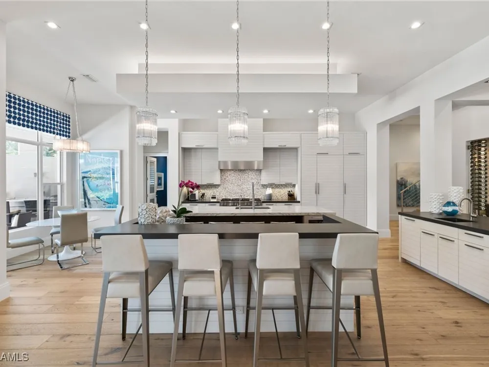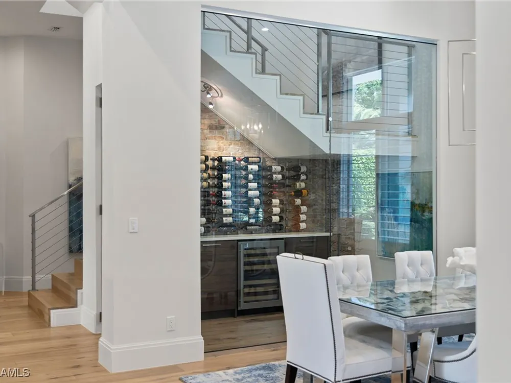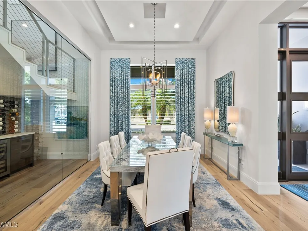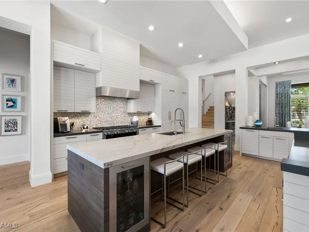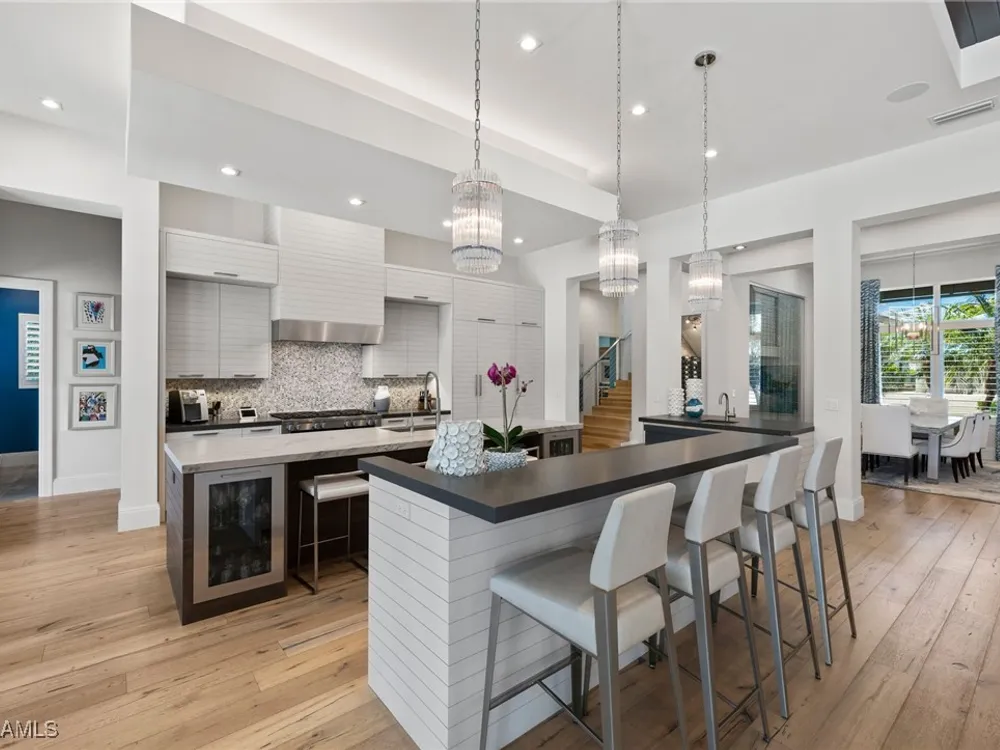 Welcome to 745 Riviera Drive — a stunning Modern Transitional masterpiece nestled on one of the most prestigious streets in The Moorings. This award-winning residence offers a rare blend of timeless architecture, cutting-edge technology, and sophisticated Florida living at its finest. Spanning 4,912 sq. ft. under air, this custom-built home features 4 spacious bedrooms, 4.5 designer bathrooms, a private office, bonus room, gym, and 3 car garage offering both comfort and flexibility. Wide-plank wood flooring flows throughout the main living area, complementing the clean lines and warm textures that define this home’s architectural elegance. The heart of the home is a chef’s dream kitchen, featuring custom cabinetry, dual islands, two dishwashers, two beverage drawers, a wet bar with ice maker, and top-of-the-line appliances including a Miele 8 burner gas cook top all seamlessly integrated withControl4 Smart-Home technology for lighting, audio, televisions and HVAC. A true showstopper, the brick-walled wine room is framed by a dramatic floating staircase with stainless steel cable railings and a sleek glass enclosure—perfectly blending form and function. The spa-inspired primary suite offers a serene escape, with floating walnut vanities, pearlized glass tile accents, and concrete-style flooring that add modern sophistication to the luxurious bath. Designed for the ultimate in indoor-outdoor living, the approx. 1,000 sq. ft. outdoor living area includes a brick-wrapped. fireplace, summer kitchen with refrigerator, gas grill, and built-in ice cooler—ideal for entertaining year-round. Enjoy the Florida sun by the oversized pool and spa, surrounded by striking fire bowls, lush landscaping, and thoughtful design to maximize privacy and ambiance. Additional highlights include: full-home generator, electric hurricane and screens on the lanai, three brand-new A/C units, two laundry rooms, linear indoor fireplace and meticulously curated furnishings. This home is a rare opportunity to own a one-of-a-kind residence in The Moorings—proximity to Moorings Private Beach, shopping and dining while offering unmatched quality, location, and lifestyle.X FLOOD ZONE AND SITS 13 FT IN ELEVATION.