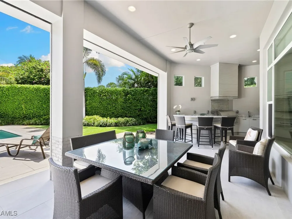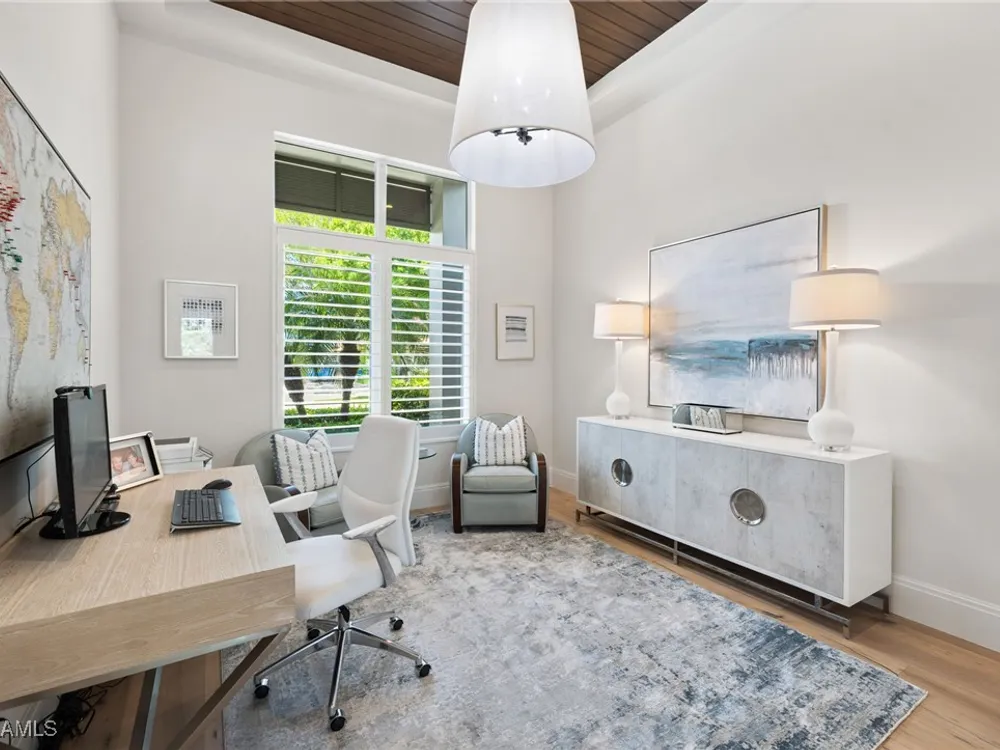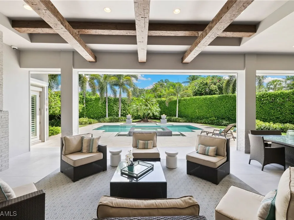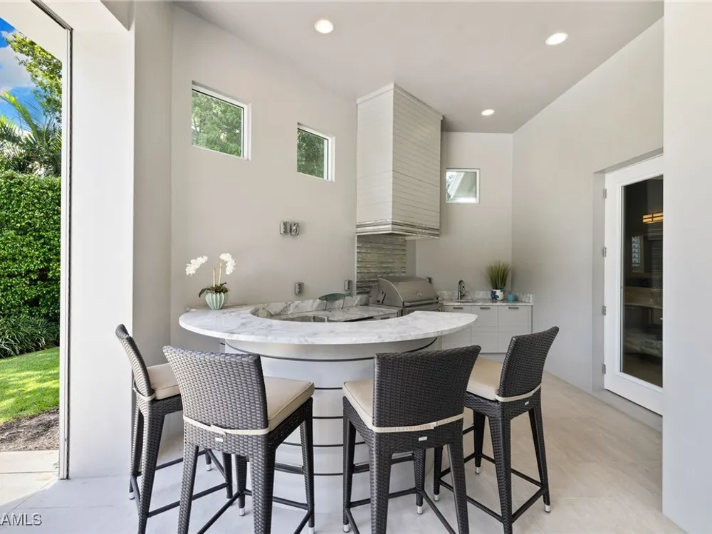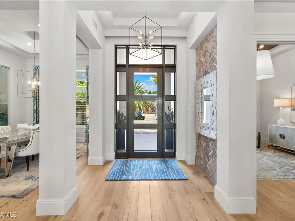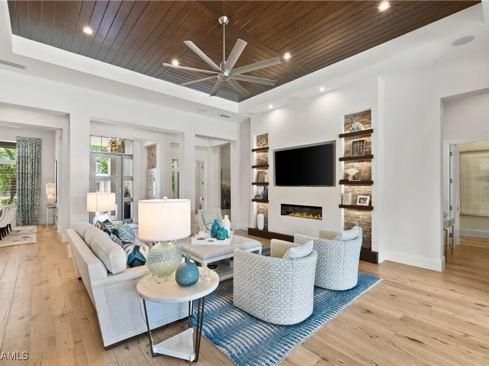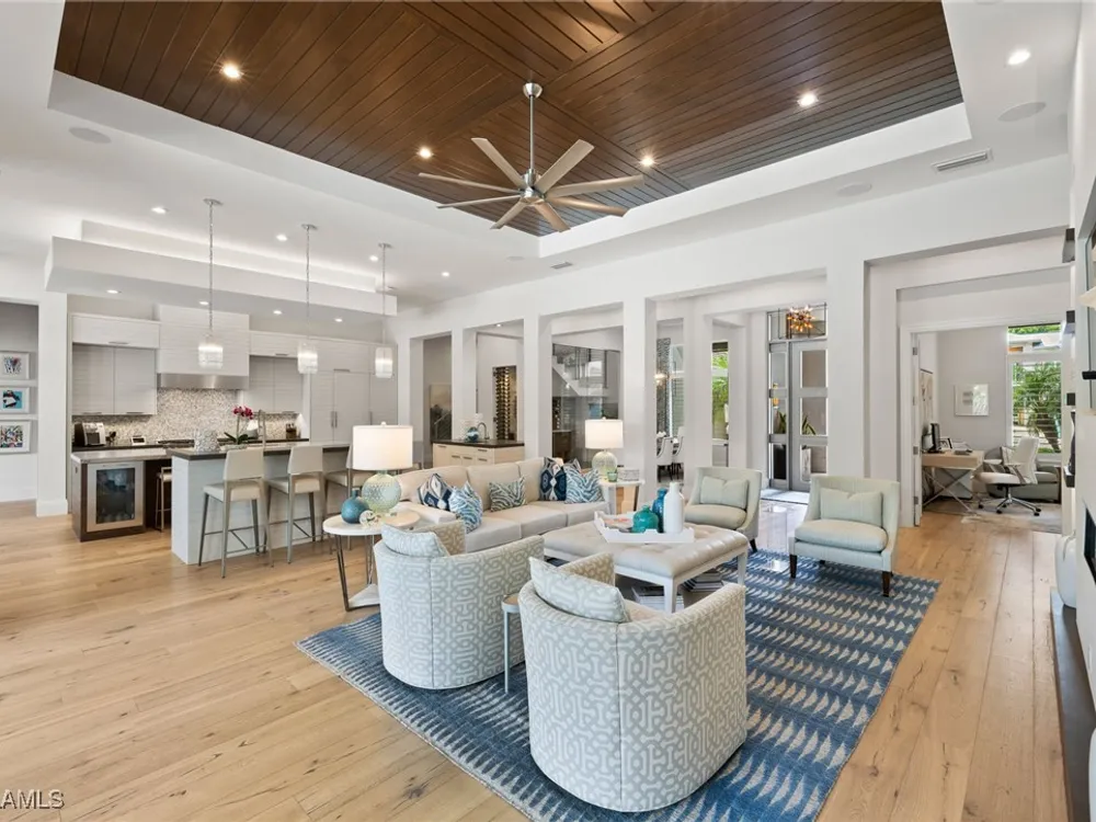 Welcome to 745 Riviera Drive — a stunning Modern Transitional masterpiece nestled on one of the most prestigious streets in The Moorings. This award-winning residence offers a rare blend of timeless architecture, cutting-edge technology, and sophisticated Florida living at its finest. Spanning 4,912 sq. ft. under air, this custom-built home features 4 spacious bedrooms, 4.5 designer bathrooms, a private office, bonus room, gym, and 3 car garage offering both comfort and flexibility. Wide-plank wood flooring flows throughout the main living area, complementing the clean lines and warm textures that define this home’s architectural elegance. The heart of the home is a chef’s dream kitchen, featuring custom cabinetry, dual islands, two dishwashers, two beverage drawers, a wet bar with ice maker, and top-of-the-line appliances including a Miele 8 burner gas cook top all seamlessly integrated withControl4 Smart-Home technology for lighting, audio, televisions and HVAC. A true showstopper, the brick-walled wine room is framed by a dramatic floating staircase with stainless steel cable railings and a sleek glass enclosure—perfectly blending form and function. The spa-inspired primary suite offers a serene escape, with floating walnut vanities, pearlized glass tile accents, and concrete-style flooring that add modern sophistication to the luxurious bath. Designed for the ultimate in indoor-outdoor living, the approx. 1,000 sq. ft. outdoor living area includes a brick-wrapped. fireplace, summer kitchen with refrigerator, gas grill, and built-in ice cooler—ideal for entertaining year-round. Enjoy the Florida sun by the oversized pool and spa, surrounded by striking fire bowls, lush landscaping, and thoughtful design to maximize privacy and ambiance. Additional highlights include: full-home generator, electric hurricane and screens on the lanai, three brand-new A/C units, two laundry rooms, linear indoor fireplace and meticulously curated furnishings. This home is a rare opportunity to own a one-of-a-kind residence in The Moorings—proximity to Moorings Private Beach, shopping and dining while offering unmatched quality, location, and lifestyle.X FLOOD ZONE AND SITS 13 FT IN ELEVATION.