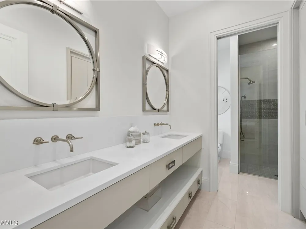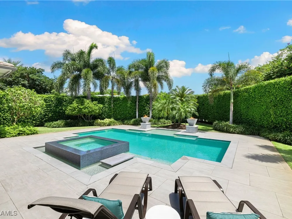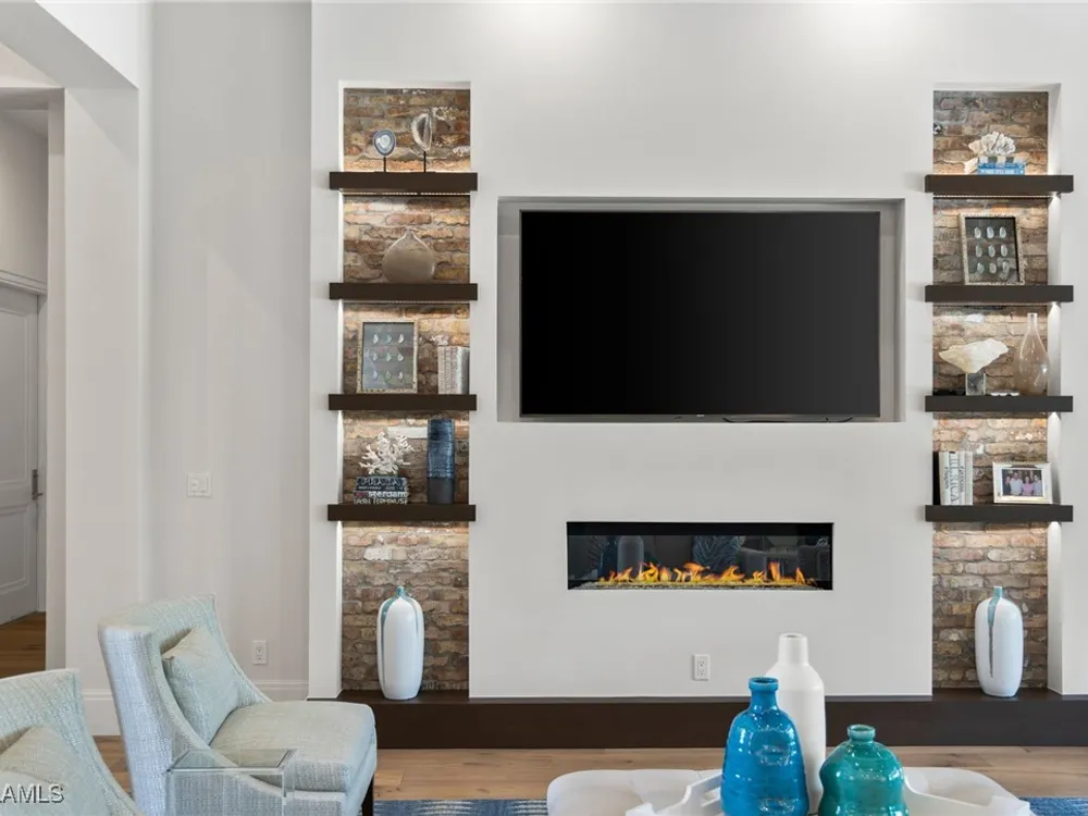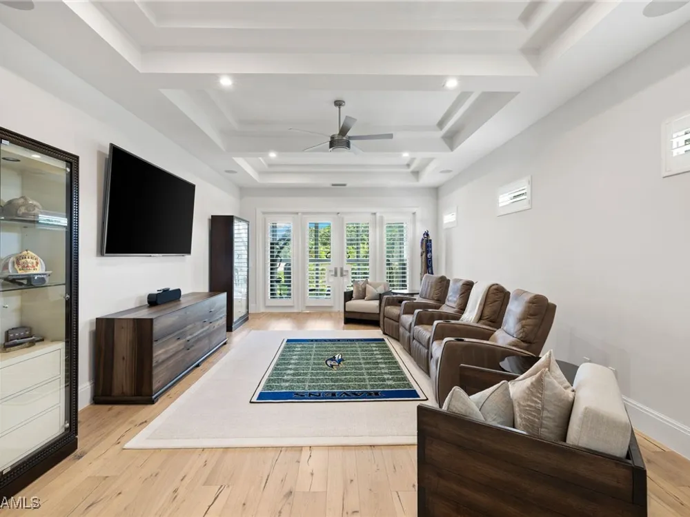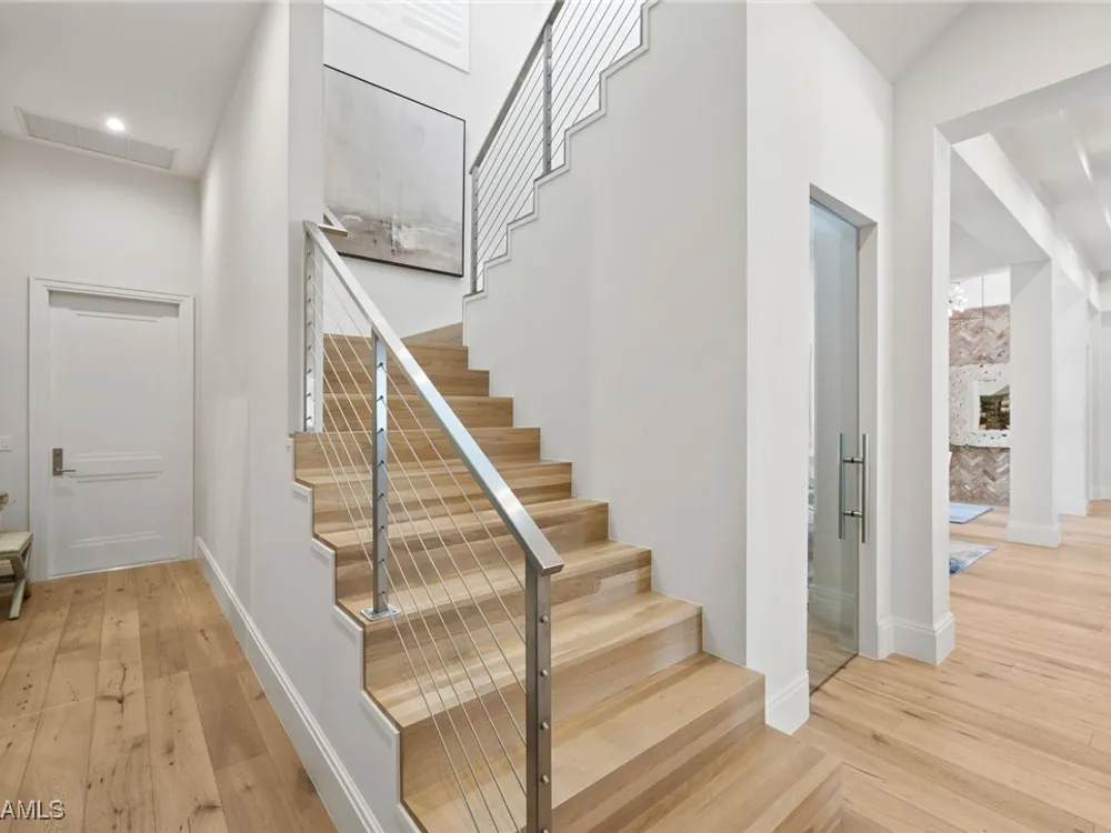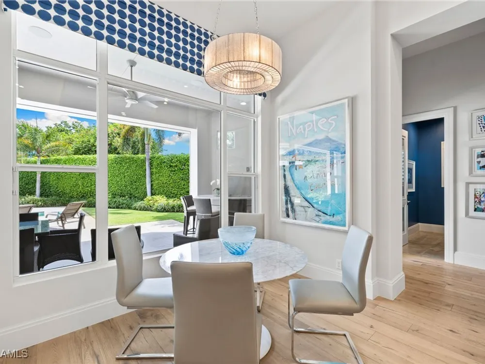 Welcome to 745 Riviera Drive — a stunning Modern Transitional masterpiece nestled on one of the most prestigious streets in The Moorings. This award-winning residence offers a rare blend of timeless architecture, cutting-edge technology, and sophisticated Florida living at its finest. Spanning 4,912 sq. ft. under air, this custom-built home features 4 spacious bedrooms, 4.5 designer bathrooms, a private office, bonus room, gym, and 3 car garage offering both comfort and flexibility. Wide-plank wood flooring flows throughout the main living area, complementing the clean lines and warm textures that define this home’s architectural elegance. The heart of the home is a chef’s dream kitchen, featuring custom cabinetry, dual islands, two dishwashers, two beverage drawers, a wet bar with ice maker, and top-of-the-line appliances including a Miele 8 burner gas cook top all seamlessly integrated withControl4 Smart-Home technology for lighting, audio, televisions and HVAC. A true showstopper, the brick-walled wine room is framed by a dramatic floating staircase with stainless steel cable railings and a sleek glass enclosure—perfectly blending form and function. The spa-inspired primary suite offers a serene escape, with floating walnut vanities, pearlized glass tile accents, and concrete-style flooring that add modern sophistication to the luxurious bath. Designed for the ultimate in indoor-outdoor living, the approx. 1,000 sq. ft. outdoor living area includes a brick-wrapped. fireplace, summer kitchen with refrigerator, gas grill, and built-in ice cooler—ideal for entertaining year-round. Enjoy the Florida sun by the oversized pool and spa, surrounded by striking fire bowls, lush landscaping, and thoughtful design to maximize privacy and ambiance. Additional highlights include: full-home generator, electric hurricane and screens on the lanai, three brand-new A/C units, two laundry rooms, linear indoor fireplace and meticulously curated furnishings. This home is a rare opportunity to own a one-of-a-kind residence in The Moorings—proximity to Moorings Private Beach, shopping and dining while offering unmatched quality, location, and lifestyle.X FLOOD ZONE AND SITS 13 FT IN ELEVATION.