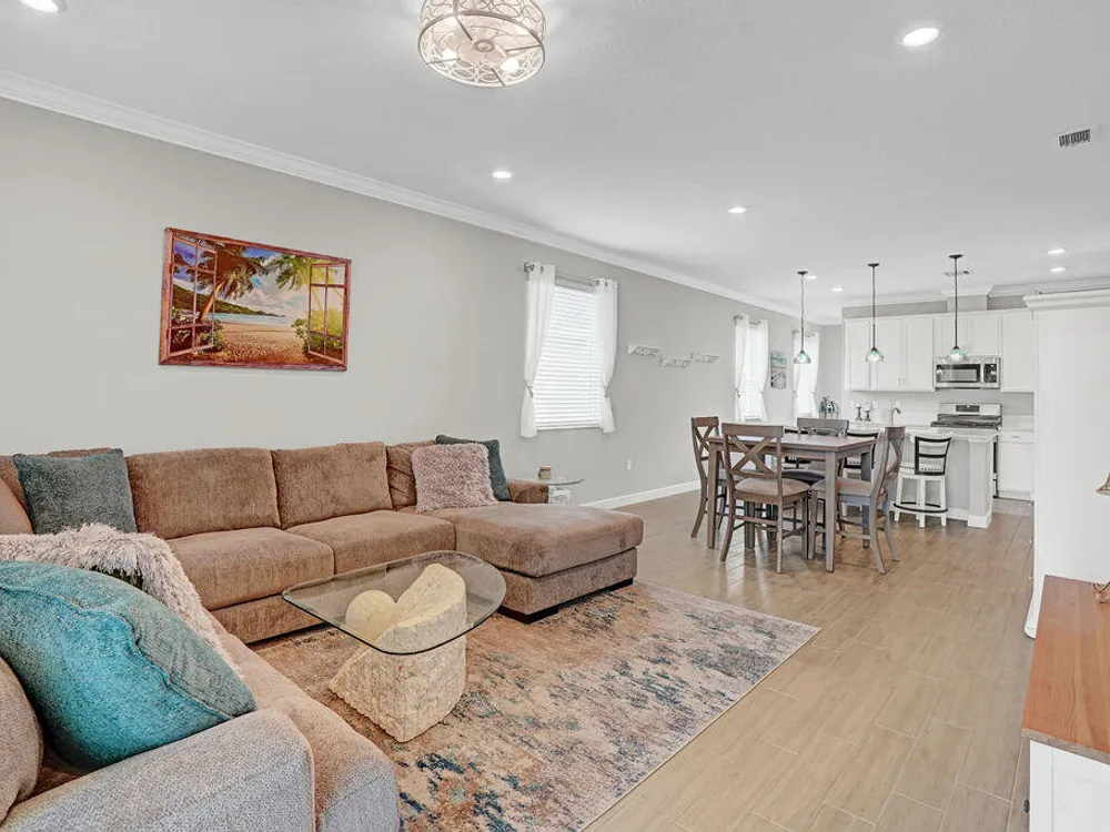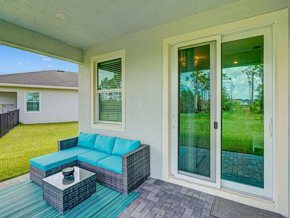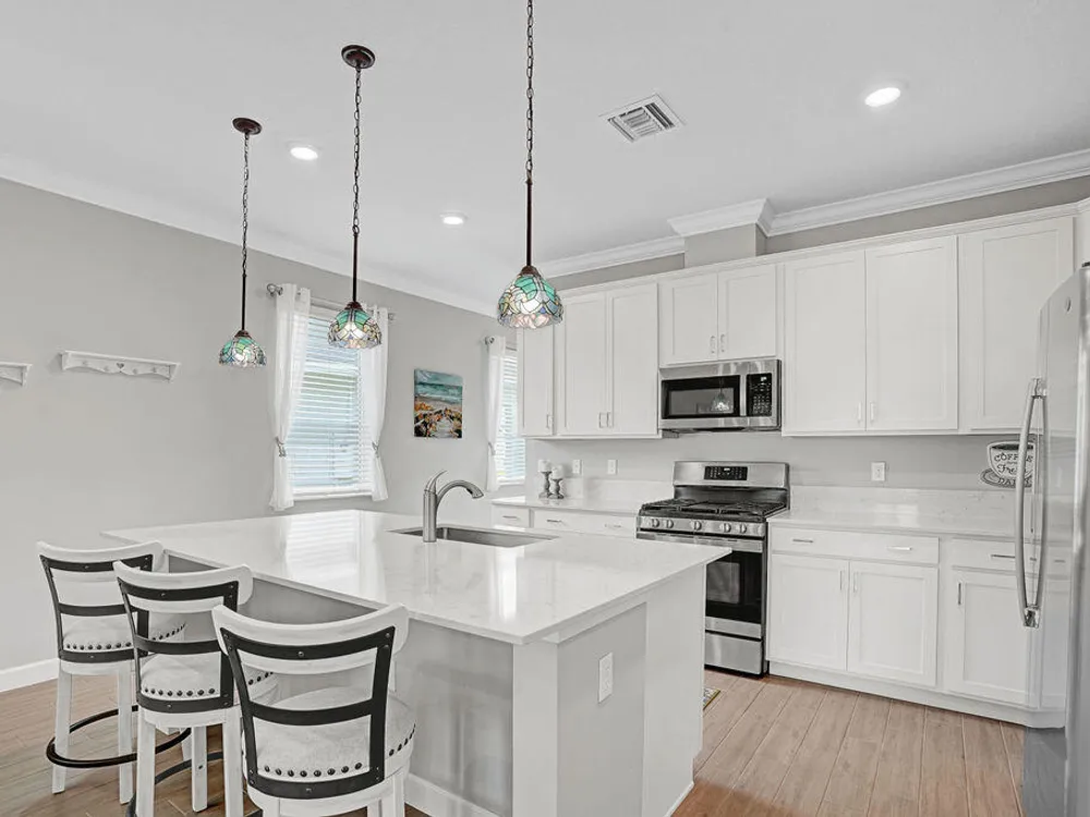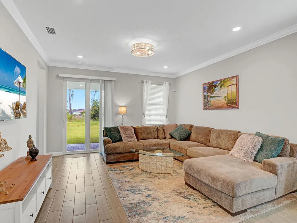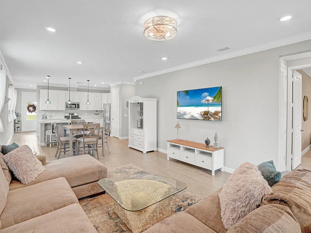 Turnkey FULLY FURNISHED 3/2 immaculate home located in an exclusive to 55+ active adults GATED community. This rarely lived in home is located on a cul-de-sac lot backing up to the natural PRESERVE offering no back neighbors for privacy. The open floorplan with 9ft ceilings has a gourmet kitchen with Quartz countertops, large island w/bar, S/S appliances and a GAS range for immediate cooking. Beautiful tile plank floors throughout home, Crown molding, ceiling fans, IMPACT glass, a covered front porch and a covered back lanai w/ brick pavers and GAS hook-up overlooks the peaceful preserve. The resort-style clubhouse offers a heated pool/spa, fitness center, cafe, card room, movie theater, tennis, pickleball and many planned activities. Convenient location near Publix, FL TNPK and I-95