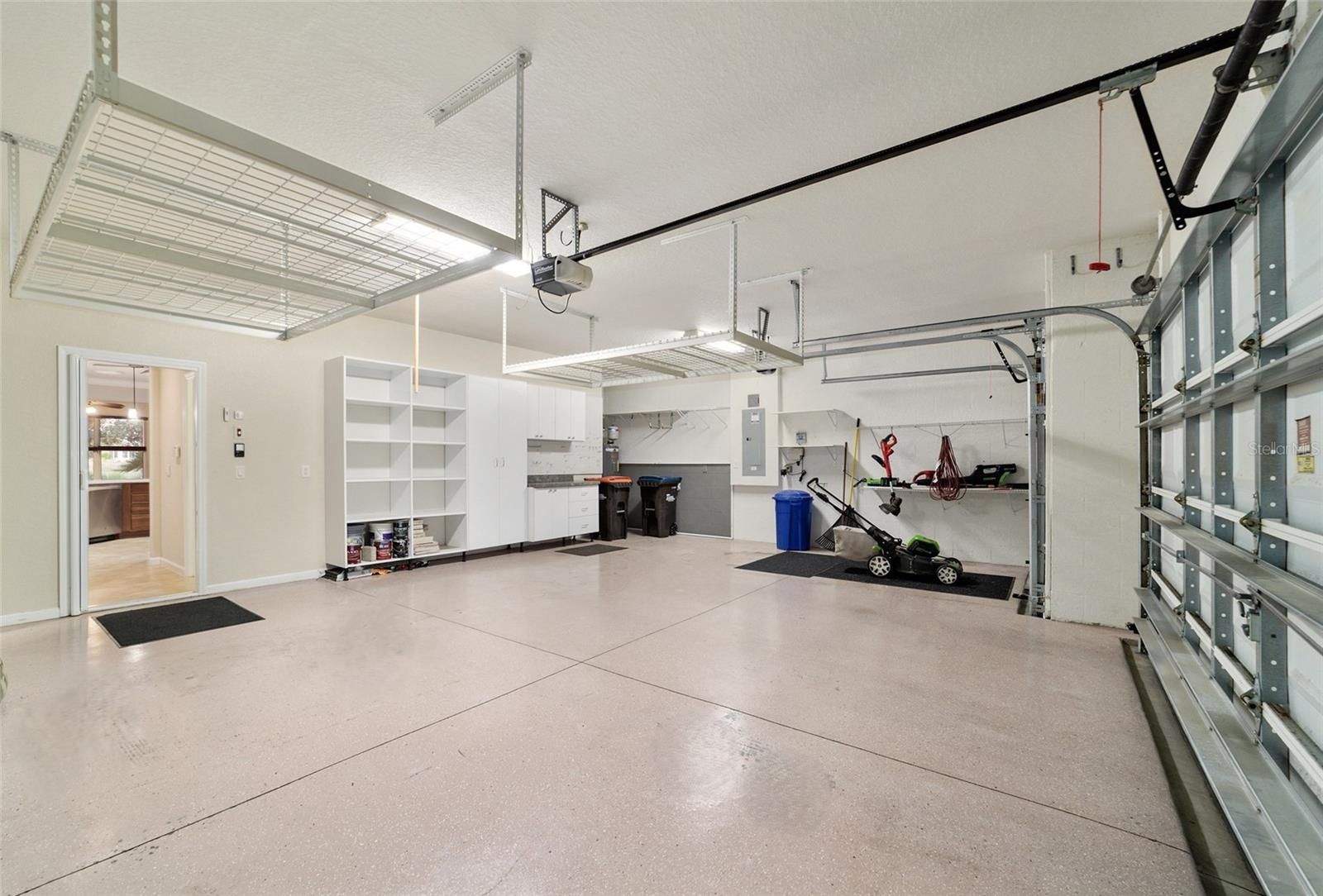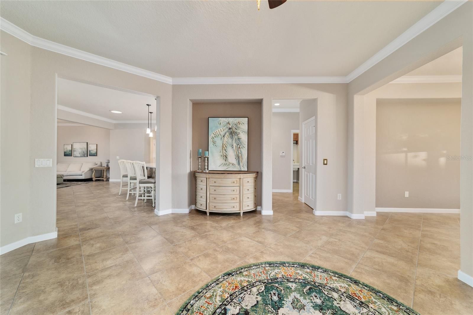 - Ceiling Fan(s), Crown Molding, Eat-in Kitchen, High Ceilings, Kitchen/Family Room Combo, Living/Dining Room, Open Floorplan, Main Level Primary, Solid Surface Counters, Split Bedrooms, Stone Counters, Thermostat, Walk-In Closet(s)