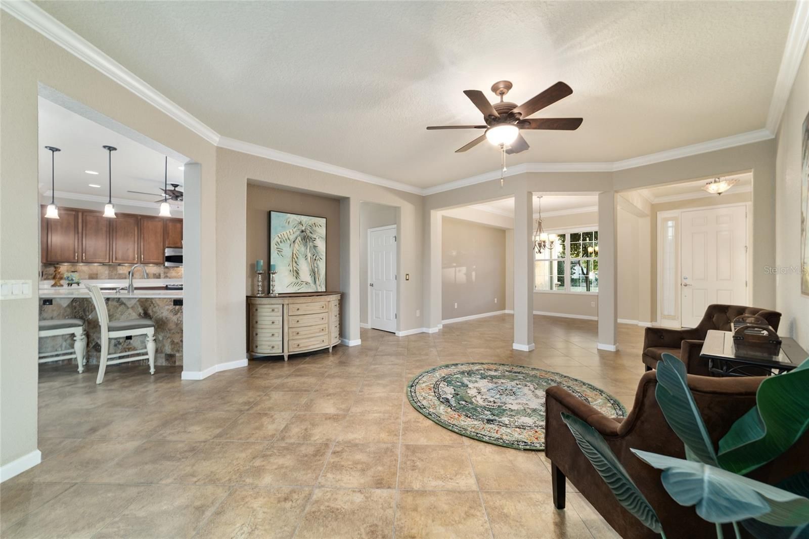 Resort-style living awaits in this spacious Kingston model home perfectly positioned on a Premium golf course lot, offering sweeping views of the 5th hole and tranquil water vistas. Located in the gated, 55+ Stone Creek Golf Course Community, this home offers an impressive abundance of curb appeal with professionally designed mature landscaping with accent lighting, decorative concrete curbing with stacked stone accents, and a recently sealed paver-lined driveway. A welcoming screened portico provides entry to a spacious and open floor plan highlighted by a serene neutral color palette, diagonally laid tile flooring, recessed LED downlighting, elegant crown molding, and soaring ceilings throughout. Designed for effortless entertaining, the home offers multiple gathering spaces, including a formal living and dining room, a casual breakfast nook, and a separate family room providing the perfect setting for both everyday living and larger social occasions. Delight in the beautifully appointed Chef’s kitchen, featuring an oversized island ideal for casual dining and meal prep, stainless steel appliances, quartz countertops, a decorative tile backsplash, and a spacious pantry to keep everything neatly organized. The kitchen transitions effortlessly into the dining and living areas, where glass sliders lead to an expansive paver-lined birdcage patio providing an inviting retreat for relaxing, entertaining, and savoring the tranquil golf course and water views. The luxurious Owner’s suite is a private retreat, showcasing rich wood flooring, glass sliders providing direct access to the outdoor living areas, and a custom-designed walk-in closet. The spa-inspired en suite bath offers a large double sink vanity, a Roman-style walk-in shower with seating ledge, and a transom window that fills the space with natural light. Two beautifully appointed guest rooms with wood flooring and custom closets provide flexible space for a home office or for welcoming visitors. A well-equipped laundry room with folding area and utility sink adds everyday convenience while a new roof (2023), a newer water heater, and a whole-house surge protector add priceless peace of mind. The extended 3-car garage, complete with privacy screen, generator transfer switch, and overhead storage, provides ample room for a golf cart, workshop, or a hobby space, enhancing the home’s versatility. As an added bonus, this home includes protective overscreens on the golf-course-facing windows, offering extra peace of mind from stray golf balls. This exceptional home is more than just a place to live; it’s a gateway to an active and engaging lifestyle. Immerse yourself in the vibrant community offerings, featuring championship golf, resort-style pools, pickleball courts, a state-of-the-art health spa, exciting excursions, entertainment, and much more. Don't miss the opportunity to make this dream home yours!