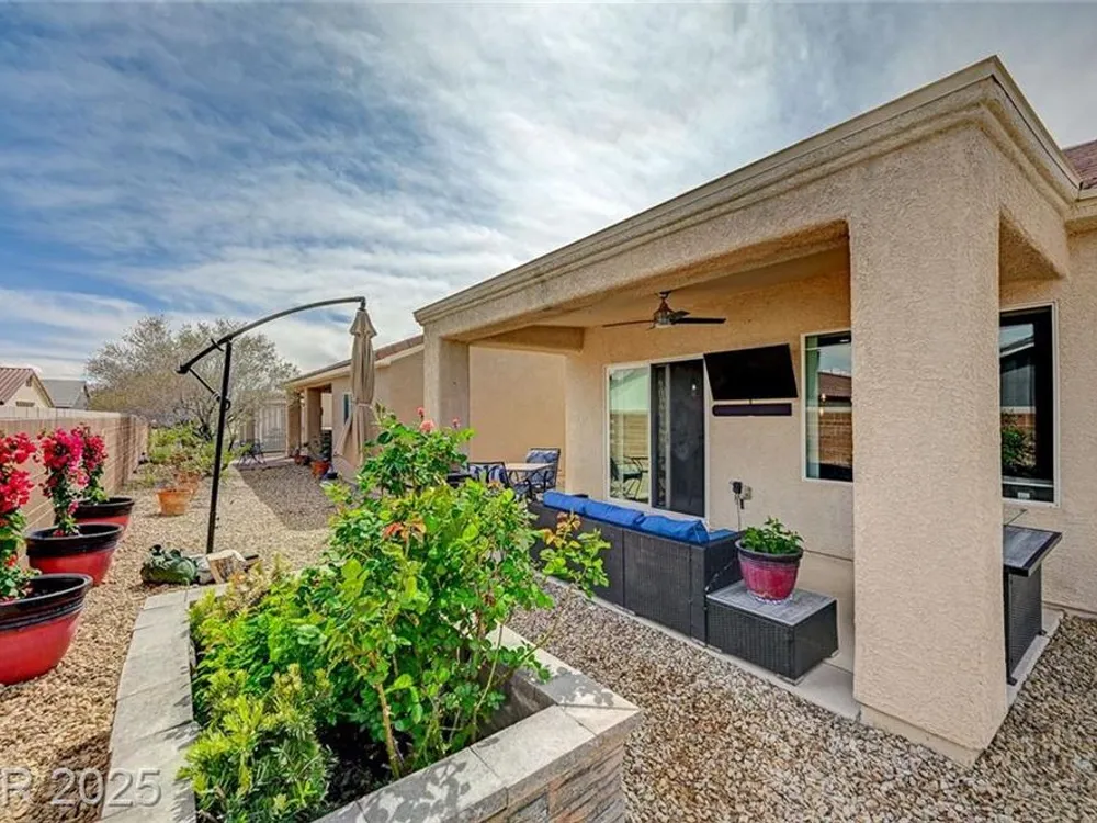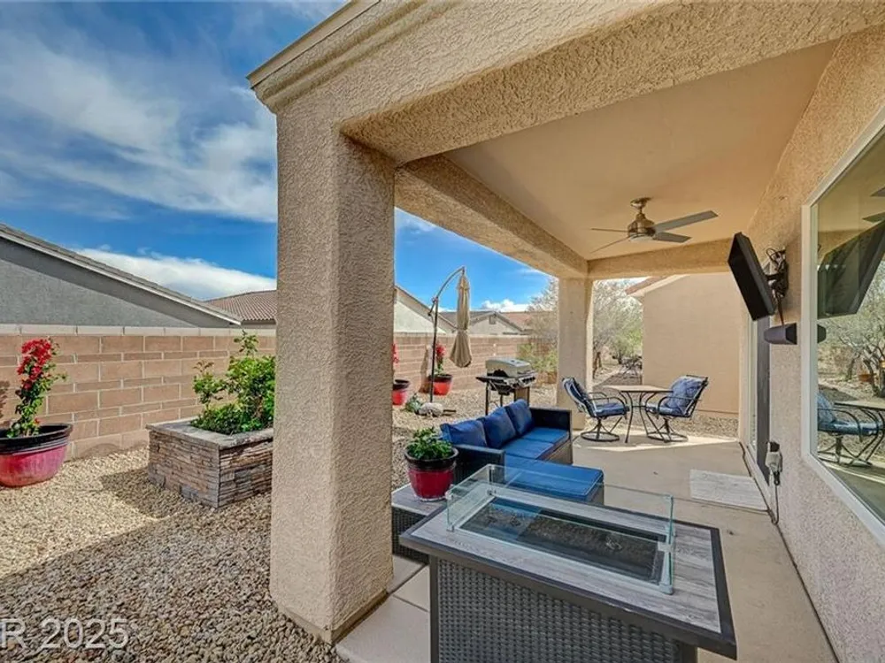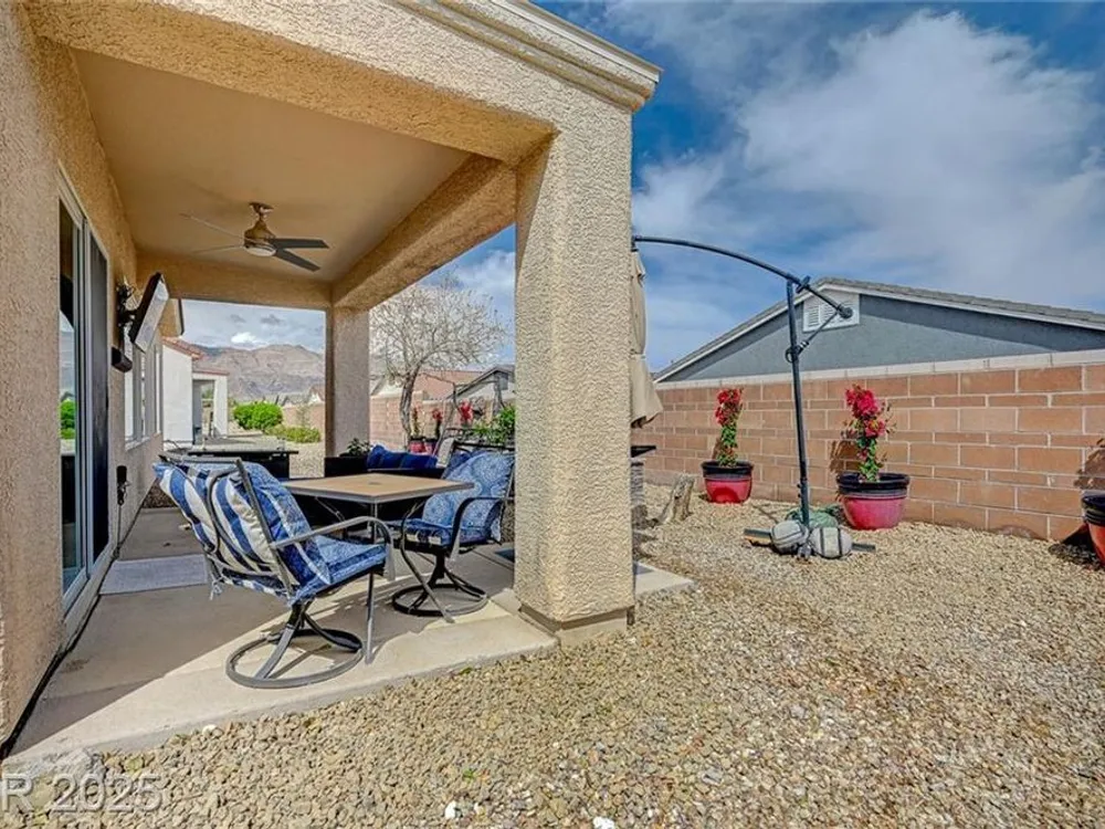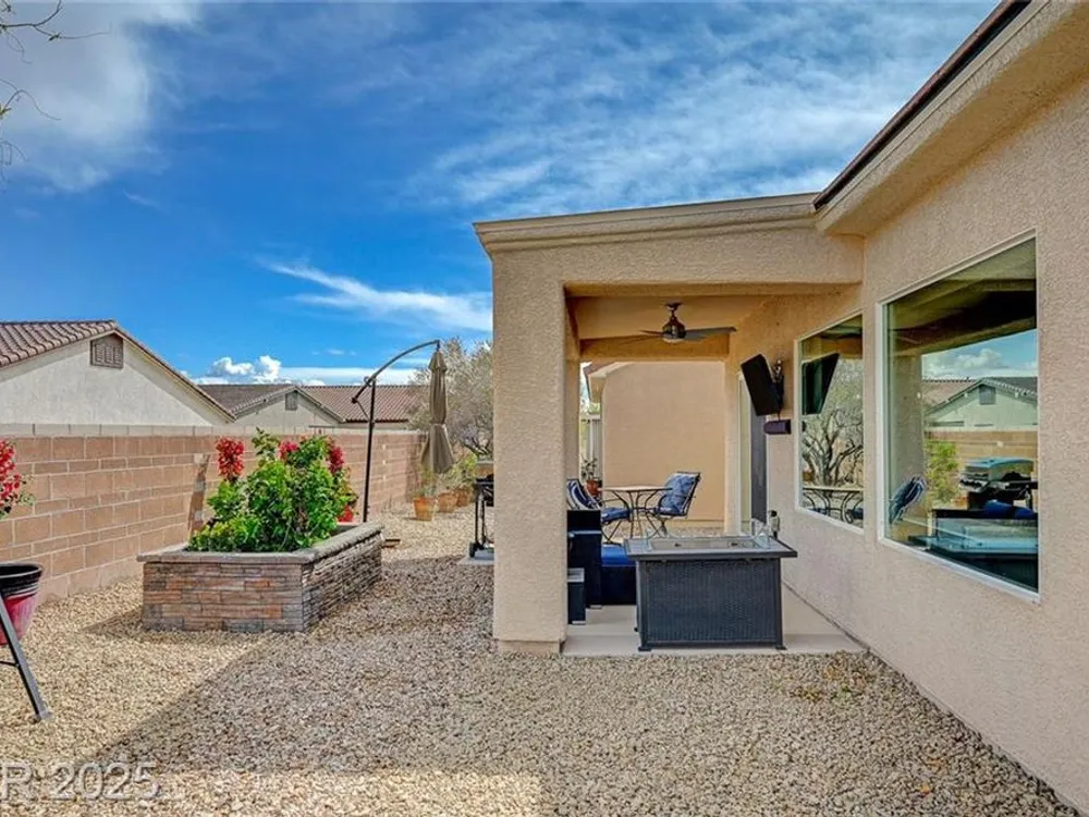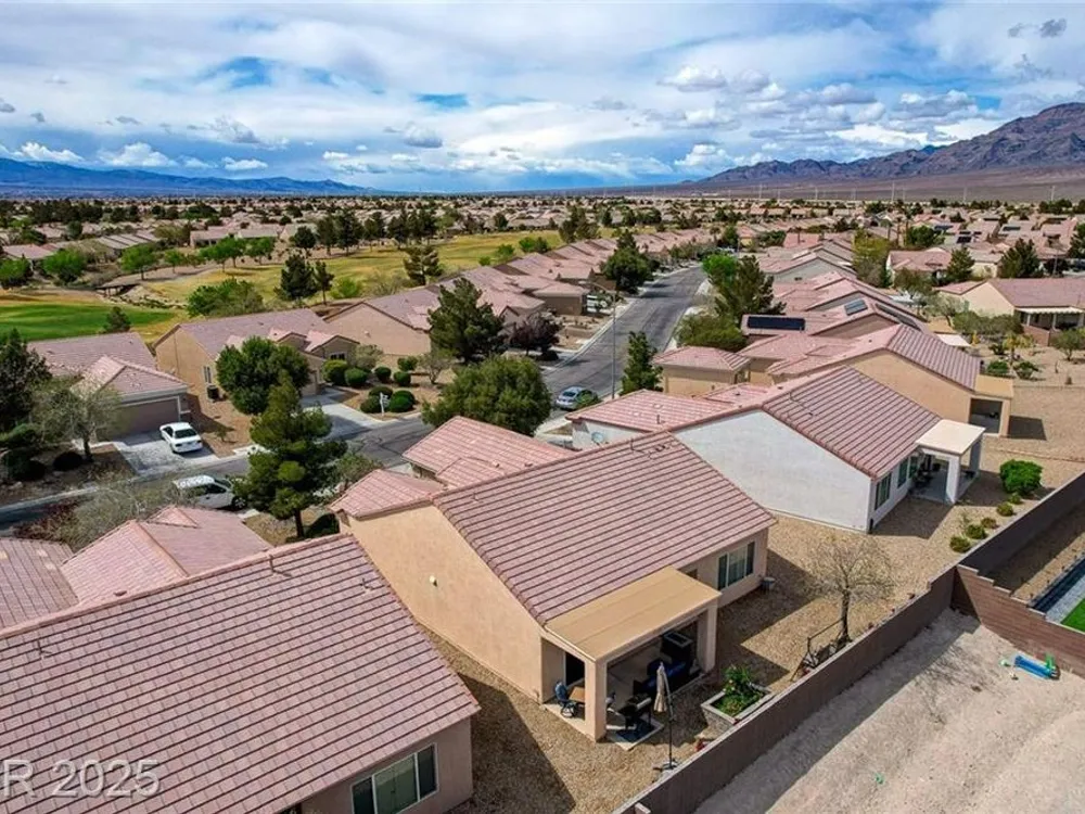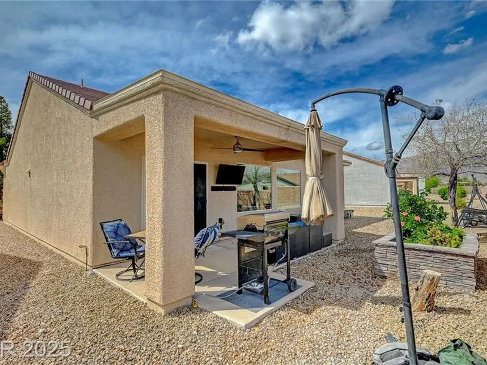 Discover this stunning single story home in the highly desirable age restricted Sun City Aliante community! Featuring 2 beds + den, 2 baths, and breathtaking mountain views, this home offers an open-concept design with a spacious kitchen, large breakfast bar, granite countertops, 2 pantries, and all included stainless steel appliances. The primary suite boasts a huge walk-in closet and a cozy gas fireplace. Enjoy luxury vinyl plank & tile flooring throughout, upgraded light fixtures, and a den that can serve as a third bedroom. The backyard oasis includes a covered patio with a Charbroil Gas BBQ with an option to fully fence and a garden area. The finished 2 car garage features epoxy floors, a large workshop, ample storage, 30-amp outlet, full water treatment/filtration system and water softener. Sun City Aliante offers top tier resort-style amenities: golf, indoor and outdoor pools/spas, tennis, pickleball, basketball courts, clubhouse, fitness center, and more! Don’t miss this one!
