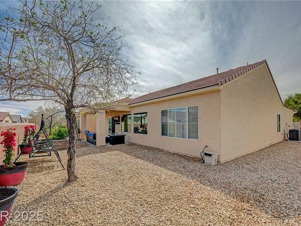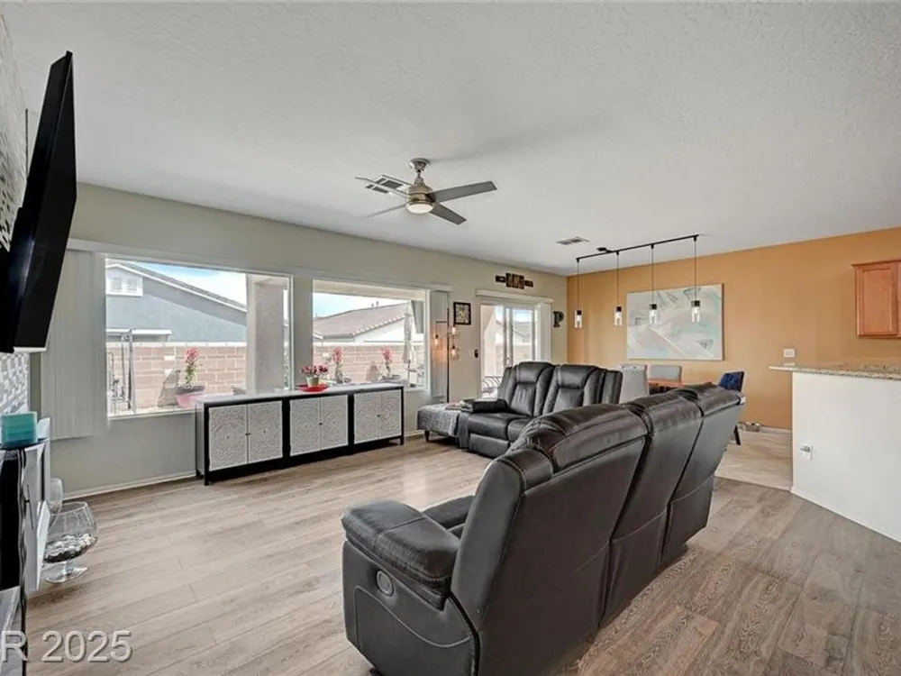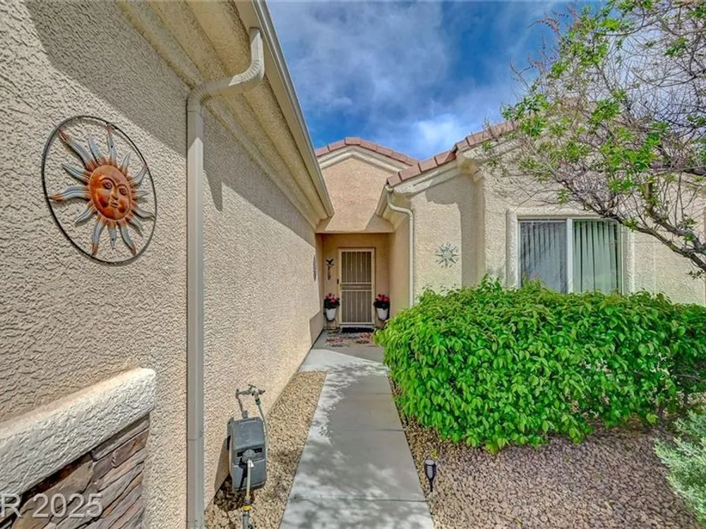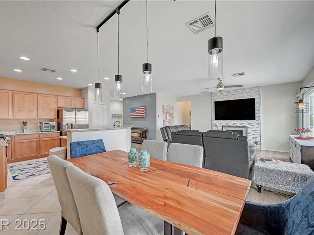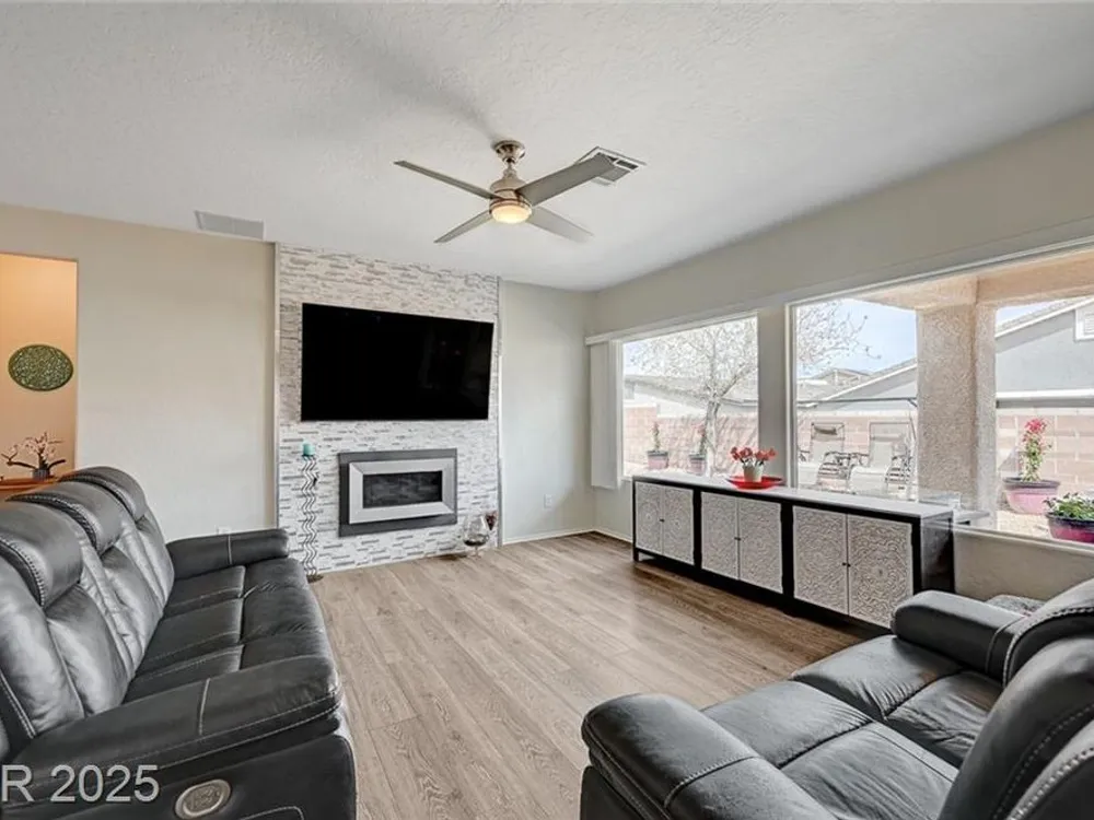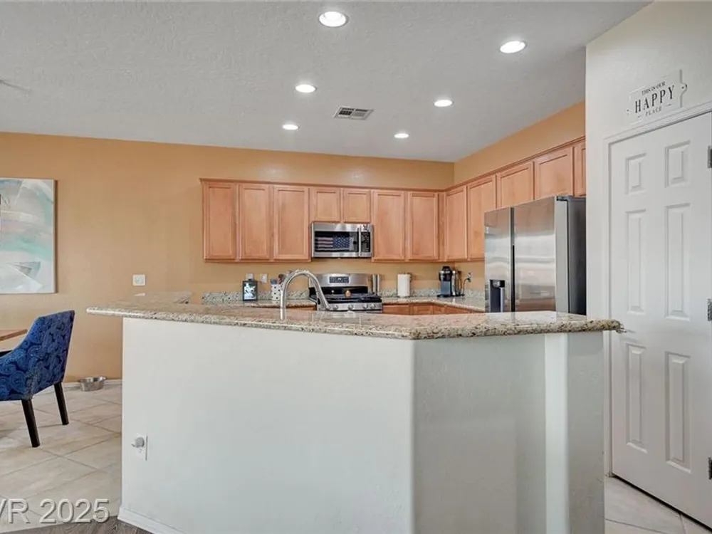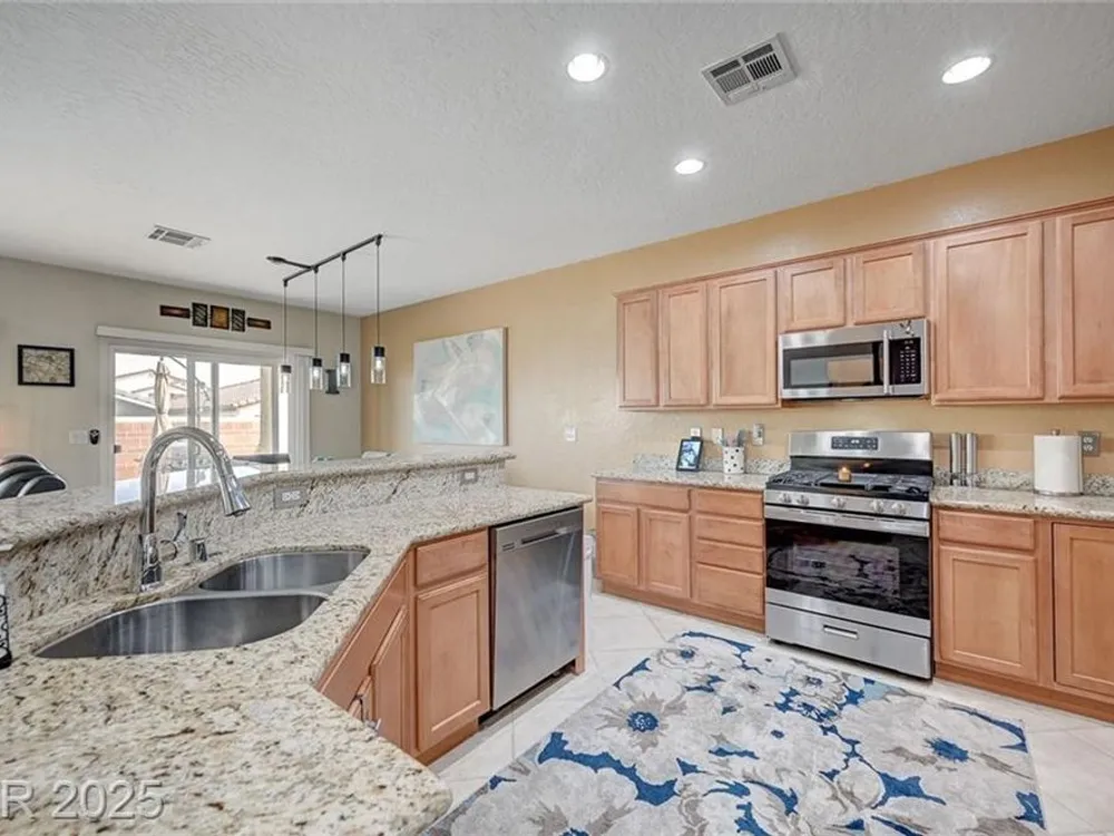 Discover this stunning single story home in the highly desirable age restricted Sun City Aliante community! Featuring 2 beds + den, 2 baths, and breathtaking mountain views, this home offers an open-concept design with a spacious kitchen, large breakfast bar, granite countertops, 2 pantries, and all included stainless steel appliances. The primary suite boasts a huge walk-in closet and a cozy gas fireplace. Enjoy luxury vinyl plank & tile flooring throughout, upgraded light fixtures, and a den that can serve as a third bedroom. The backyard oasis includes a covered patio with a Charbroil Gas BBQ with an option to fully fence and a garden area. The finished 2 car garage features epoxy floors, a large workshop, ample storage, 30-amp outlet, full water treatment/filtration system and water softener. Sun City Aliante offers top tier resort-style amenities: golf, indoor and outdoor pools/spas, tennis, pickleball, basketball courts, clubhouse, fitness center, and more! Don’t miss this one!
