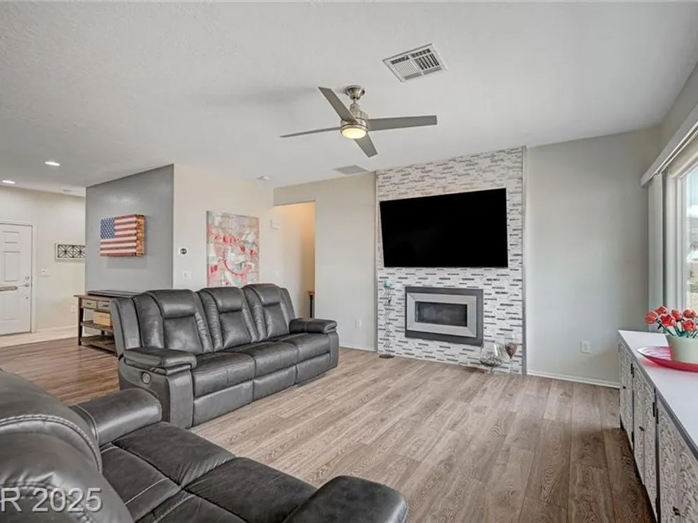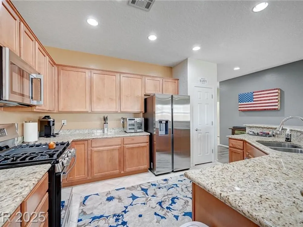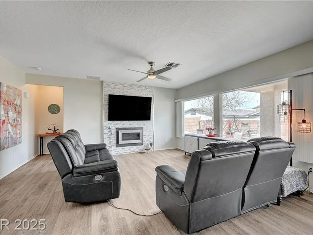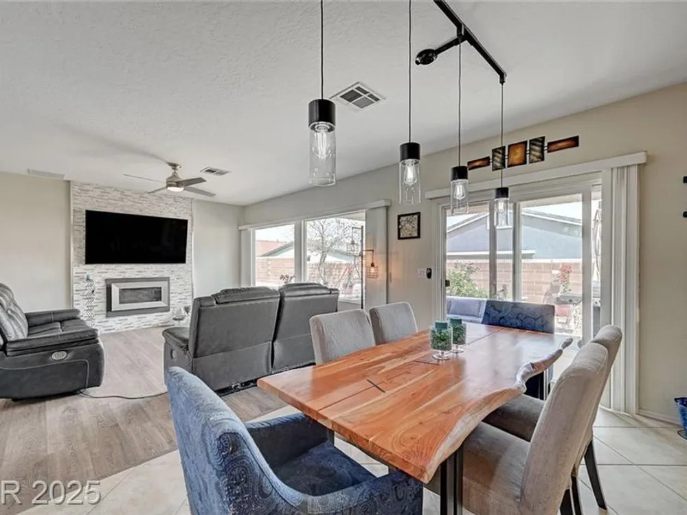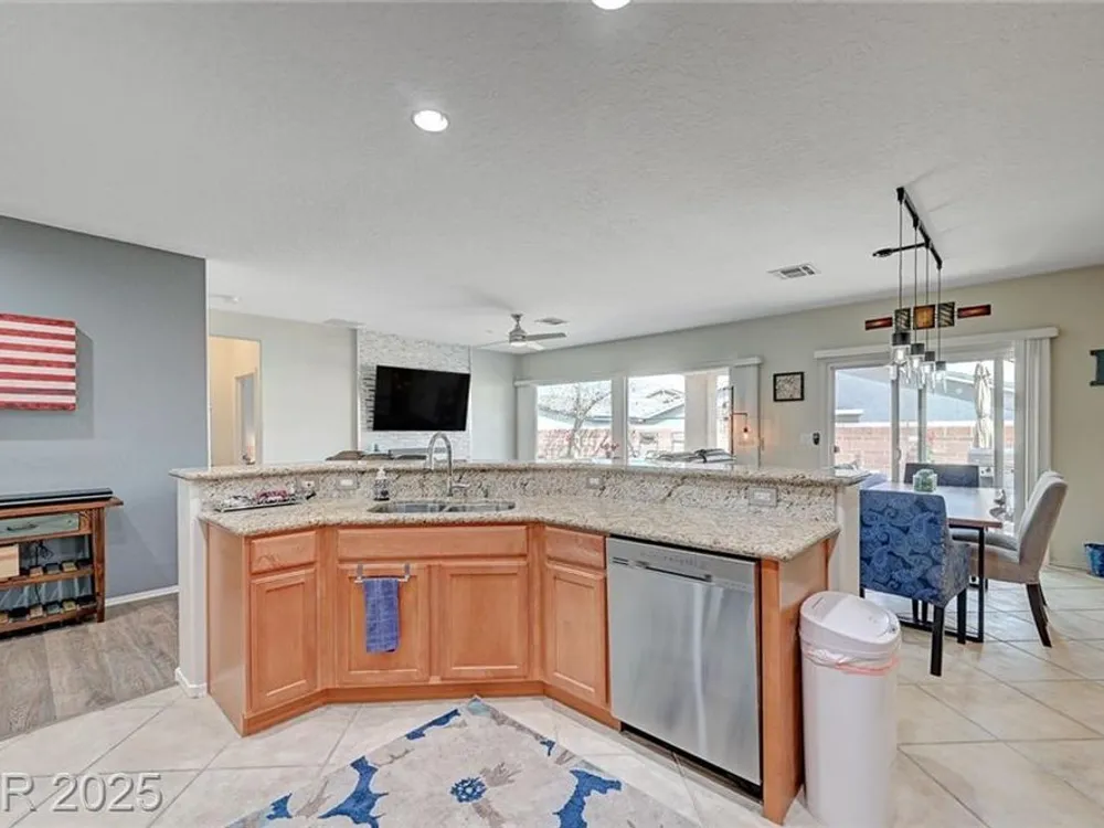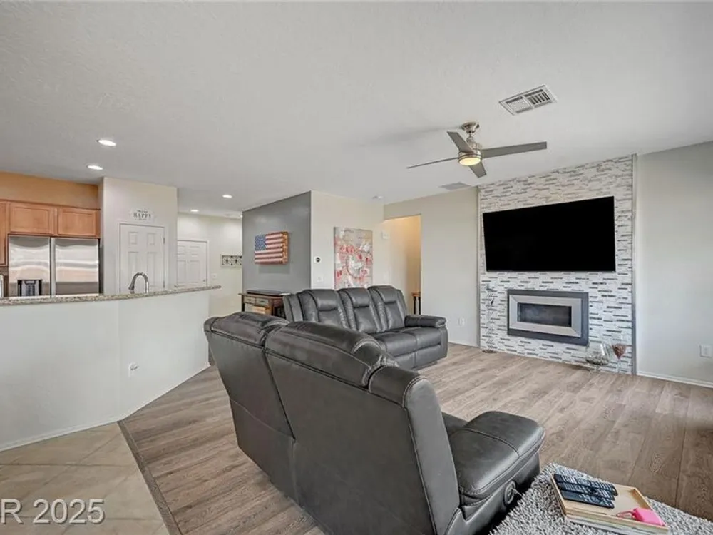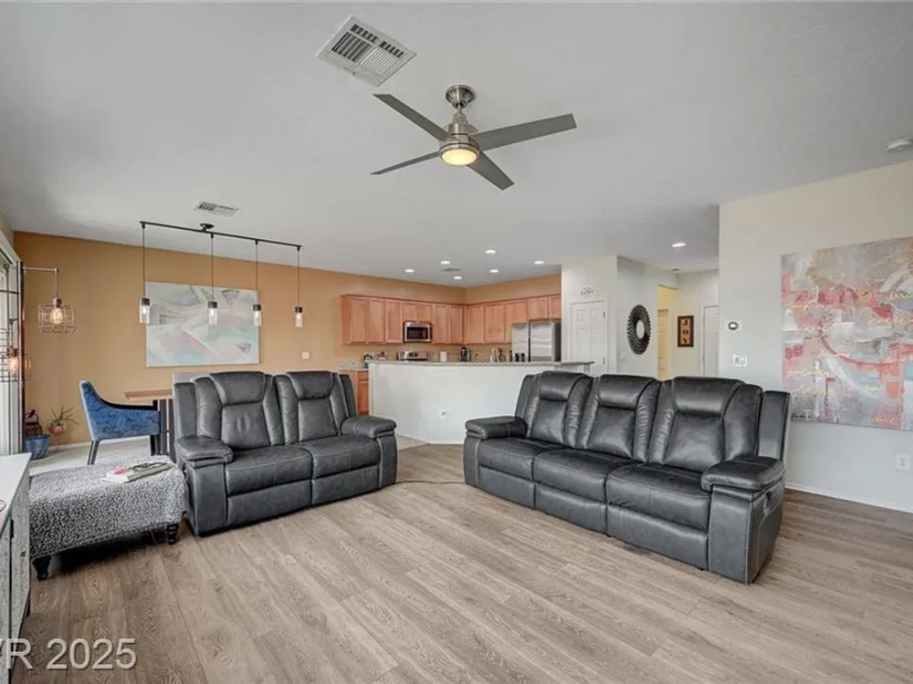 Discover this stunning single story home in the highly desirable age restricted Sun City Aliante community! Featuring 2 beds + den, 2 baths, and breathtaking mountain views, this home offers an open-concept design with a spacious kitchen, large breakfast bar, granite countertops, 2 pantries, and all included stainless steel appliances. The primary suite boasts a huge walk-in closet and a cozy gas fireplace. Enjoy luxury vinyl plank & tile flooring throughout, upgraded light fixtures, and a den that can serve as a third bedroom. The backyard oasis includes a covered patio with a Charbroil Gas BBQ with an option to fully fence and a garden area. The finished 2 car garage features epoxy floors, a large workshop, ample storage, 30-amp outlet, full water treatment/filtration system and water softener. Sun City Aliante offers top tier resort-style amenities: golf, indoor and outdoor pools/spas, tennis, pickleball, basketball courts, clubhouse, fitness center, and more! Don’t miss this one!