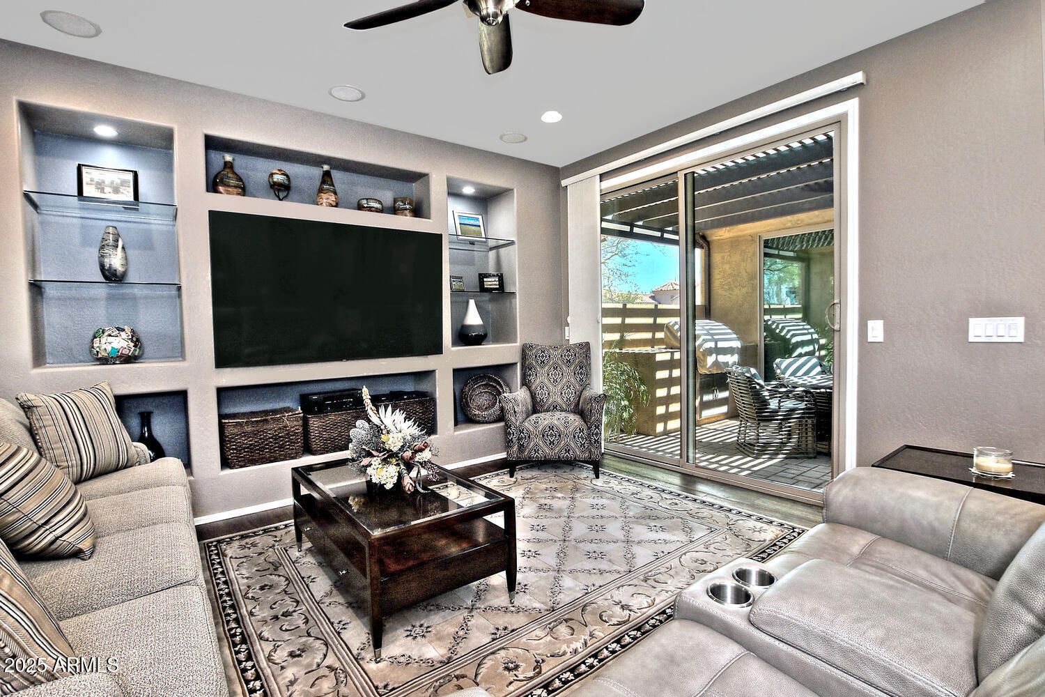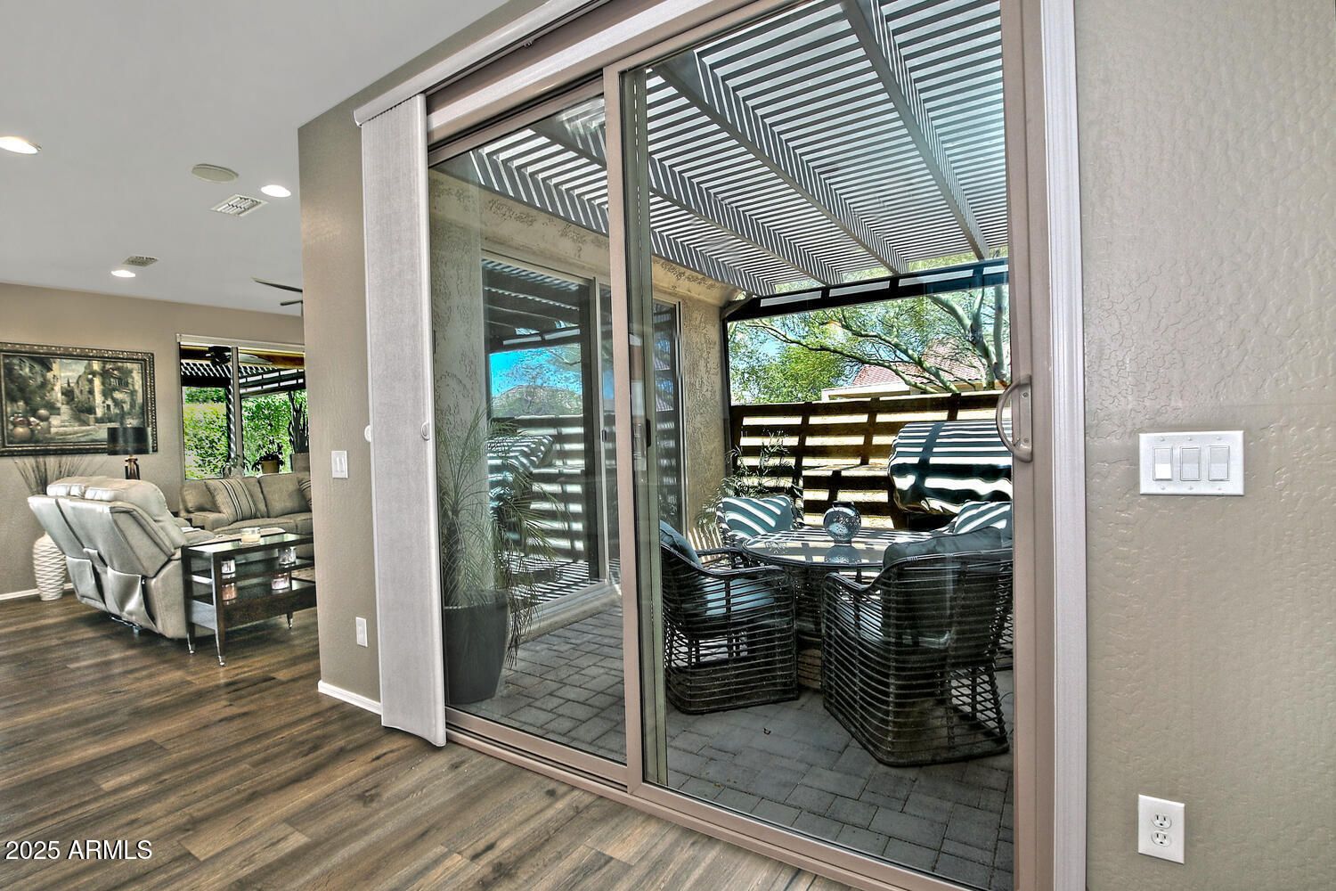 Enjoy the tour of this immaculate ''Haven'' model offering all the right touches you're looking for starting with a large PREMIUM N/S LOT that opens to COMMON AREA to the West adding beautiful desert landscape and privacy, extended paver patio, built-in grill, pergola, electric sun shades and sun screens on the primary bedroom windows. The home is just as beautiful inside offering upgrades and details that includes a CHEFS KITCHEN w/granite counters, stainless steel appliances, RO system, pendant lighting, gorgeous upgraded engineered WOOD FLOORING, built-in entertainment center, water softener, tankless hot water, 4' GARAGE EXTENSION, surround sound, ceiling fans, window treatments and a neutral color palette. Some furnishings may be available on a separate bill of sale. Take advantage of our Anthem Grille, The Poston Butte Golf Club, a learning center and all the festivities, activities and amenities a Sun City community has to offer. Remember you are buying a lifestyle that goes beyond the homes property lines.