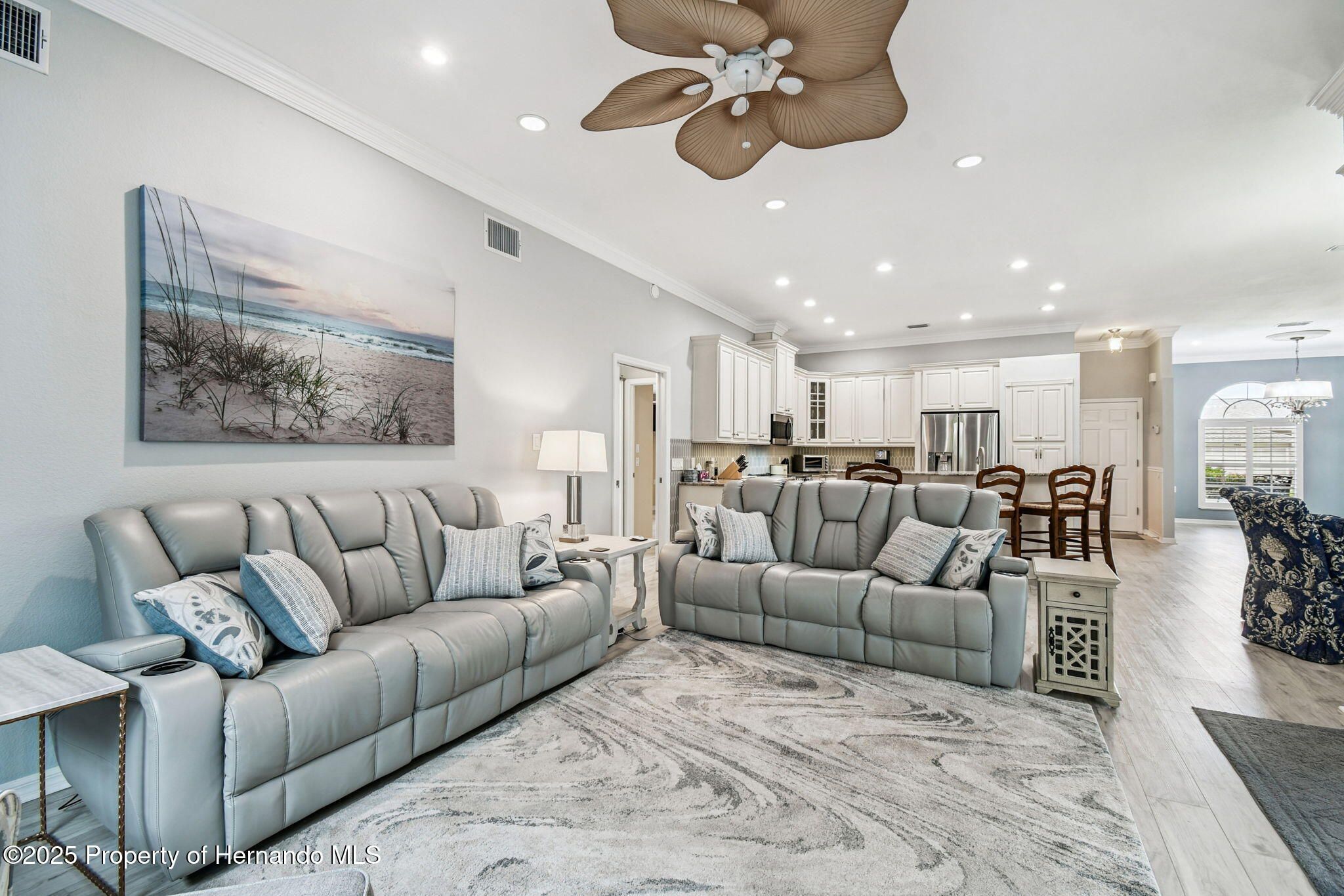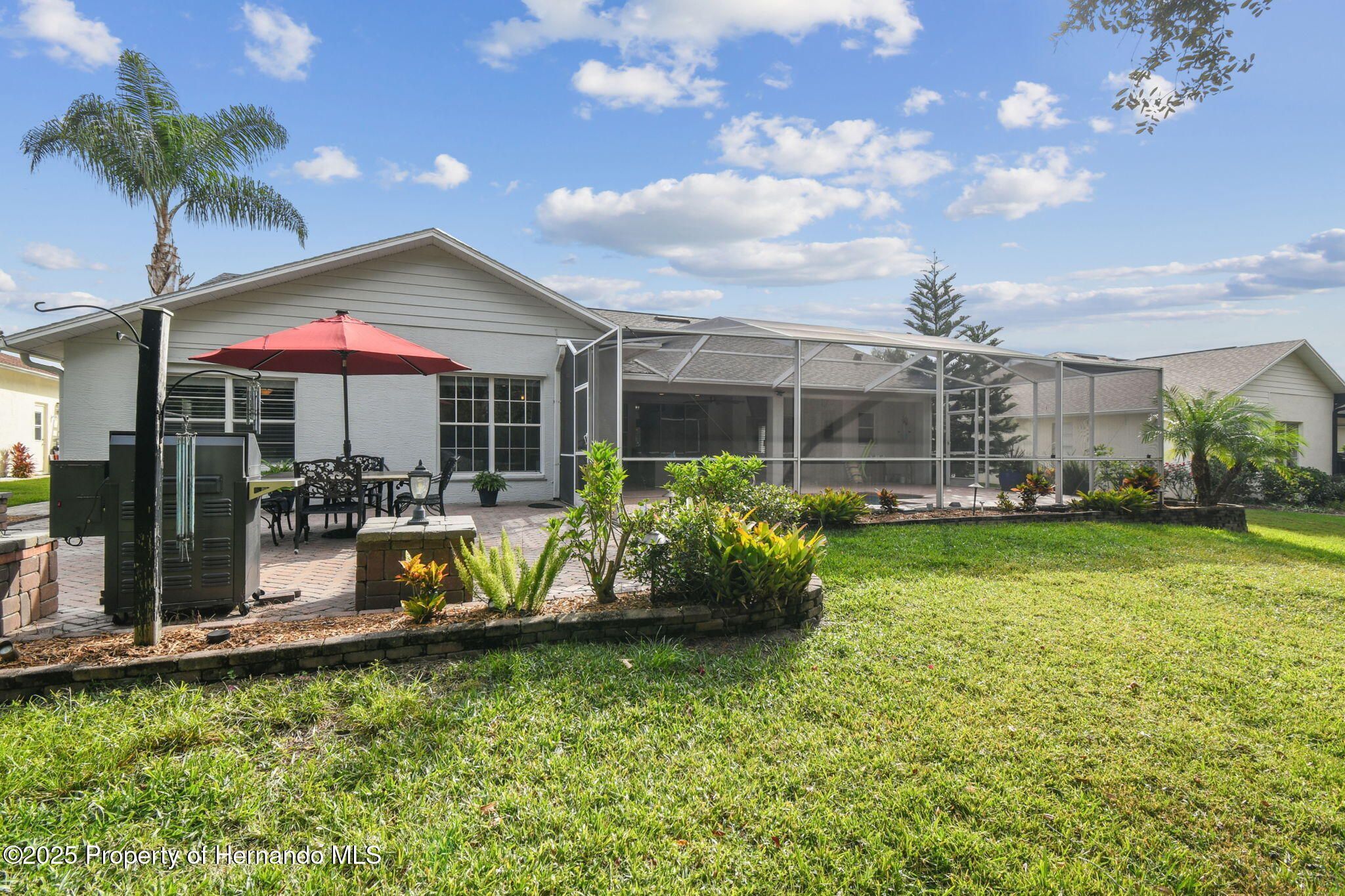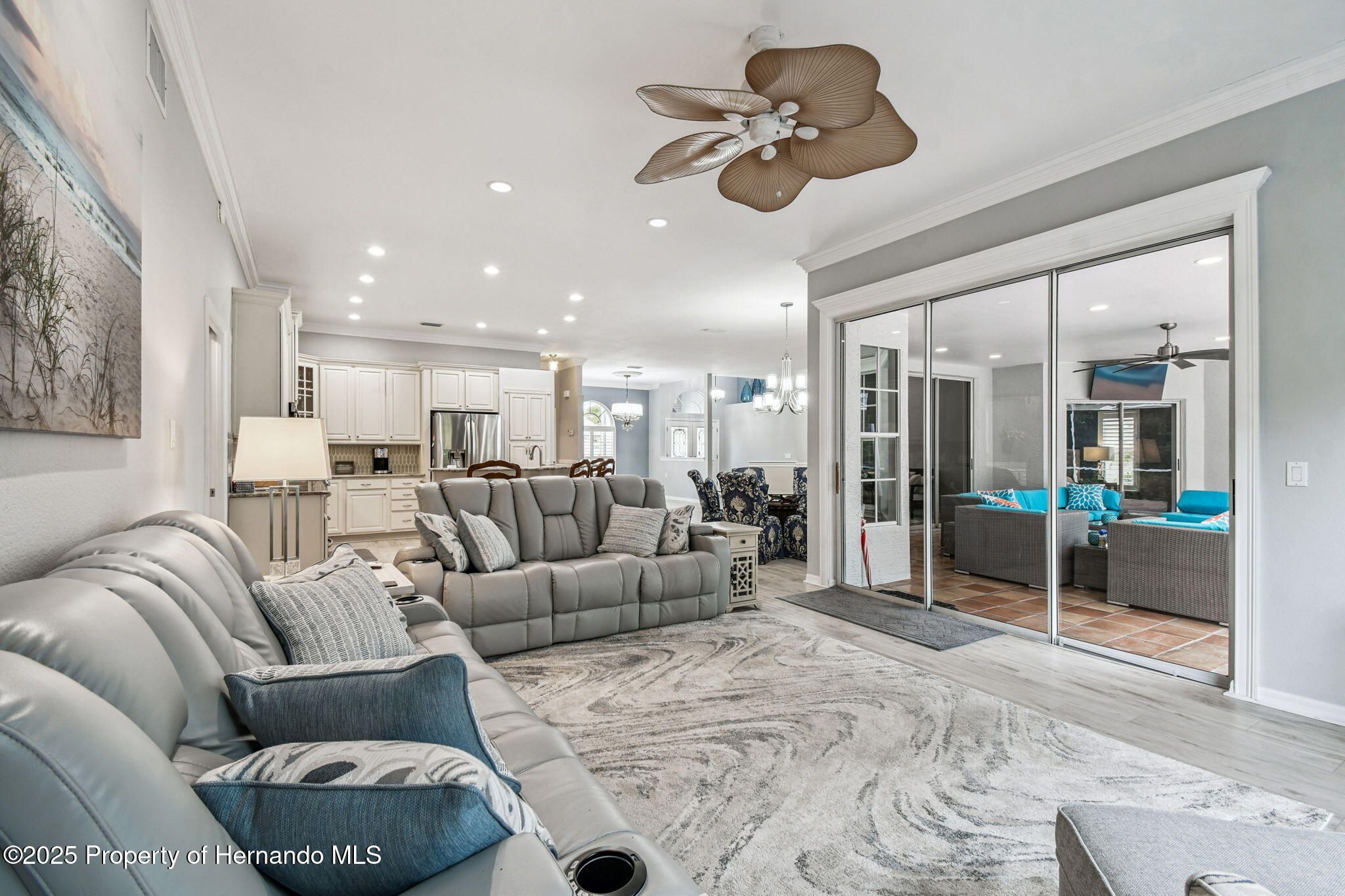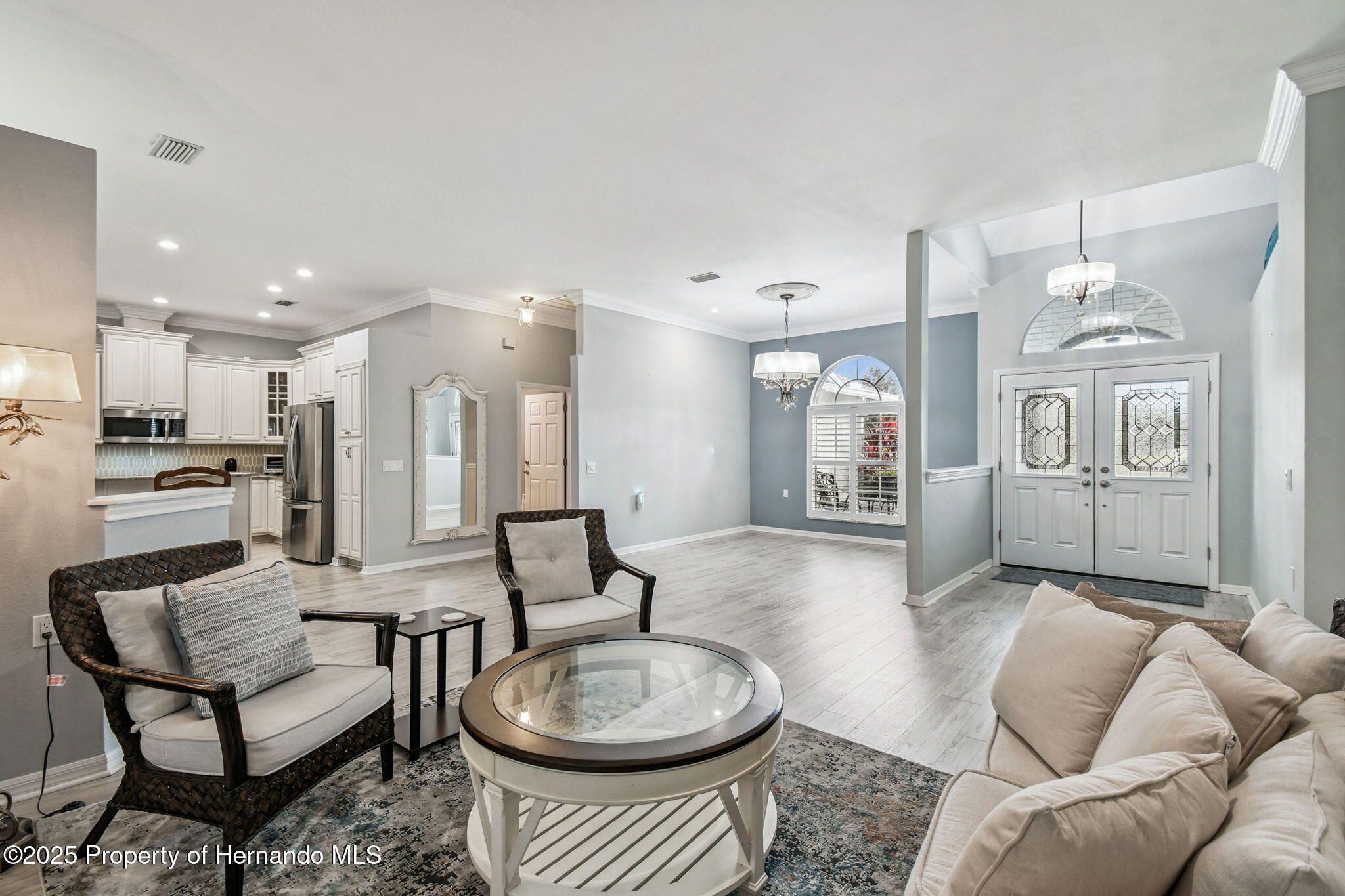 Active Under Contract. Welcome to Timber Pines, an award-winning, exclusive 55+ gated community. This GORGEOUS remodeled Kent III is TURN KEY. Upon entry, you'll be greeted by an open floor plan featuring a combined dining and living area with all new luxury vinyl floors and newly painted interior. This meticulously maintained three-bedroom, two and half bath is nestled among all new landscaping (volt lighting), sod and a new front palm tree. The space flows seamlessly into the Florida Room, offering scenic views of the private rear yard and lush greenery and a beautiful 1100 sq ft. covered Lanai, pool (spa) and half bath. The centrally located kitchen is bright and functional, with a separate pantry closet and ample storage in both newly painted upper and lower cabinets and back splash. Adjacent to the kitchen is a beautiful office with built in cabinets and desk with an additional pantry for your convenience. The generously sized primary suite overlooks the Lanai, pool and rear yard through tinted sliding glass doors, filling the space with natural light. The ensuite bath has a spacious shower, large garden tub, double sinks and bidet, and also an impressive double large walk-in closet completes the suite. The home has crown molding throughout, newer ceiling fans in spare rooms along with their own TV's. This home is being offered furnished and all appliances. Golf cart sold separately. Additional recent updates include; whole house water filtration system w/ UV light, softer, UV light in a maintained HVAC system with newly cleaned and sanitized vents, new can lights throughout home, new lighting fixtures, spa has been renovated and new tile, heater, plumbing. Interior and exterior have been painted with top-of-the-line Aura paint. Invisible fence with 2 collars. The roof has a life time transferable warranty. The three car garage area includes shelving, cabinets, floored attic which is ideal for seasonal decor and other essentials. Timber Pines offers an exceptional array of amenities: four golf courses, a country club, a newly remodeled restaurant and bar with multiple TV screens, two inviting pools, a fitness center, tennis and pickleball courts, bocce ball, a billiards room, and over 100 diverse clubs. HOA fees include Spectrum Cable with two boxes and high-speed internet, adding convenience to everyday living. Don't miss this opportunity to own a meticulously maintained and beautifully updated home with a private Lot in Timber Pines!!