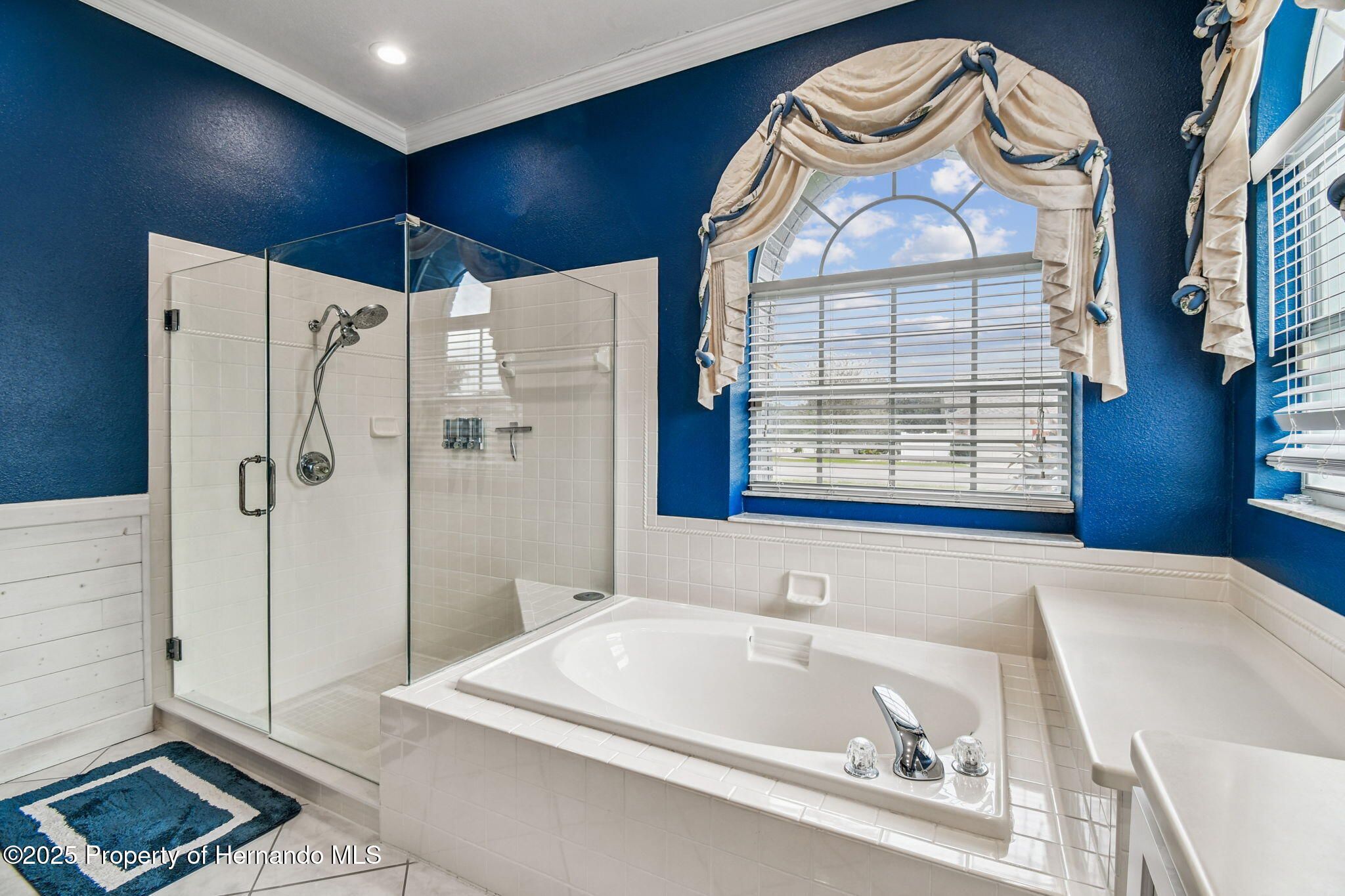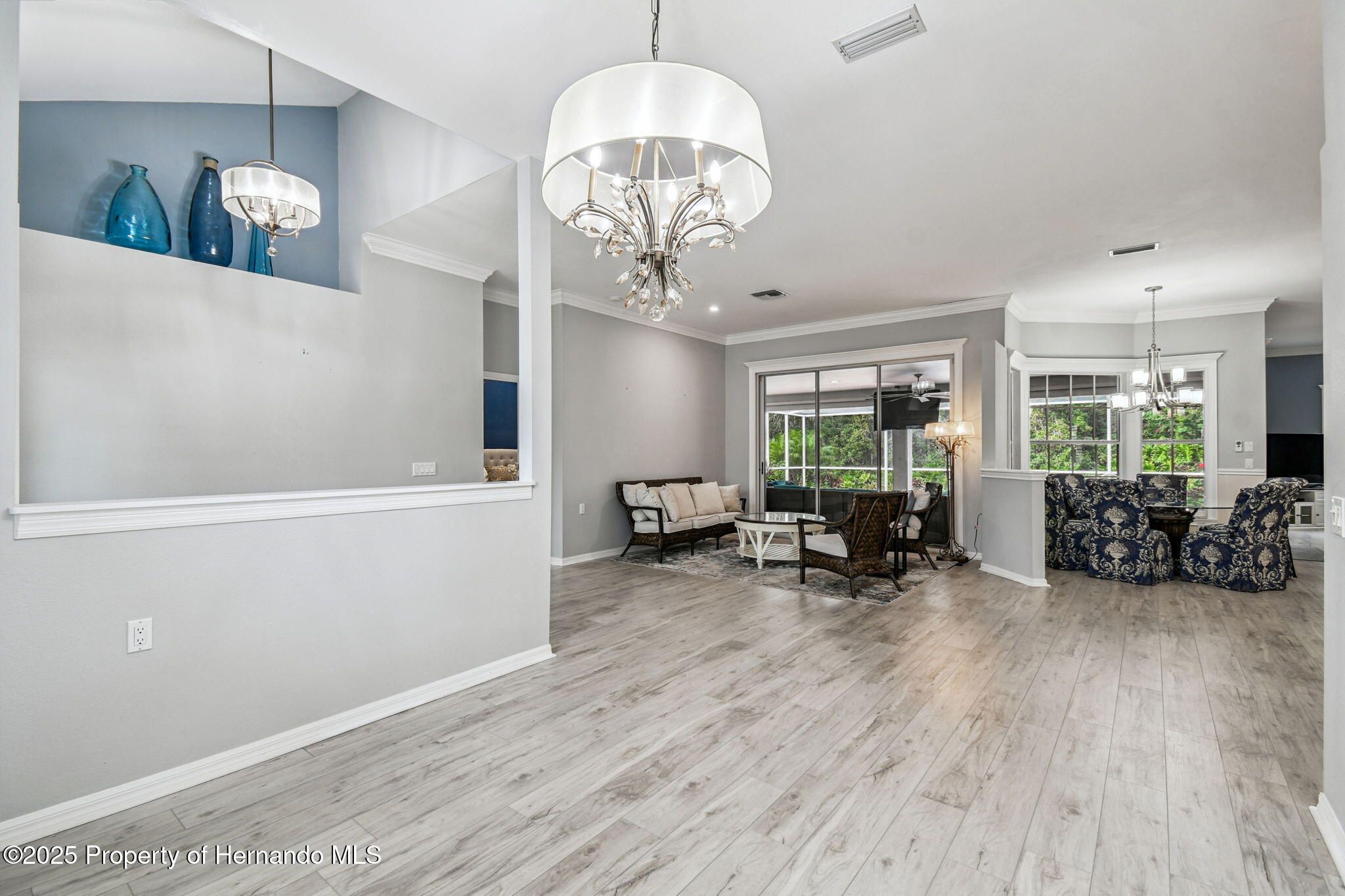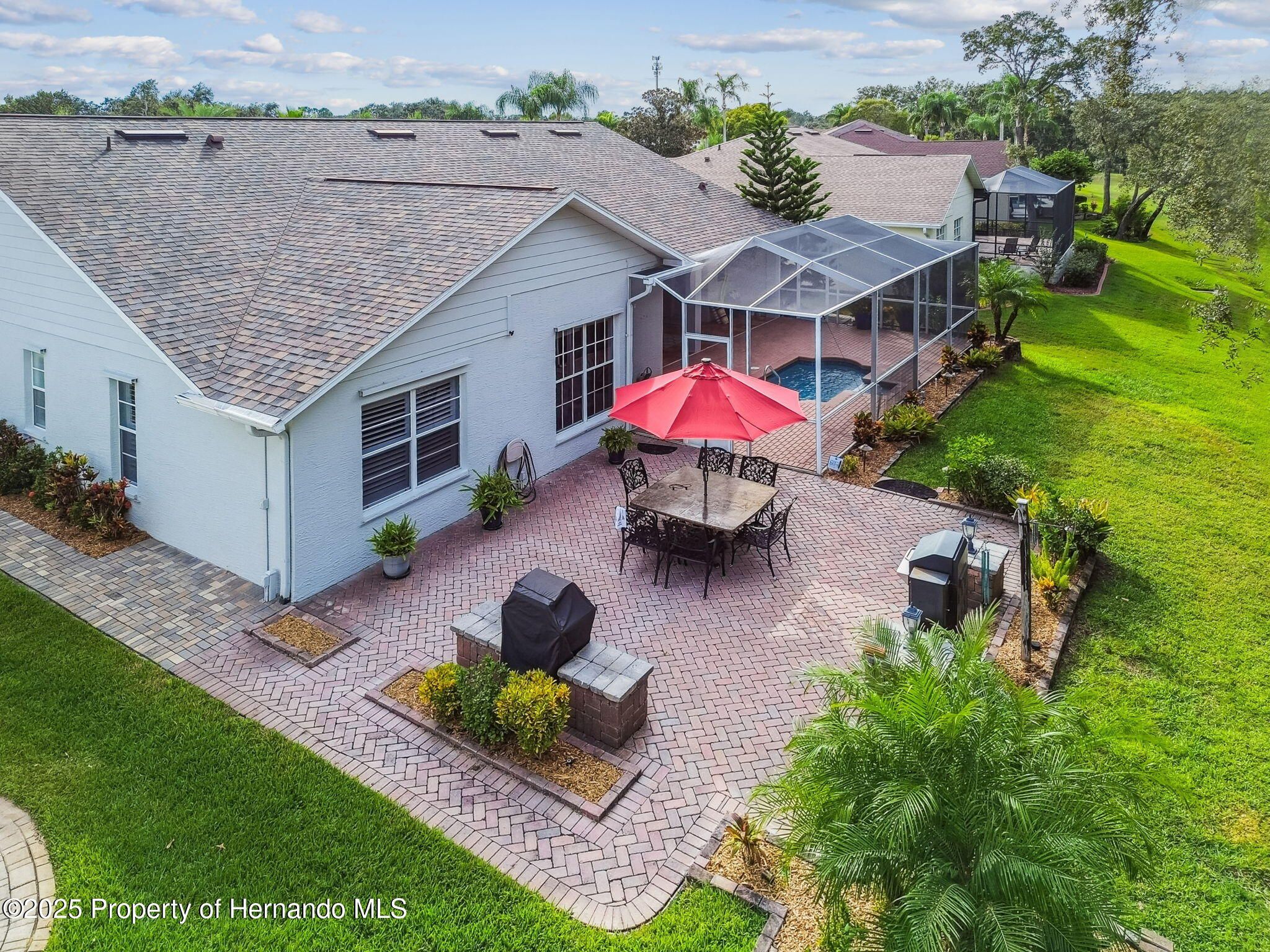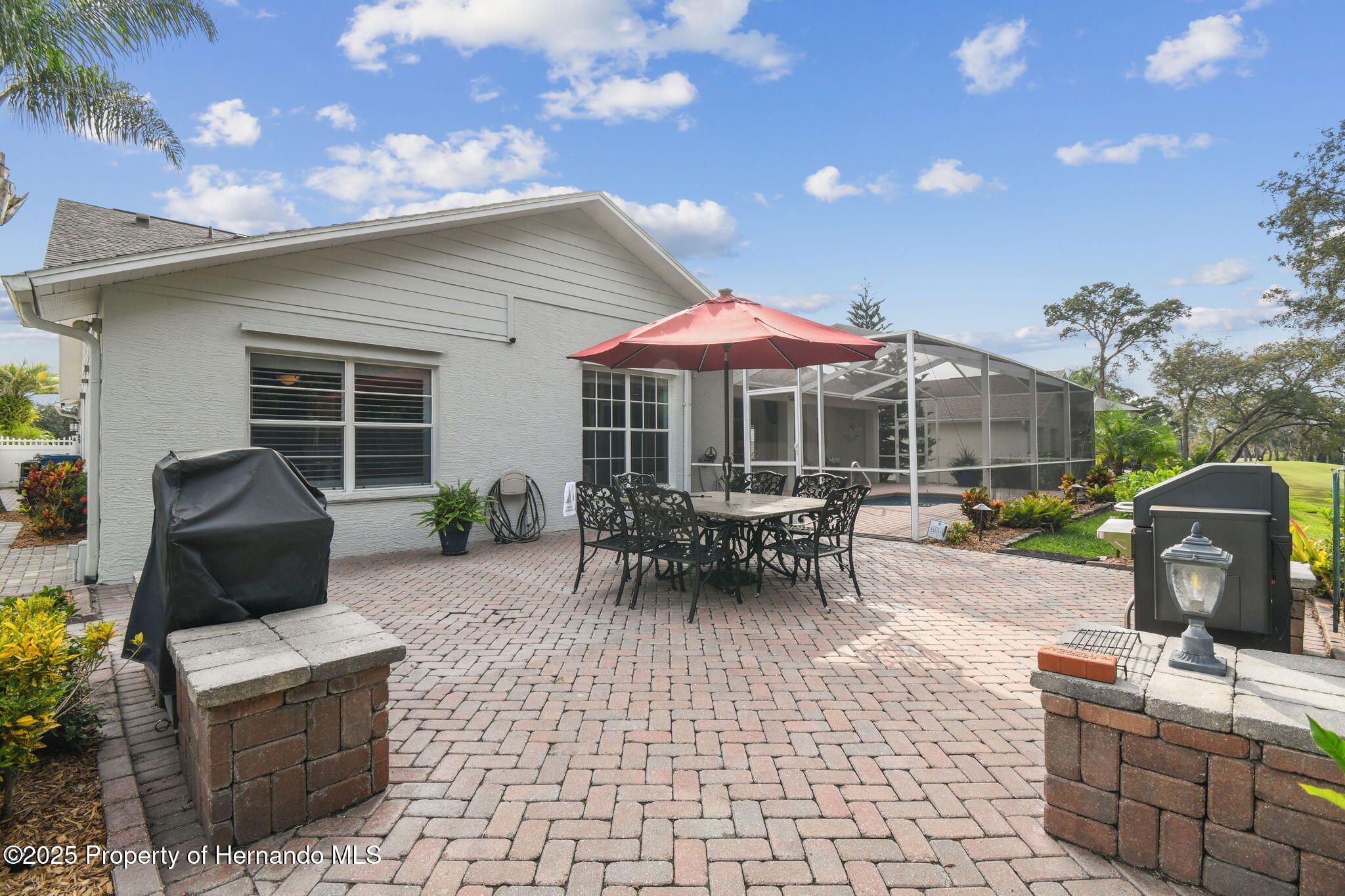 Active Under Contract. Welcome to Timber Pines, an award-winning, exclusive 55+ gated community. This GORGEOUS remodeled Kent III is TURN KEY. Upon entry, you'll be greeted by an open floor plan featuring a combined dining and living area with all new luxury vinyl floors and newly painted interior. This meticulously maintained three-bedroom, two and half bath is nestled among all new landscaping (volt lighting), sod and a new front palm tree. The space flows seamlessly into the Florida Room, offering scenic views of the private rear yard and lush greenery and a beautiful 1100 sq ft. covered Lanai, pool (spa) and half bath. The centrally located kitchen is bright and functional, with a separate pantry closet and ample storage in both newly painted upper and lower cabinets and back splash. Adjacent to the kitchen is a beautiful office with built in cabinets and desk with an additional pantry for your convenience. The generously sized primary suite overlooks the Lanai, pool and rear yard through tinted sliding glass doors, filling the space with natural light. The ensuite bath has a spacious shower, large garden tub, double sinks and bidet, and also an impressive double large walk-in closet completes the suite. The home has crown molding throughout, newer ceiling fans in spare rooms along with their own TV's. This home is being offered furnished and all appliances. Golf cart sold separately. Additional recent updates include; whole house water filtration system w/ UV light, softer, UV light in a maintained HVAC system with newly cleaned and sanitized vents, new can lights throughout home, new lighting fixtures, spa has been renovated and new tile, heater, plumbing. Interior and exterior have been painted with top-of-the-line Aura paint. Invisible fence with 2 collars. The roof has a life time transferable warranty. The three car garage area includes shelving, cabinets, floored attic which is ideal for seasonal decor and other essentials. Timber Pines offers an exceptional array of amenities: four golf courses, a country club, a newly remodeled restaurant and bar with multiple TV screens, two inviting pools, a fitness center, tennis and pickleball courts, bocce ball, a billiards room, and over 100 diverse clubs. HOA fees include Spectrum Cable with two boxes and high-speed internet, adding convenience to everyday living. Don't miss this opportunity to own a meticulously maintained and beautifully updated home with a private Lot in Timber Pines!!