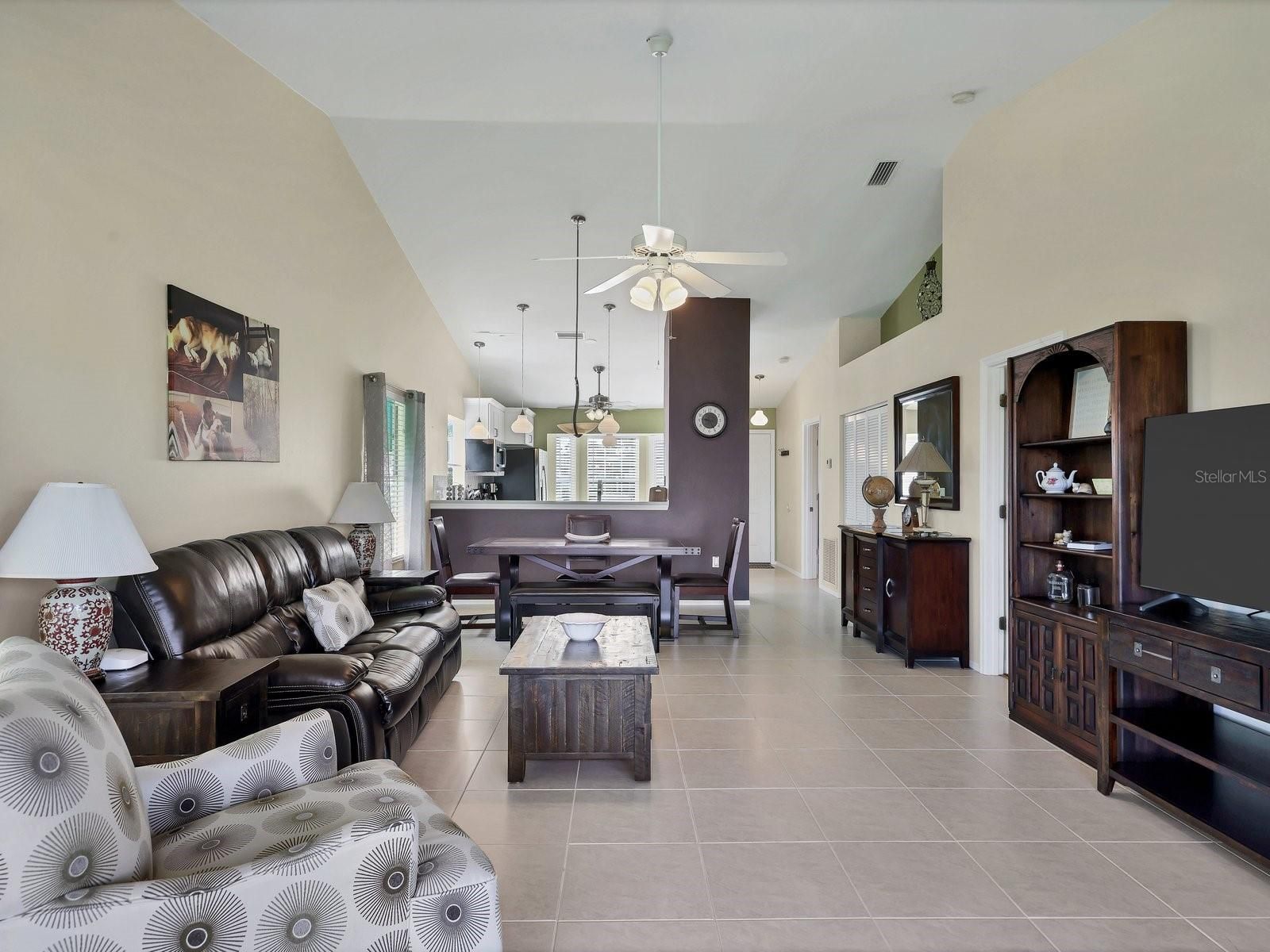 - Ceiling Fan(s), High Ceilings, Living/Dining Room, Open Floorplan, Main Level Primary, Solid Surface Counters, Solid-Wood Cabinets, Split Bedrooms, Thermostat, Vaulted Ceiling(s), Window Treatments