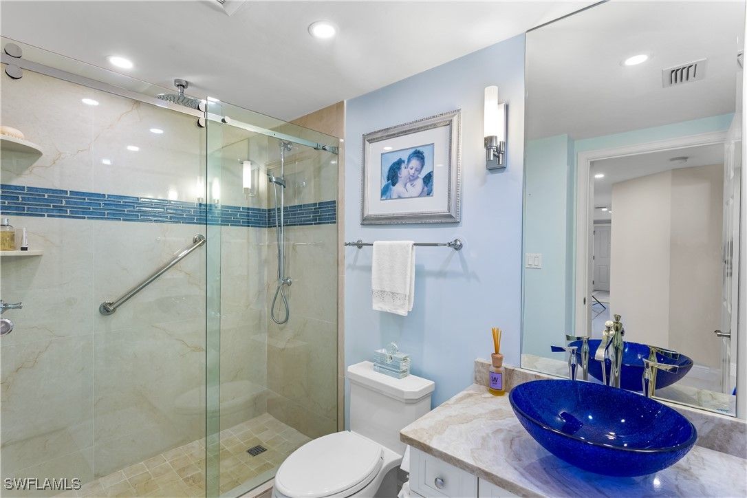 Welcome to Residence 19B at The Claridge – a sky-high sanctuary, designed for your most discerning buyers. Perched on the 19th floor, the moment you step in this reimagined 2-bedroom, 2-bath residence offering Stunning, Sweeping, Unobstructed Gulf views from the floor to ceiling glass! Direct Western Exposure as well as Beautiful Sunrise Bay views from the East...the best of both views! Enjoy spectacular Sunsets from the expansive 33-foot screened lanai (complete with electric storm shutters) and start your mornings with Sunrise Views from the open balcony off the kitchen. There are storm shutters or impact glass throughout the condo. Completely redesigned, this natural light-filled condo features elegant marble floors, a spacious open floor plan, Hunter Douglas shades throughout, Visual Comfort Crystal Signature Collection chandeliers in Master Bedroom, Dining Room, and 2 sconces in the Living Room. A few of the many upgrades include a newer fire alarm, water heater, garbage disposal, and electrical. The gourmet kitchen is a showstopper—crisp white cabinetry, glass cabinet fronts, beautiful stone countertops, under-cabinet lighting, recessed lighting, and a generous breakfast bar that flows seamlessly into the dining and living spaces, all with breathtaking east-to-west views. The Gulf-facing primary suite offers balcony access, a walk-in closet with auto on/off lighting feature, and a spa-inspired bath with dual sinks, a standalone soaking tub, Toto bidet, and a custom-tiled walk-in shower—your personal retreat after a day of sun and sand. The spacious guest bedroom is served by a beautifully updated full bath with a custom tile shower. The Claridge is a premier high-rise offering a welcoming lobby, on-site management, a newly updated community room with kitchen, card rooms, fitness center, guest suites, and a resort-style pool and spa. Located directly on the Pelican Bay berm, residents enjoy convenient tram access to the private beachfront pavilions. Pelican Bay Amenities (all included in your fees): ~Private beach access with beach attendants, chairs, umbrellas ~Beachfront indoor and outdoor restaurants ~Tennis and pickleball courts ~State-of-the-art fitness center ~Miles of walking and biking trails Location Highlights: Just minutes to Waterside Shops, Mercato, Venetian Village, Whole Foods, Artis—Naples, and a short drive to downtown Olde Naples. Only 30 minutes to the airport. Whether you're looking for a full-time residence or seasonal escape, this is the perfect place to call home. Truly a must-see to appreciate the view, the finishes, and the lifestyle.