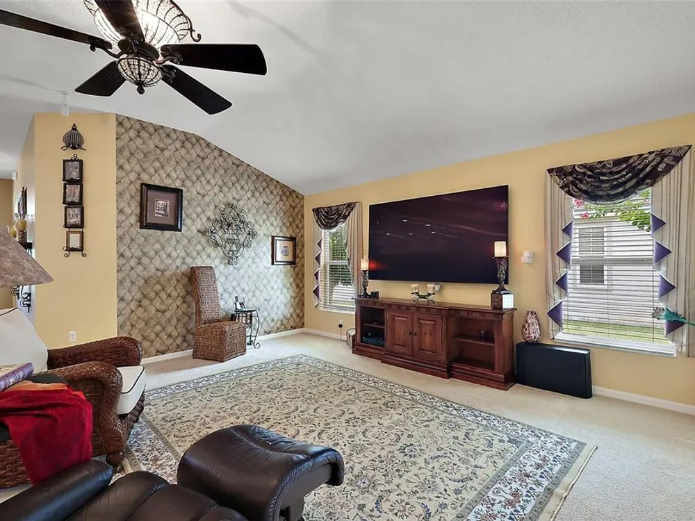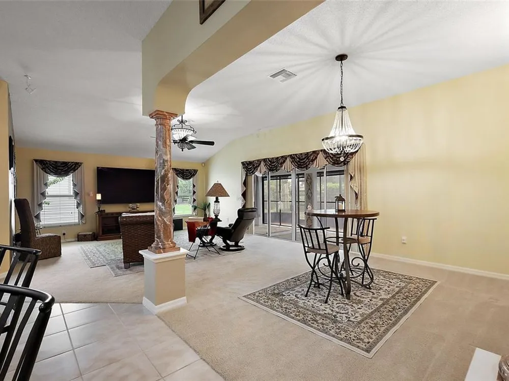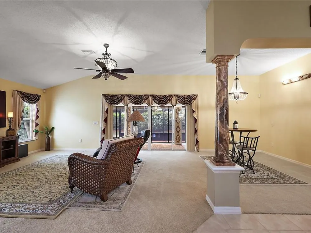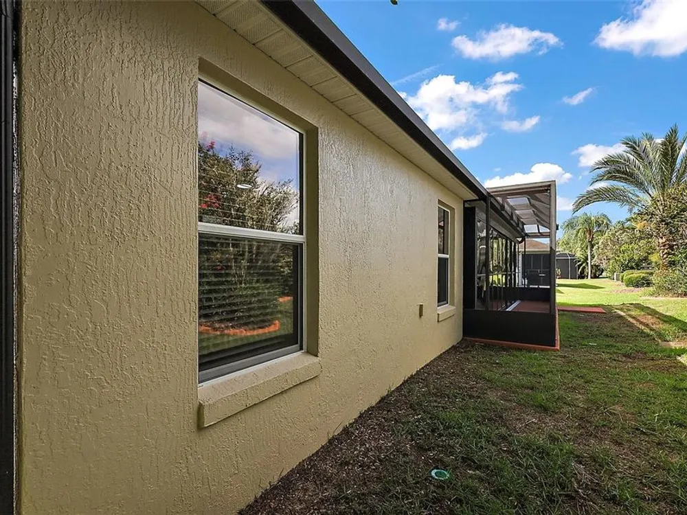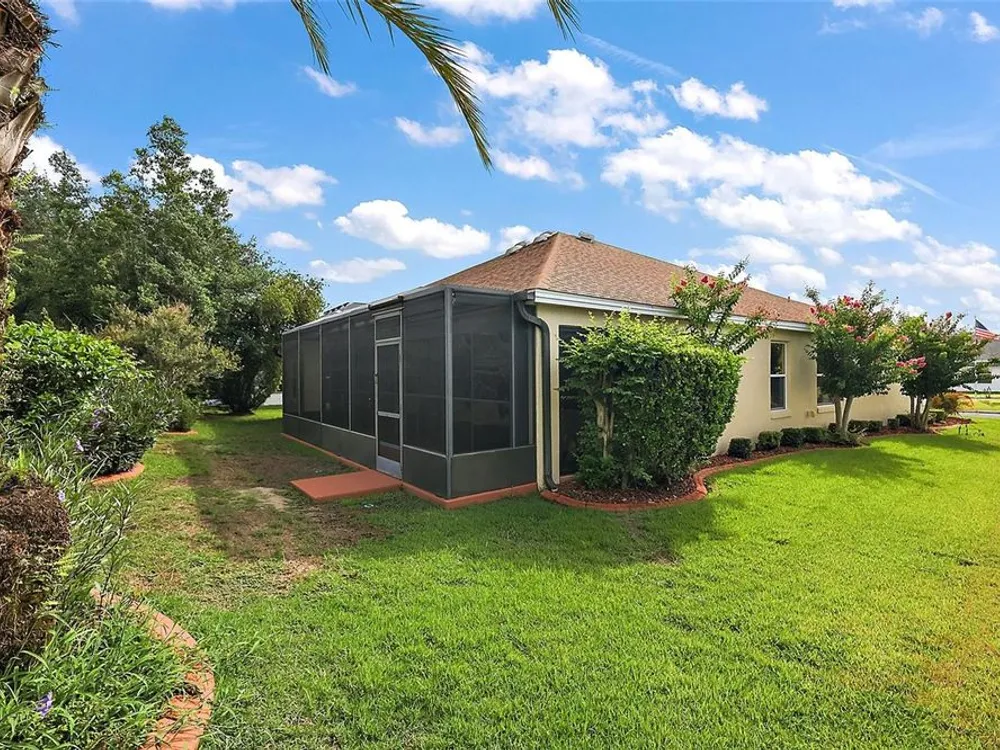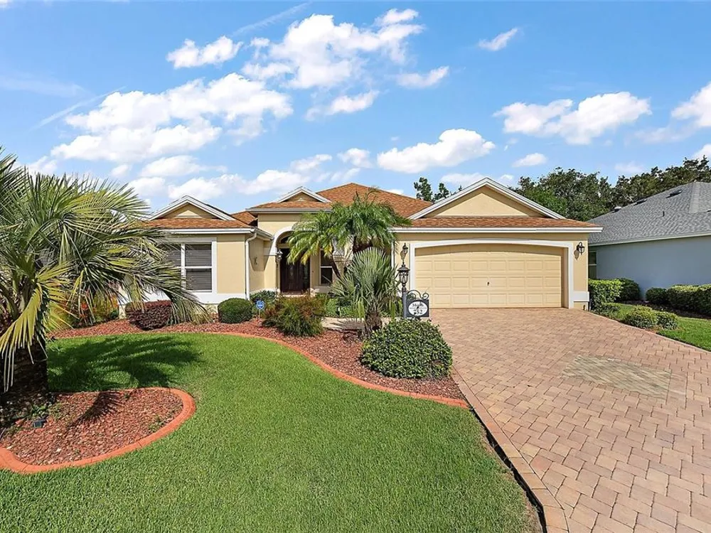 GORGEOUS, 3/2 BLOCK and STUCCO Gardenia featuring a FABULOUS ENCLOSED LANAI with MINI SPLIT, EXTENDED BIRDCAGE, and PRIVACY LANDSCAPING in the highly sought after village of Caroline! JUST MINUTES to Lake Sumter Landing! As you approach, the EXQUISITE exterior boasts PAVER drive and walk ways, MATURE TROPICAL landscaping with CURBED beds, and FRESH external PAINT(2024). Step through the ELEGANT WOOD front door with LEADED GLASS and an arched transom window, into the GENEROUS foyer featuring HIGH ceilings and TILE flooring. The MAGNIFICENT kitchen is truly a chef’s delight, boasting RICH CHERRY cabinetry, GRANITE countertops, STAINLESS STEEL appliances, built-in PANTRY, EAT-IN breakfast bar, and TILE flooring. The adjacent dinette offers ample NATURAL LIGHT with double windows and large arched transoms. The OPEN CONCEPT floor plan and HIGH VAULTED CEILINGS of the living and dining rooms creates a SPACIOUS and VOLUMINOUS main living area. OPULENT columns grace the dining room. A DOUBLE set of sliding glass doors, from the living room, lead you into the FABULOUS ENCLOSED LANAI with MINI SPLIT, EXTENDED BIRDCAGE, and PRIVACY LANDSCAPING! This FANTASTIC room offers a PLETHORA of FULL PANEL SLIDING DOORS that can easily be opened on cooler days to enjoy the fresh Florida air or remain closed to provide an ADDITIONAL 252sf of LIVING AREA! This SPACIOUS RETREAT is perfect for everything from RELAXING with your morning coffee to ENTERTAINING friends and family - truly an entertainer’s dream and a PRIVATE sanctuary all in one! Back inside, retreat to your luxurious primary suite, boasting HIGH VAULTED ceilings, TWO WALK-IN closets, and sliding glass doors that open to the ENCLOSED LANAI. It’s ensuite bathroom features CHERRY cabinetry, DOUBLE sinks, MAKE-UP vanity, GLASS-ENCLOSED WALK-IN shower with TILE finishes, and a LARGE LINEN closet. A SPLIT FLOOR PLAN, places two additional bedrooms and second bathroom near the front of the house, creating a PRIVATE GUEST WING or QUIET home office area. Bedroom two offers a built-in closet. The second bathroom features TILE floors, CHERRY vanity, TILED tub and shower combination, and a hallway LINEN closet. The third bedroom (no closet) would make a wonderful home office or additional sleeping area. The CENTRALLY LOCATED INTERIOR LAUNDRY ROOM offers WHITE cabinets for additional STORAGE needs, a utility sink, and TILE floors. It leads you into the two-car garage with INTER-LOCKING TILE floors, attic access with stairs, and TRIPLE layered wall shelving for an ABUNDANCE of extra STORAGE! DON’T MISS YOUR OPPORTUNITY to make this GORGEOUS HOME YOUR OWN! The Village of Caroline offers an UNBEATABLE LOCATION - ONLY MINUTES from Lake Sumter Landing - where you’ll find an array of shopping, dining, and nightly entertainment! You’ll also be close to Mallory Hill and Arnold Palmer Country Clubs and Championship Golf Courses. Health enthusiasts will love the proximity to the Lake Miona Regional Recreation Center and Fitness Trail. Also nearby to Coconut Cove Recreation Center; Caroline Neighborhood Pool; additional recreation centers, golf, pickle ball, swimming pools, and more! This home truly is a gem, located in one of the most desirable neighborhoods in The Villages! PLEASE WATCH OUR WALKTHROUGH VIDEO of this AMAZING HOME in a FABULOUS LOCATION and call today to schedule your Private Showing or Virtual Tour!