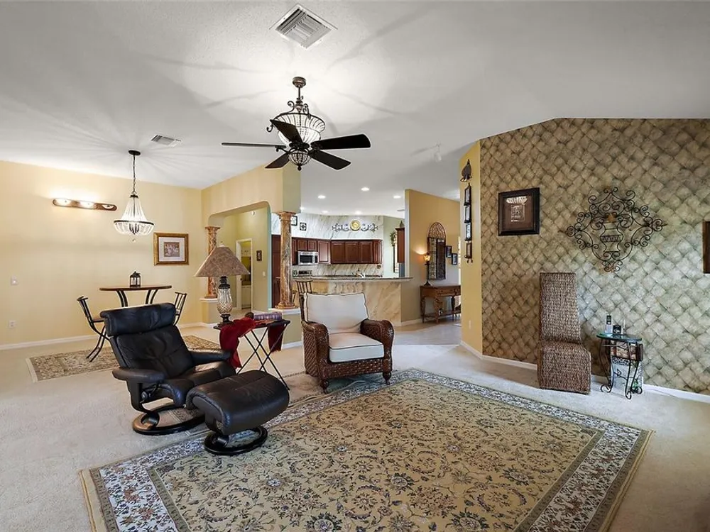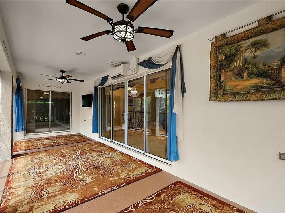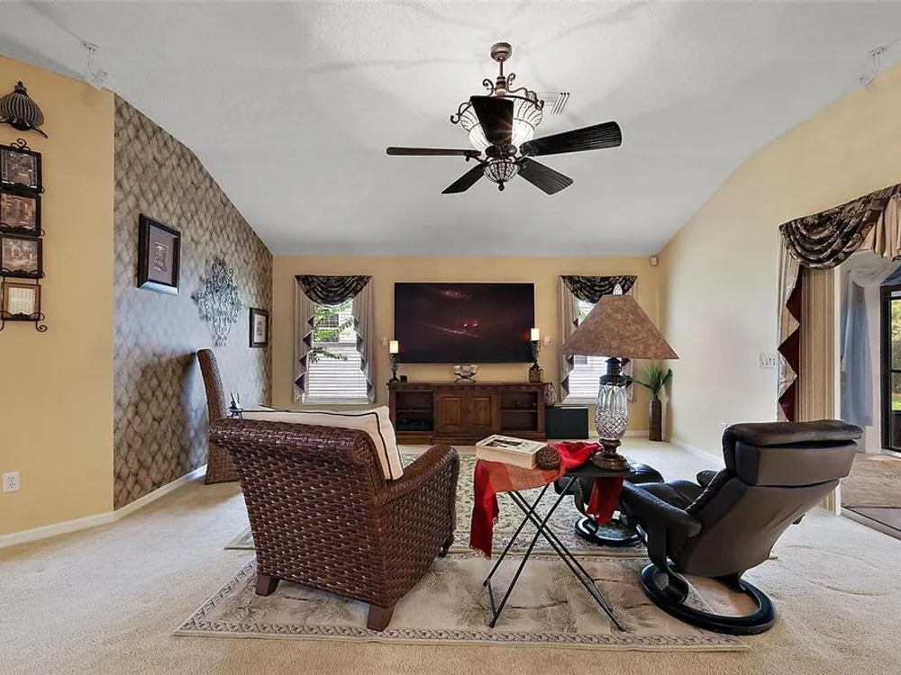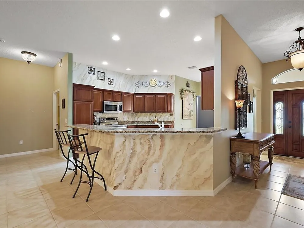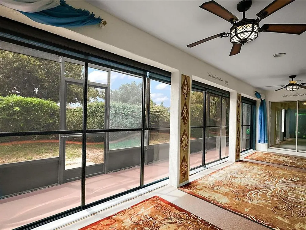 GORGEOUS, 3/2 BLOCK and STUCCO Gardenia featuring a FABULOUS ENCLOSED LANAI with MINI SPLIT, EXTENDED BIRDCAGE, and PRIVACY LANDSCAPING in the highly sought after village of Caroline! JUST MINUTES to Lake Sumter Landing! As you approach, the EXQUISITE exterior boasts PAVER drive and walk ways, MATURE TROPICAL landscaping with CURBED beds, and FRESH external PAINT(2024). Step through the ELEGANT WOOD front door with LEADED GLASS and an arched transom window, into the GENEROUS foyer featuring HIGH ceilings and TILE flooring. The MAGNIFICENT kitchen is truly a chef’s delight, boasting RICH CHERRY cabinetry, GRANITE countertops, STAINLESS STEEL appliances, built-in PANTRY, EAT-IN breakfast bar, and TILE flooring. The adjacent dinette offers ample NATURAL LIGHT with double windows and large arched transoms. The OPEN CONCEPT floor plan and HIGH VAULTED CEILINGS of the living and dining rooms creates a SPACIOUS and VOLUMINOUS main living area. OPULENT columns grace the dining room. A DOUBLE set of sliding glass doors, from the living room, lead you into the FABULOUS ENCLOSED LANAI with MINI SPLIT, EXTENDED BIRDCAGE, and PRIVACY LANDSCAPING! This FANTASTIC room offers a PLETHORA of FULL PANEL SLIDING DOORS that can easily be opened on cooler days to enjoy the fresh Florida air or remain closed to provide an ADDITIONAL 252sf of LIVING AREA! This SPACIOUS RETREAT is perfect for everything from RELAXING with your morning coffee to ENTERTAINING friends and family - truly an entertainer’s dream and a PRIVATE sanctuary all in one! Back inside, retreat to your luxurious primary suite, boasting HIGH VAULTED ceilings, TWO WALK-IN closets, and sliding glass doors that open to the ENCLOSED LANAI. It’s ensuite bathroom features CHERRY cabinetry, DOUBLE sinks, MAKE-UP vanity, GLASS-ENCLOSED WALK-IN shower with TILE finishes, and a LARGE LINEN closet. A SPLIT FLOOR PLAN, places two additional bedrooms and second bathroom near the front of the house, creating a PRIVATE GUEST WING or QUIET home office area. Bedroom two offers a built-in closet. The second bathroom features TILE floors, CHERRY vanity, TILED tub and shower combination, and a hallway LINEN closet. The third bedroom (no closet) would make a wonderful home office or additional sleeping area. The CENTRALLY LOCATED INTERIOR LAUNDRY ROOM offers WHITE cabinets for additional STORAGE needs, a utility sink, and TILE floors. It leads you into the two-car garage with INTER-LOCKING TILE floors, attic access with stairs, and TRIPLE layered wall shelving for an ABUNDANCE of extra STORAGE! DON’T MISS YOUR OPPORTUNITY to make this GORGEOUS HOME YOUR OWN! The Village of Caroline offers an UNBEATABLE LOCATION - ONLY MINUTES from Lake Sumter Landing - where you’ll find an array of shopping, dining, and nightly entertainment! You’ll also be close to Mallory Hill and Arnold Palmer Country Clubs and Championship Golf Courses. Health enthusiasts will love the proximity to the Lake Miona Regional Recreation Center and Fitness Trail. Also nearby to Coconut Cove Recreation Center; Caroline Neighborhood Pool; additional recreation centers, golf, pickle ball, swimming pools, and more! This home truly is a gem, located in one of the most desirable neighborhoods in The Villages! PLEASE WATCH OUR WALKTHROUGH VIDEO of this AMAZING HOME in a FABULOUS LOCATION and call today to schedule your Private Showing or Virtual Tour!