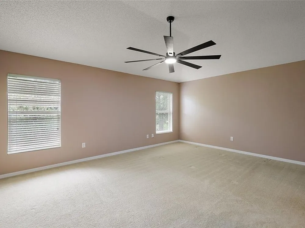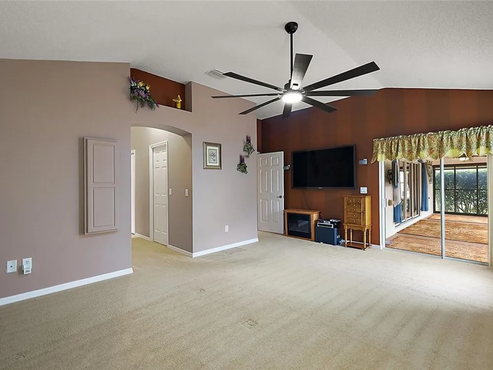 - Ceiling Fan(s), Eat-in Kitchen, High Ceilings, Living/Dining Room, Open Floorplan, Main Level Primary, Split Bedrooms, Stone Counters, Vaulted Ceiling(s), Walk-In Closet(s)